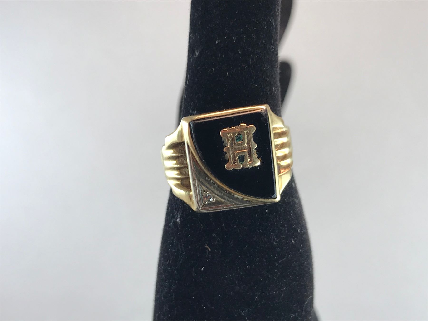 10K YELLOW GOLD MENS SIGNET RING, 1 SINGLE CUT DIAMOND & BLACK ONYX