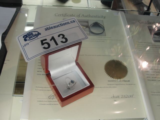 10KT WHITE GOLD, BLUE SAPPHIRE & DIAMOND RING. 2 DIAMONDS .60 CARATS. INCLUDES A $650.00 CERTIFICATE