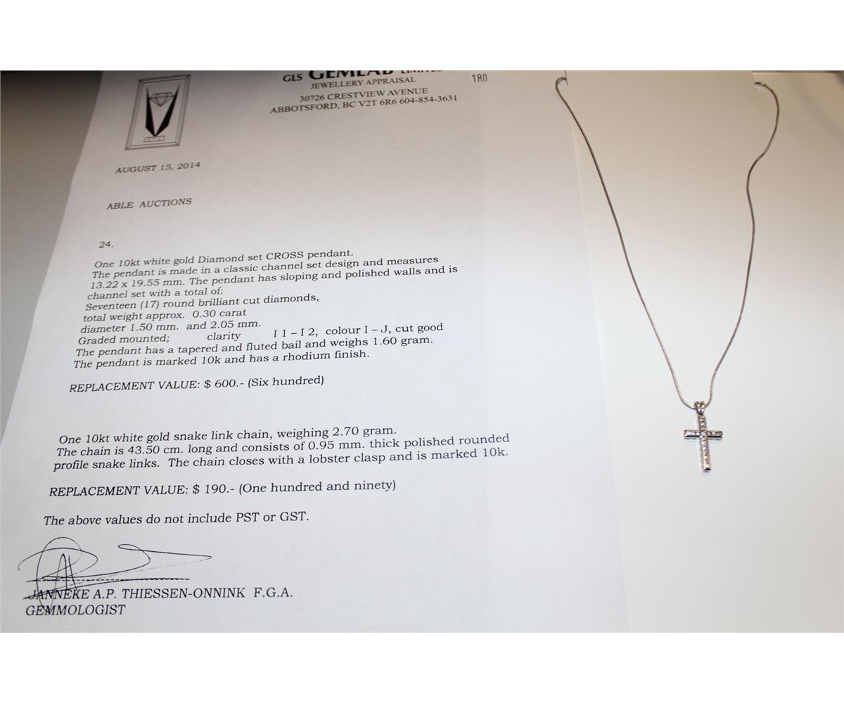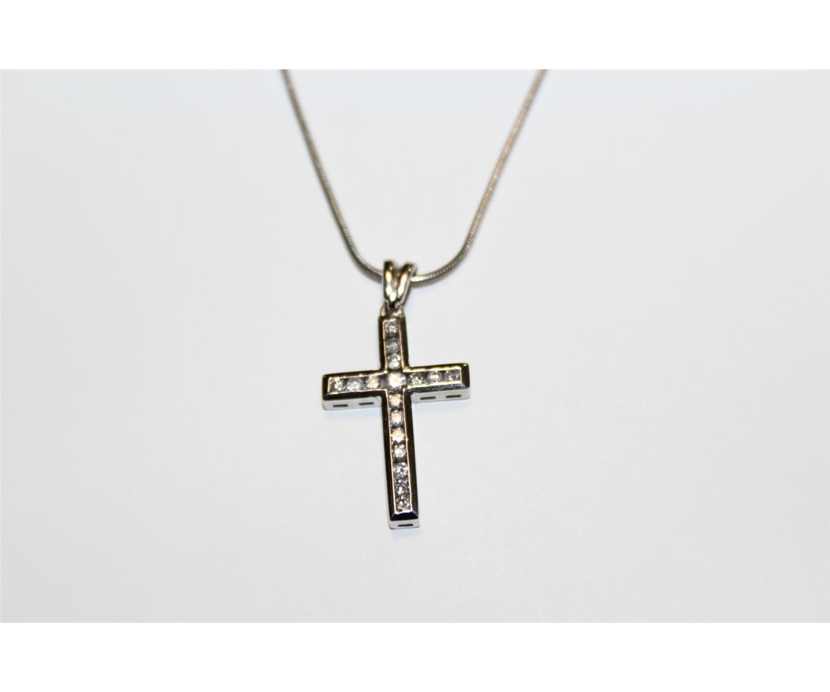 10KT. WHITE GOLD DIAMOND SET CROSS PENDANT CLASSIC CHANNEL SET WITH 17 ROUND BRILLIANT CUT DIAMONDS APPROX.  0.30 CARATS.  REPLACEMENT VALUE: $600.00 & 1 10KT. WHITE GOLD SNAKE LINK CHAIN 43.50 CM LONG, LOBSTER CLASP. REPLACEMENT VALUE: $190.00