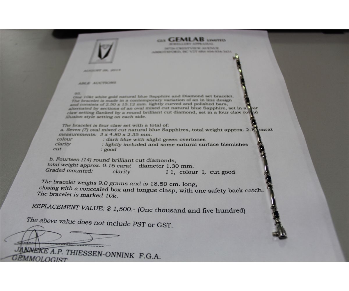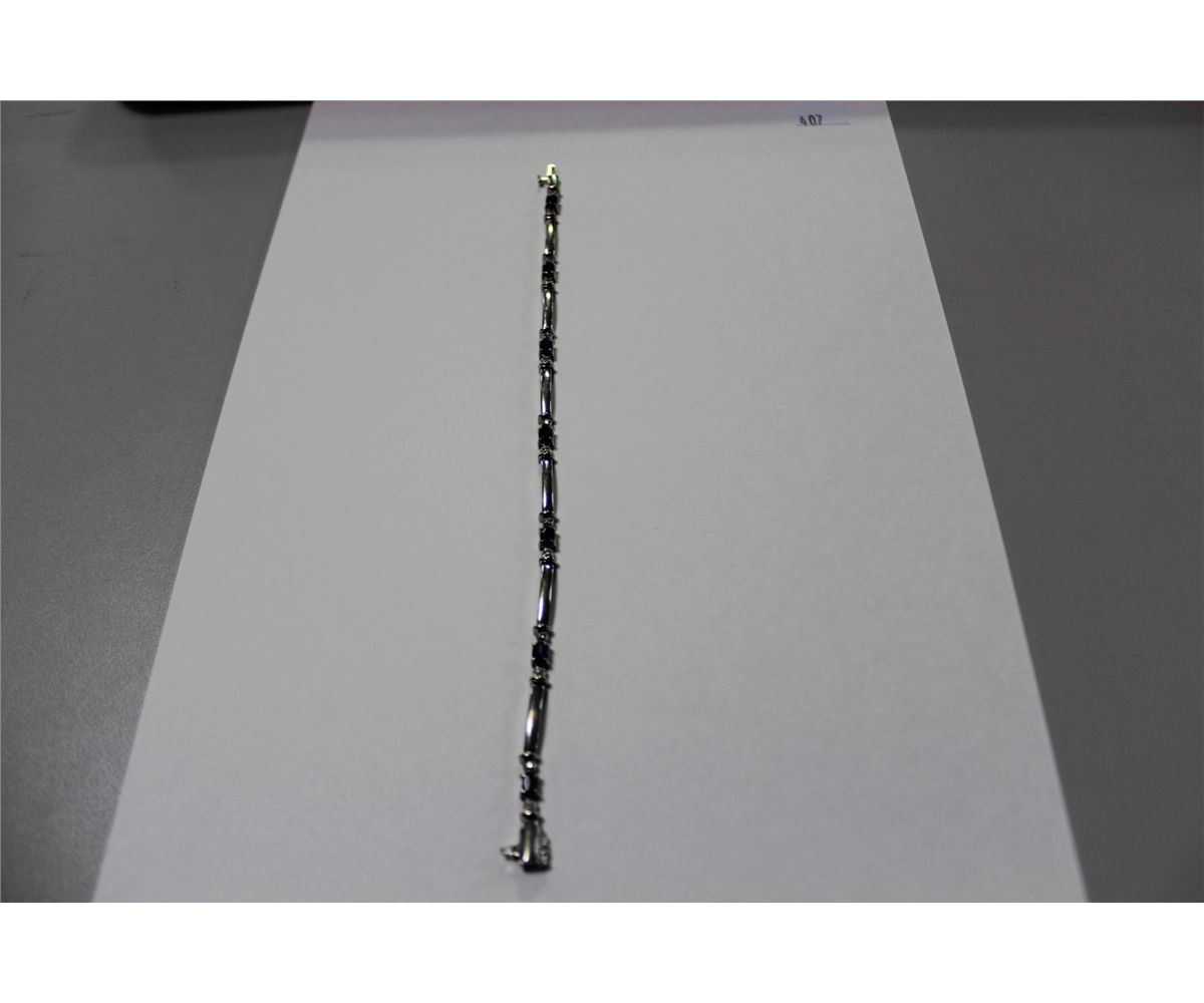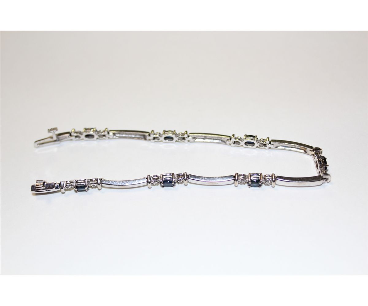 10KT. WHITE GOLD NATURAL BLUE SAPPHIRE & DIAMOND SET BRACELET. CLAW SET WITH 7 OVAL MIXED CUT NATURAL BLUE SAPPHIRES APPROX. 2.10 CARATS & 14 ROUND BRILLIANT CUT DIAMONDS APPROX. 0.16 CARATS. REPLACEMENT VALUE: $1500.00