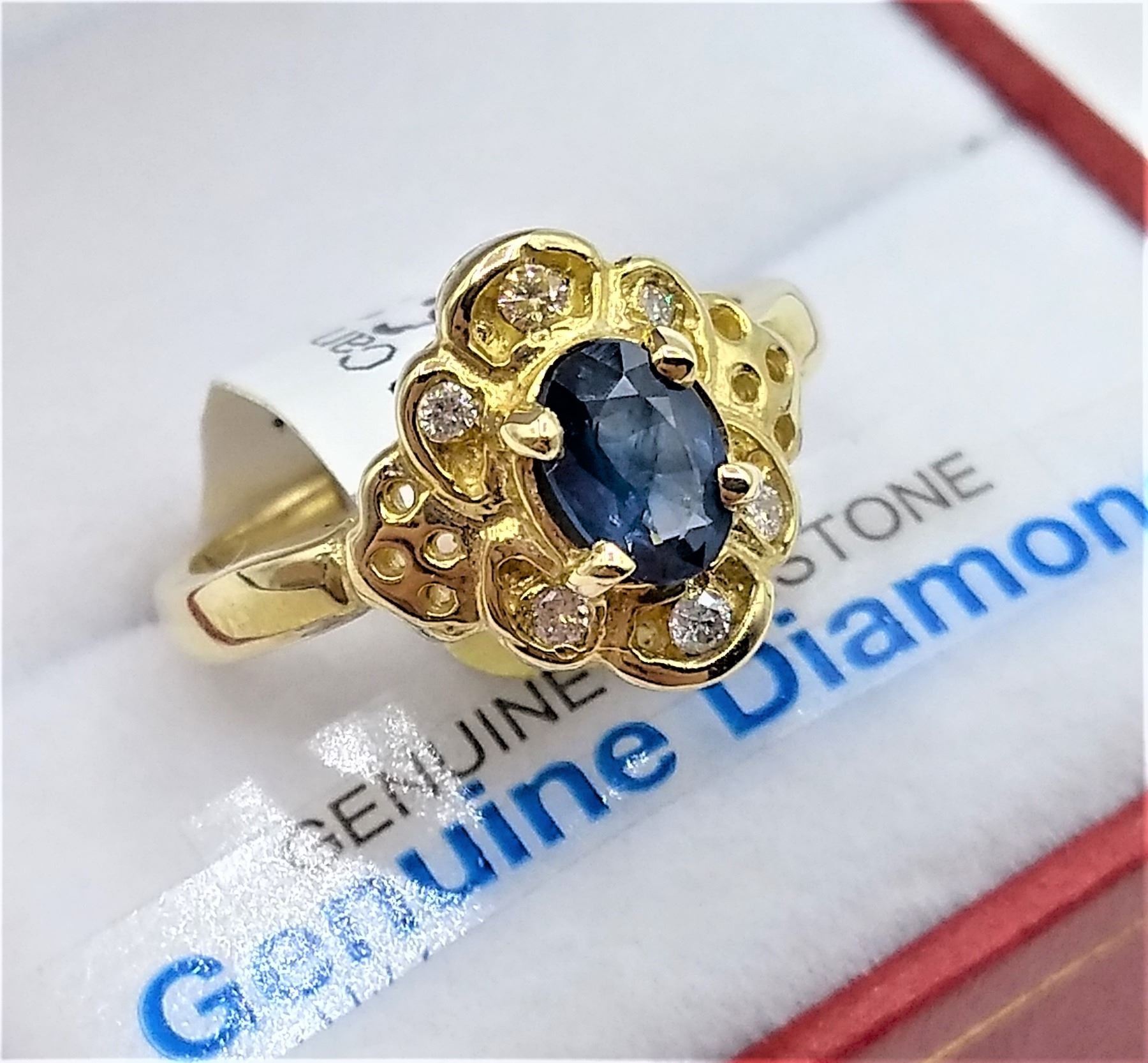 10KT. YELLOW GOLD 6MM X 4MM GENUINE BLUE SAPPHIRE (0.58CTS) & DIAMOND (0.06CTS) RING