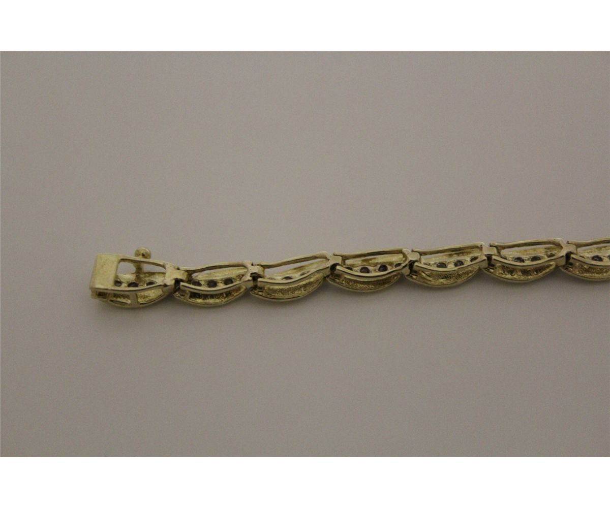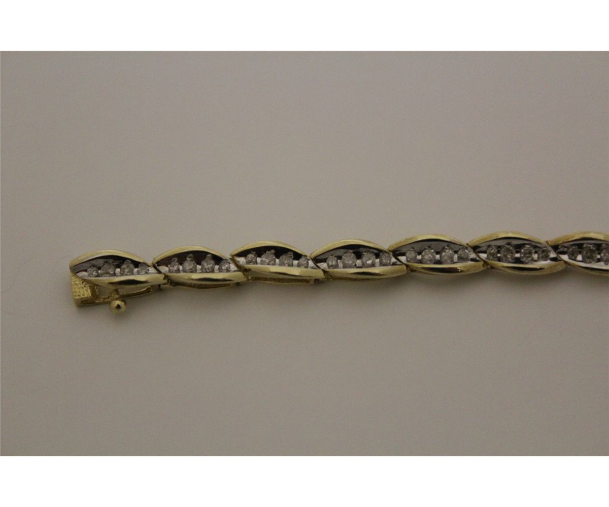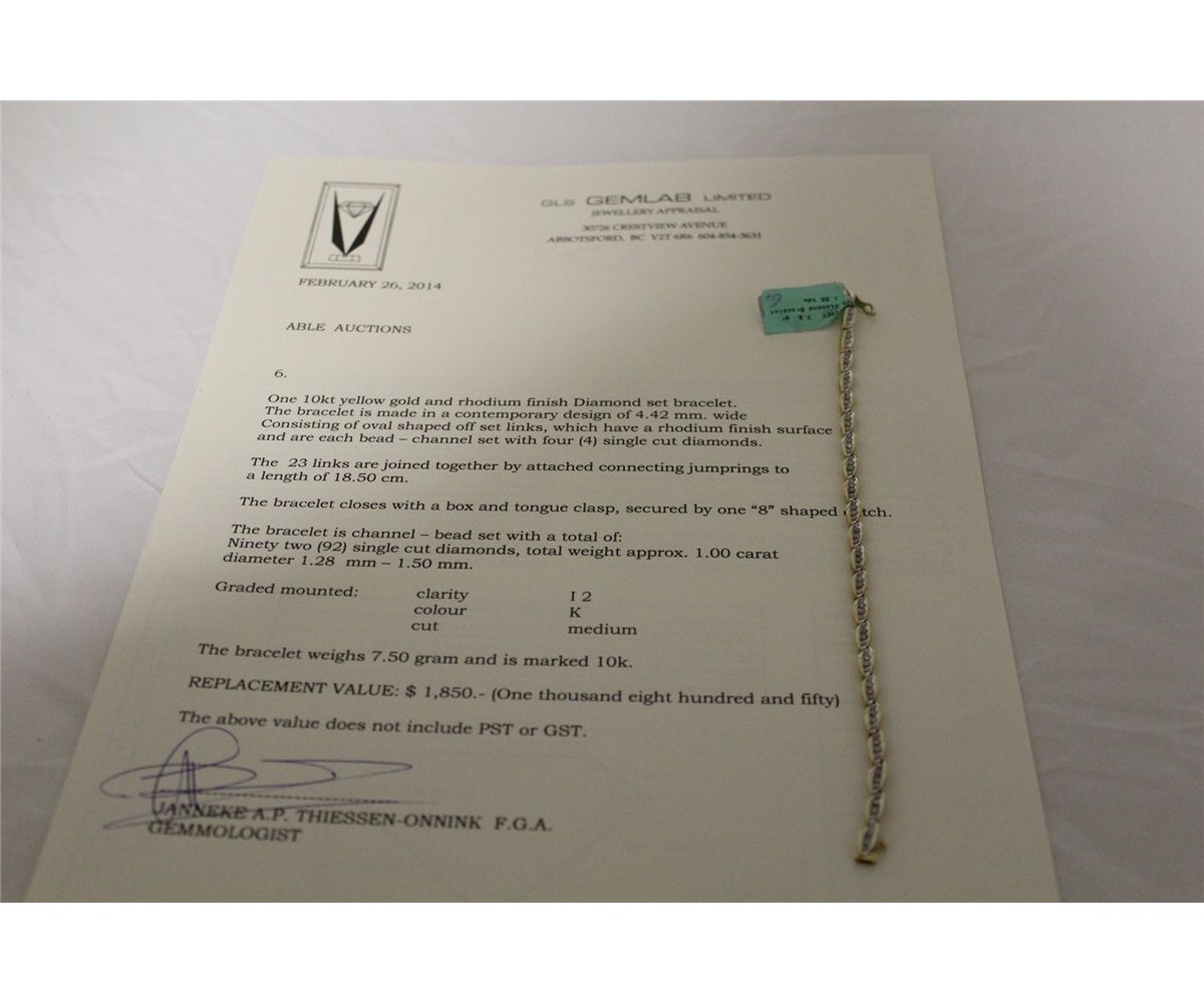 10KT. YELLOW GOLD AND RHODIUM FINISH DIAMOND SET BRACELET. THE BRACELET IS CHANNEL - BEAD SET WITH A TOTAL OF 92 SINGLE CUT DIAMONDS, TOTAL WEIGHT APPROX. 1.00 CARATS REPLACEMENT VALUE $1850.00