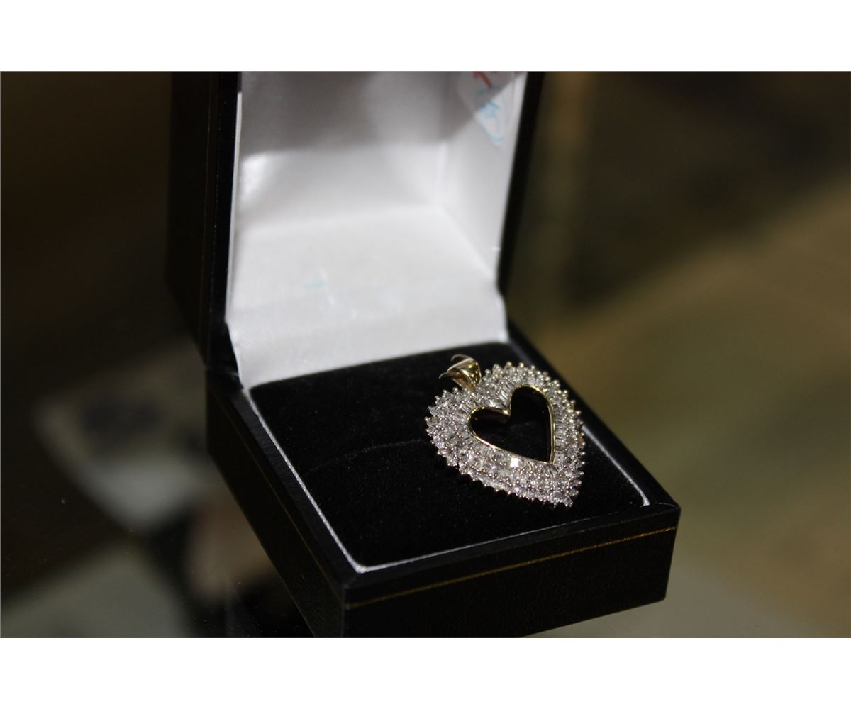 10KT YELLOW GOLD AND RHODIUM FINISH HEART SHAPED DIAMOND PENDANT WITH 42 TAPERED DIAMONDS, APPROX 0.35CARAT AND 78 SINGLE CUT DIAMONDS, APPROX 0.45CARAT REPLACEMENT VALUE $1015