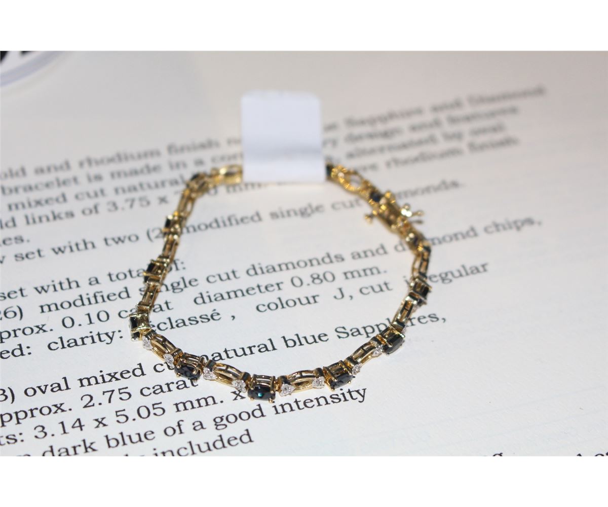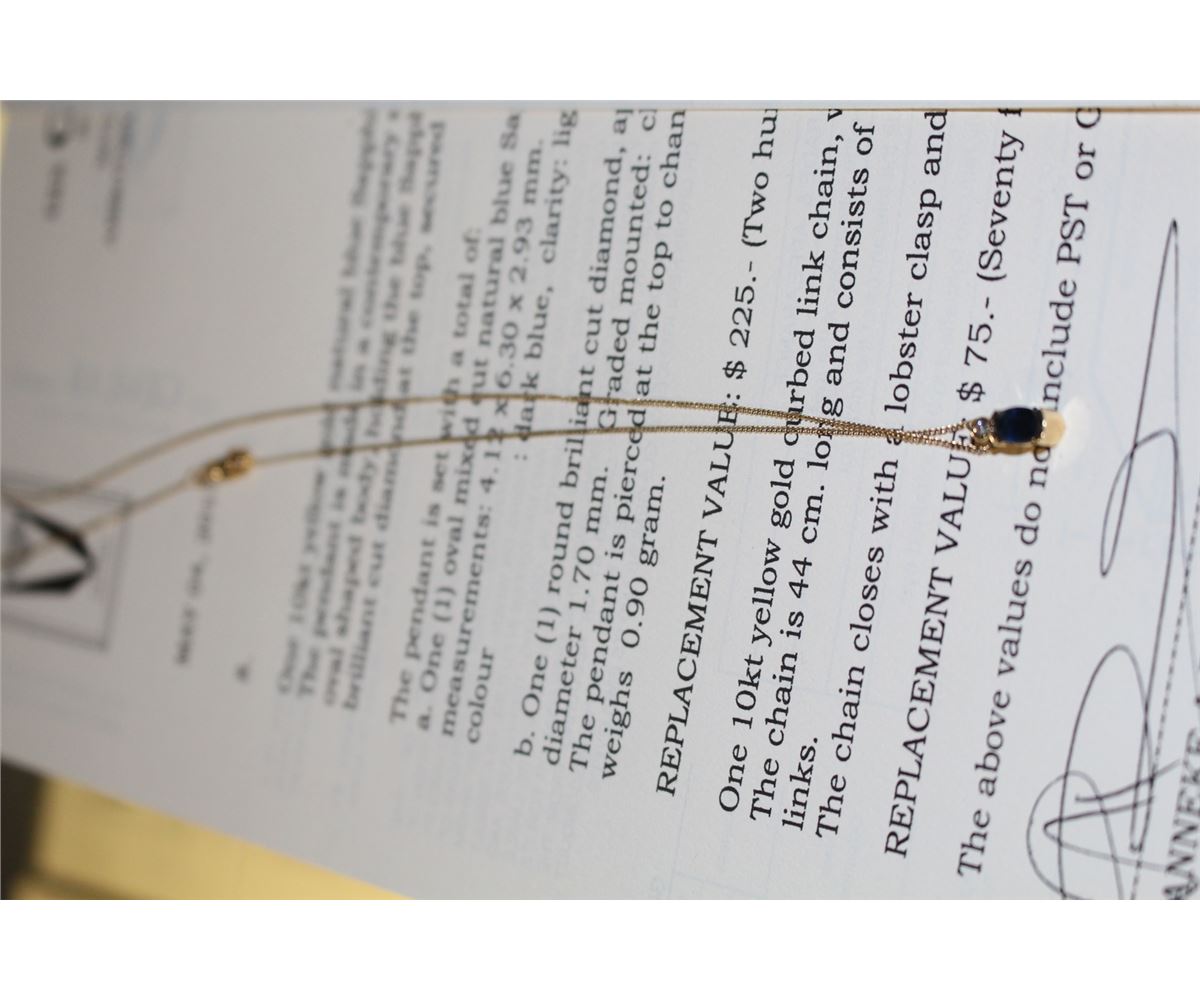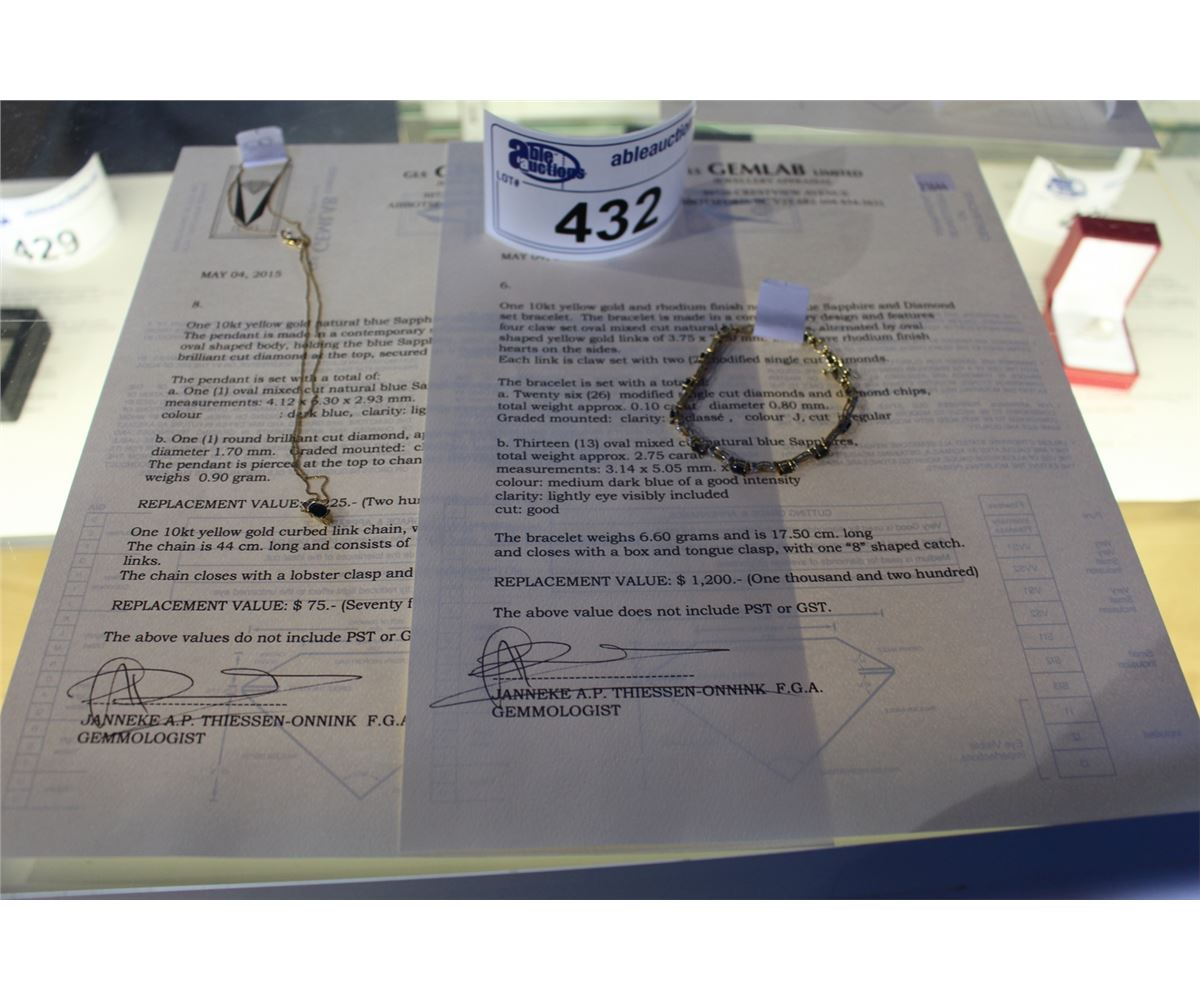 10KT YELLOW GOLD AND RHODIUM FINISH NATURAL BLUE SAPPHIRE AND DIAMOND BRACELET AND 10KT GOLD AND NATURAL BLUE SAPPHIRE AND DIAMOND SET PENDANT WITH GOLD CHAIN 26 DIAMONDS AND CHIPS APPROX 0.10CARAT AND 1 DIAMOND, APPROX 0.02CARAT REPLACEMENT VALUE $1275