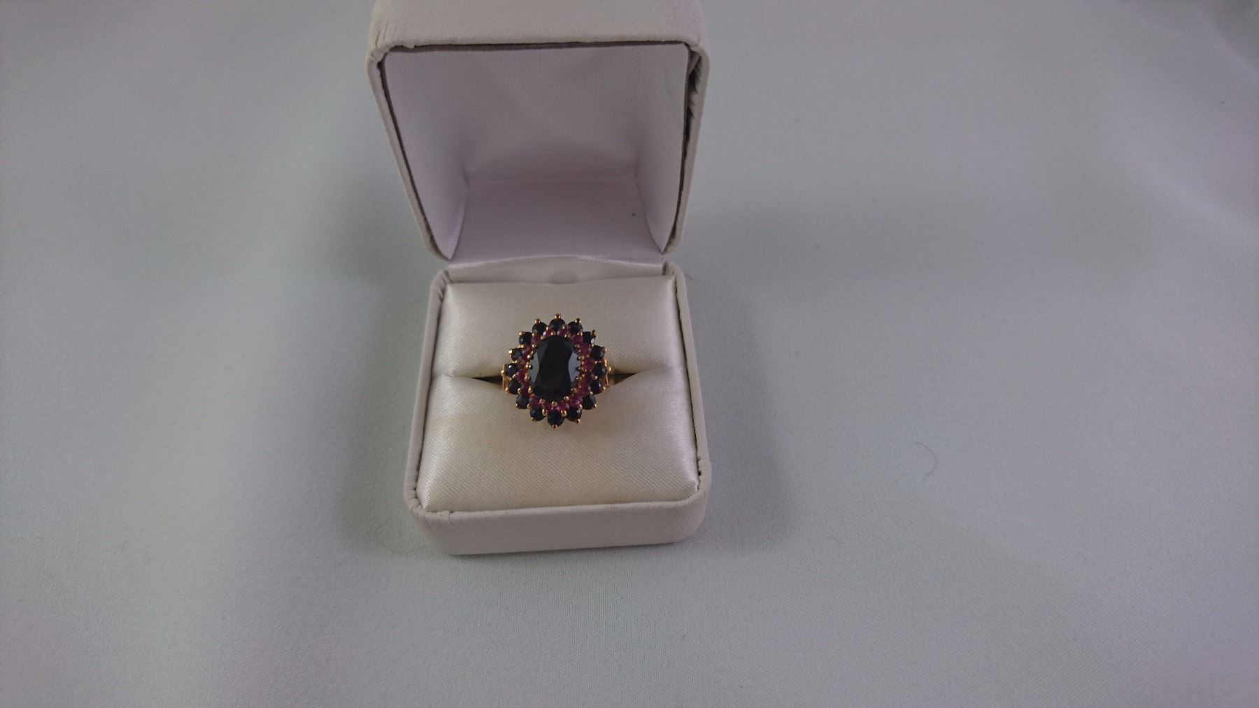 10KT YELLOW GOLD CLUSTER STYLE LADIES RING SET WITH OVAL DARK GREEN STONE, 16 SAPPHIRES , 16 RUBIES REPLACEMENT VALUE $550