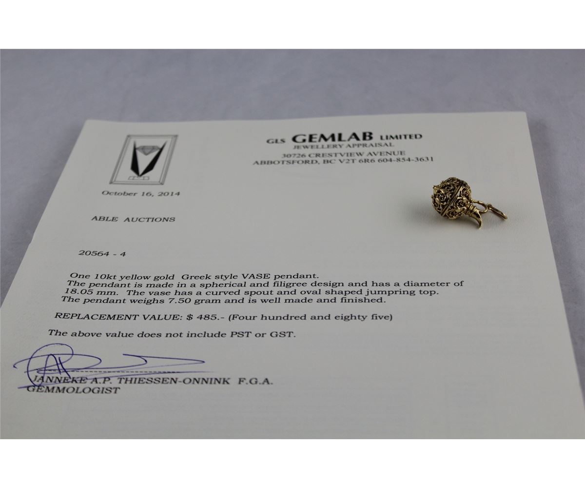 10KT YELLOW GOLD GREEK STYLE VASE PENDANT. REPLACEMENT VALUE:$485.00