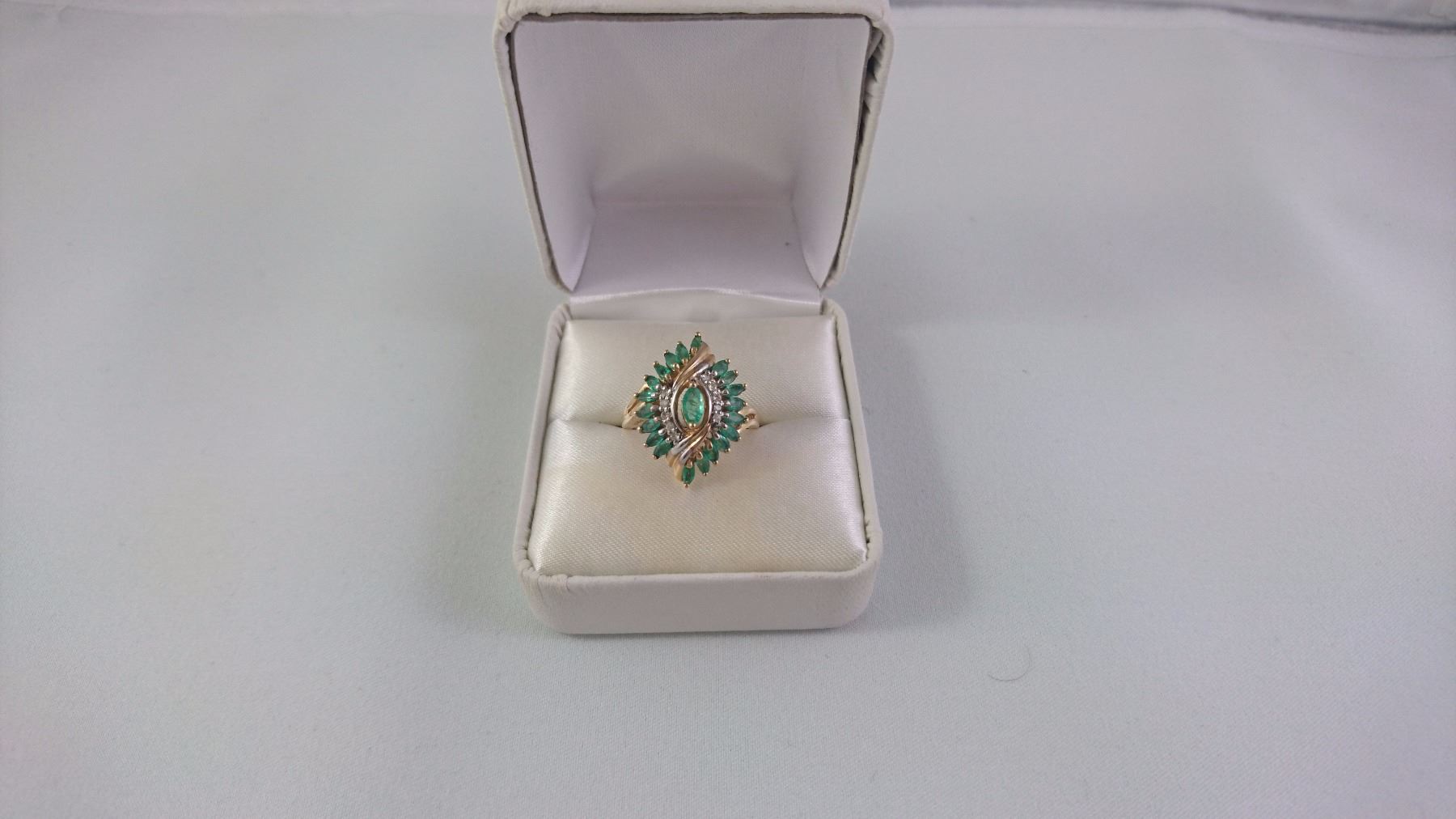 10KT YELLOW GOLD LADIES CLUSTER STYLE RING SET WITH 2 MARQUISE EMERALDS +10 SCD TW 4.4 GRAM REPLACEMENT VALUE $495