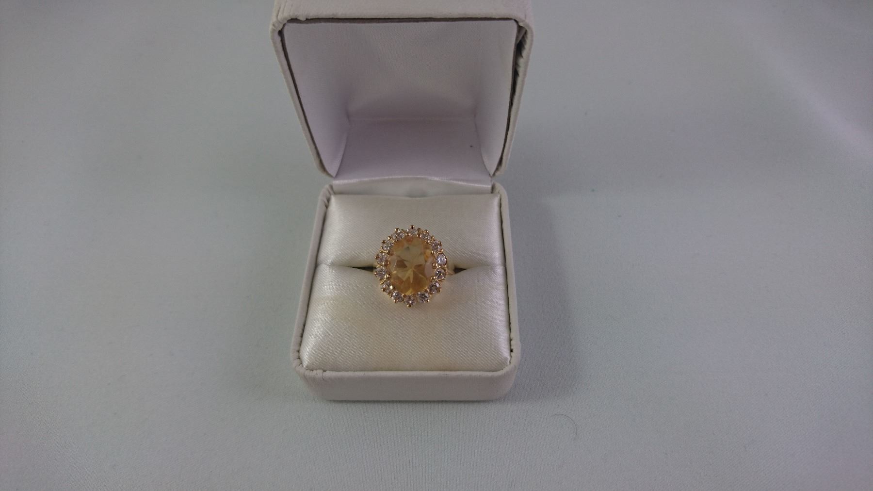 10KT YELLOW GOLD LADIES CLUSTER STYLE RING SET WITH ONE OVAL PROBABLE CITRINE + 14 WHITE STONES PROBABLE CZ REPLACEMENT VALUE $395