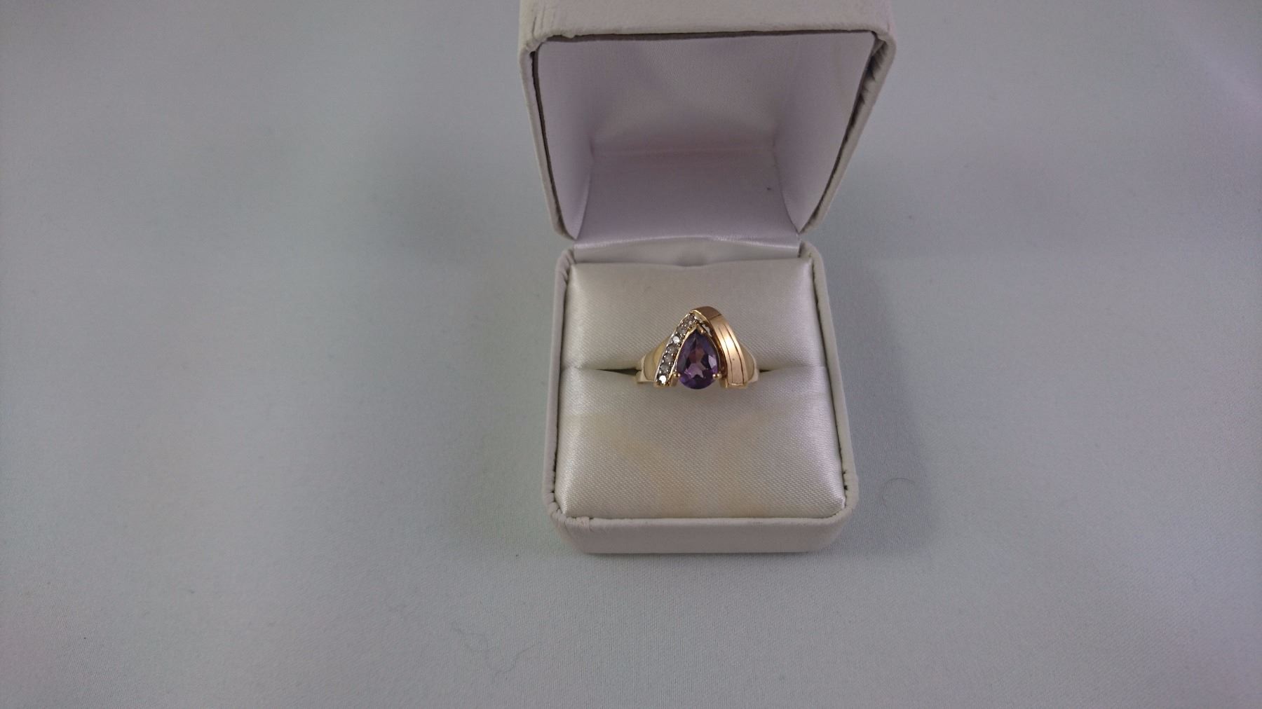 10KT YELLOW GOLD LADIES RING SET WITH ONE PEAR SHAPED PROBABLE AMETHYST + 7 BCD TW 3.8GRAM REPLACEMENT VALUE $450