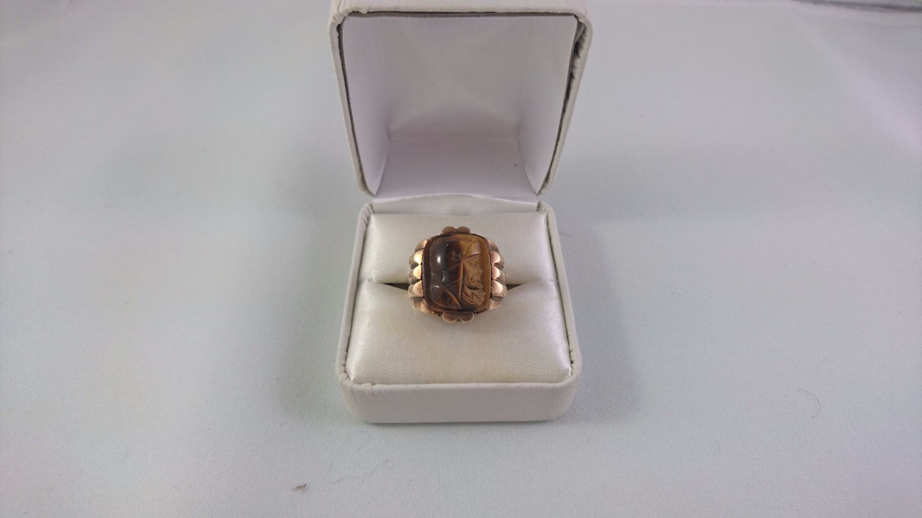 10KT YELLOW GOLD MENS RING SET WITH ONE RECTANGULAR TIGEREYE CAMEO (SOLDIER) REPLACEMENT VALUE $495