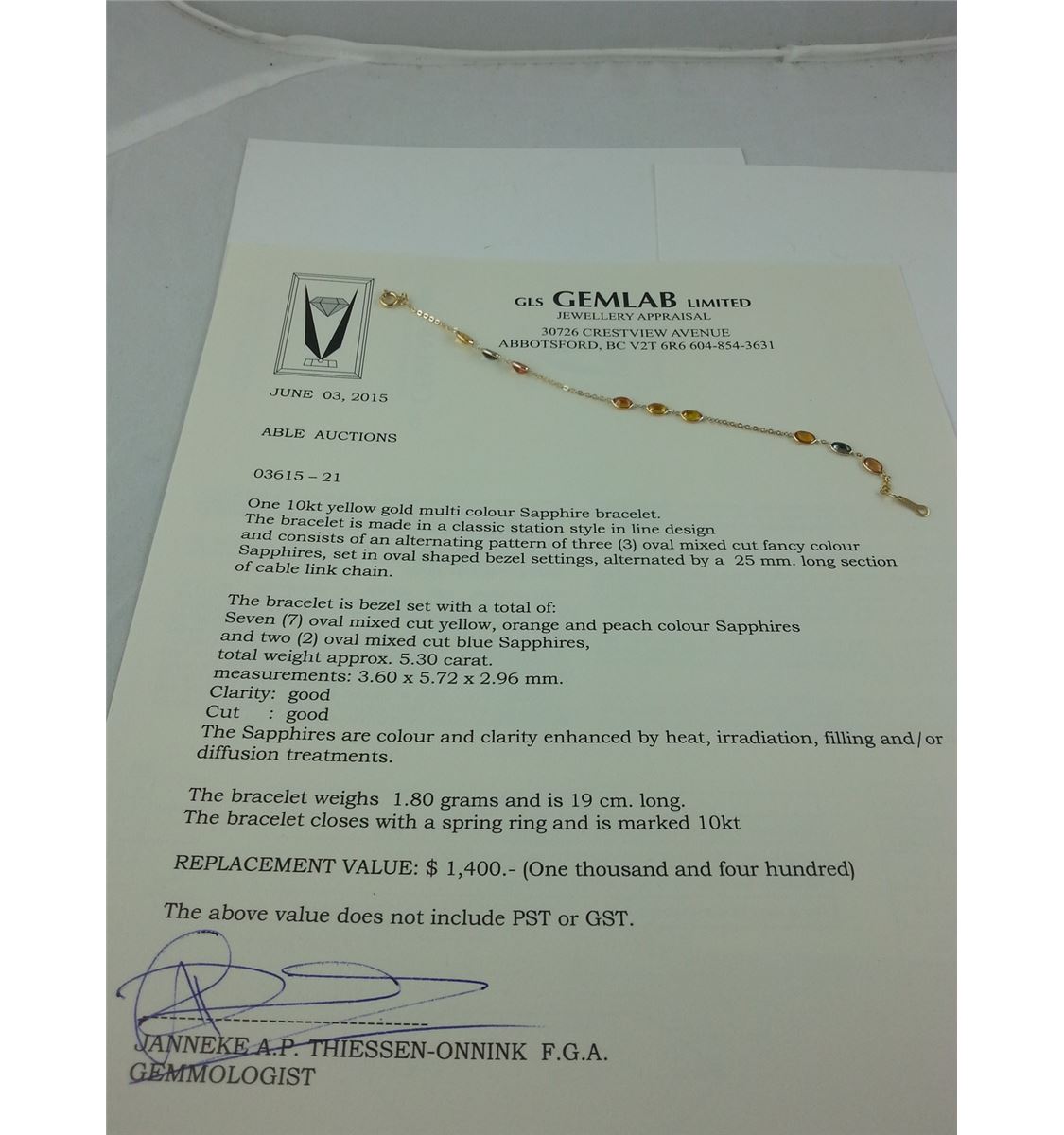 10KT YELLOW GOLD MULTI COLOUR SAPPHIRE BRACELET WITH 7 YELLOW, ORANGE AND PEACH COLOURED SAPPHIRES AND 2 BLUE SAPPHIRES, TOTAL WEIGHT APPROX 5.30CARAT REPLACEMENT VALUE $1400