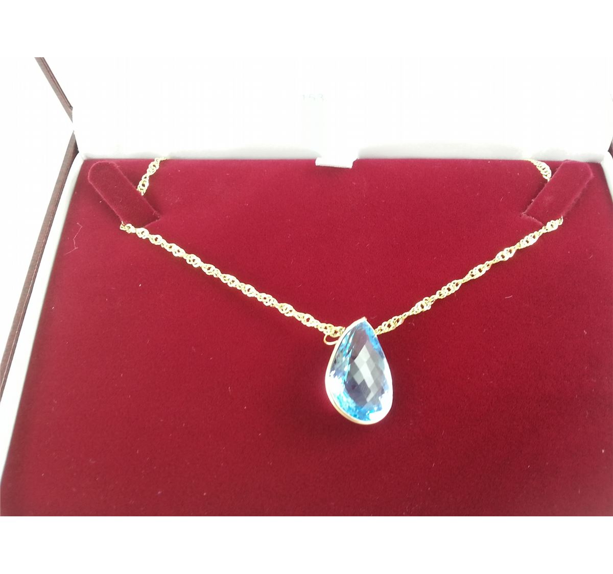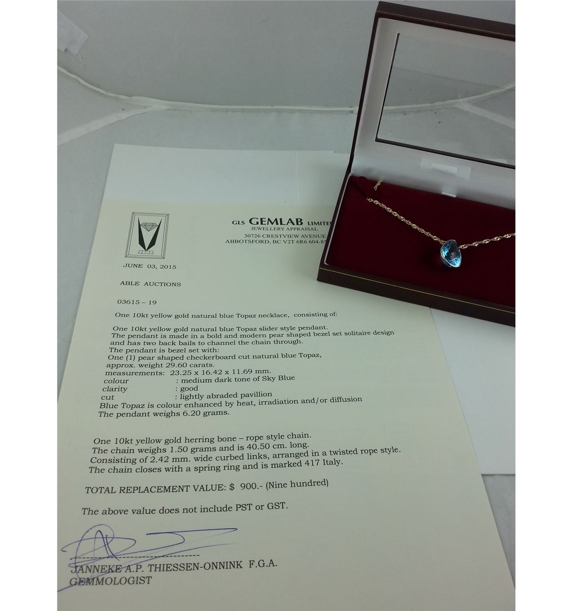10KT YELLOW GOLD NATURAL BLUE TOPAZ NECKLACE. PENDANT WITH 10KT YELLOW GOLD HERRING BONE-ROPE STYLE CHAIN. HAS ONE TOPAZ, APPROX 29.60CARATS REPLACEMENT VALUE $900