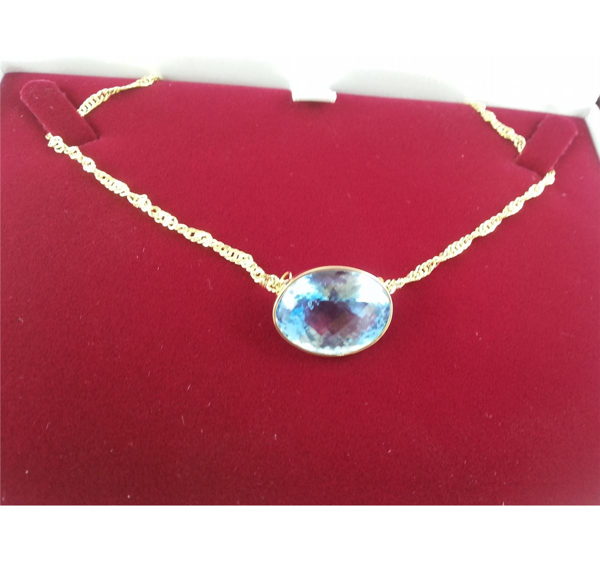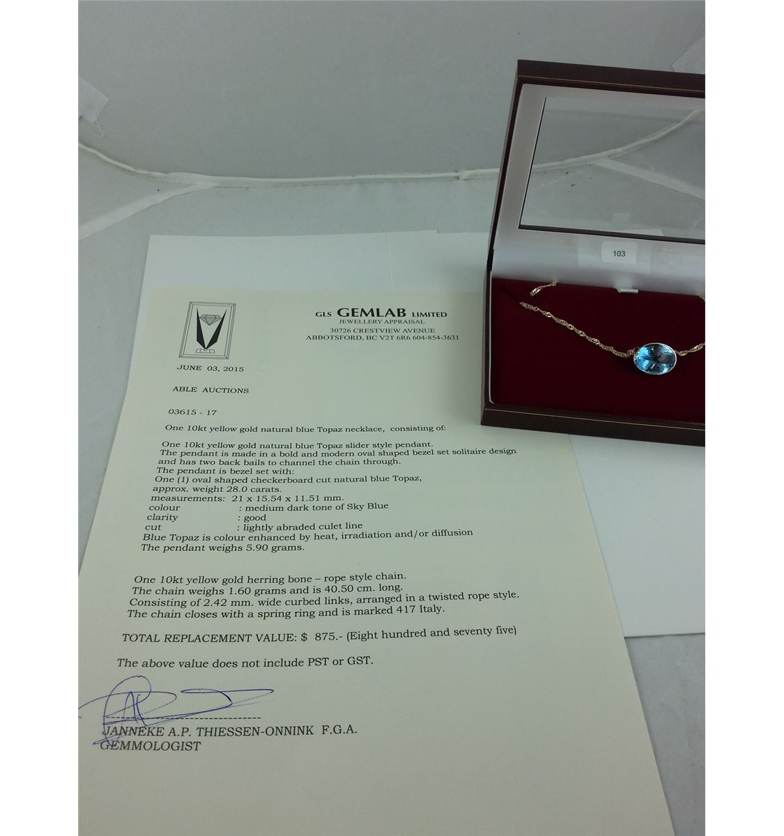 10KT YELLOW GOLD NATURAL BLUE TOPAZ NECKLACE WITH PENDANT AND 10KT YELLOW GOLD HERRING BONE - ROPE STYLE CHAIN. PENDANT SET WITH ONE TOPAZ, APPROX 28.0CARATS REPLACEMENT VALUE $875