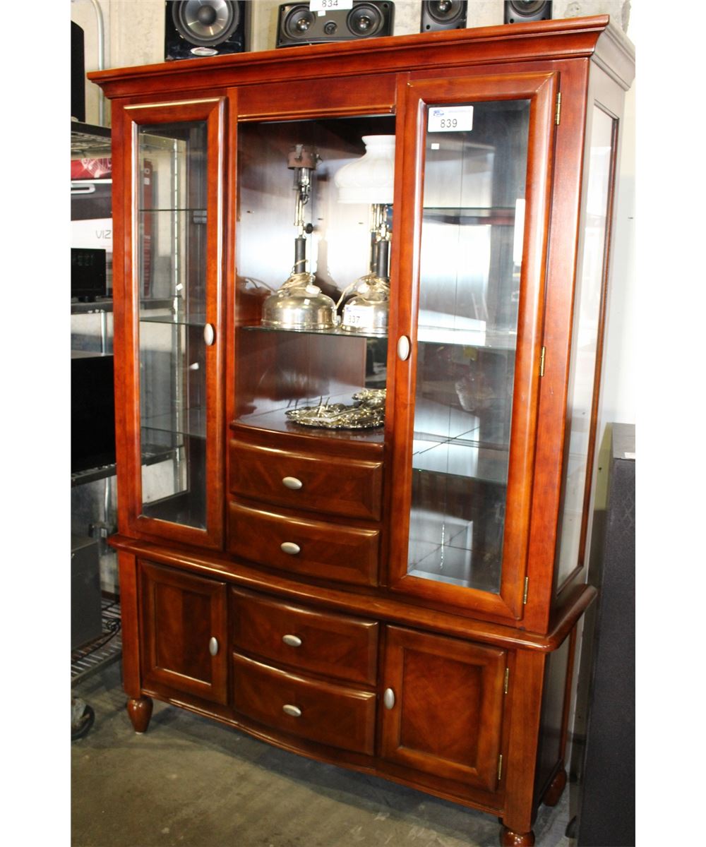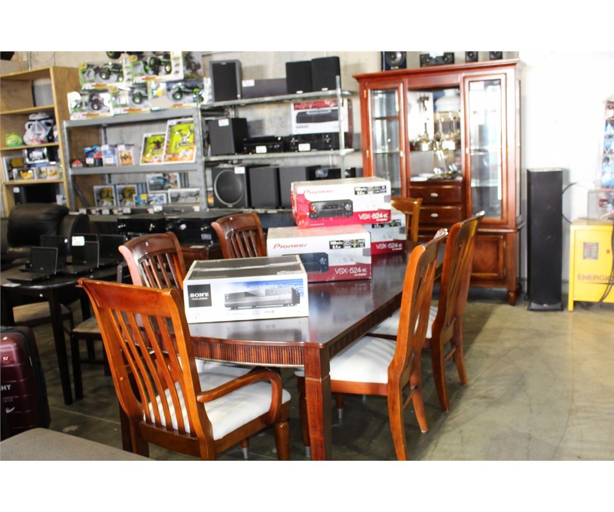 10PC MAHOGANY FINISH DINING ROOM SUITE; TABLE WITH 6 CHAIRS AND BUFFET WITH HUTCH
