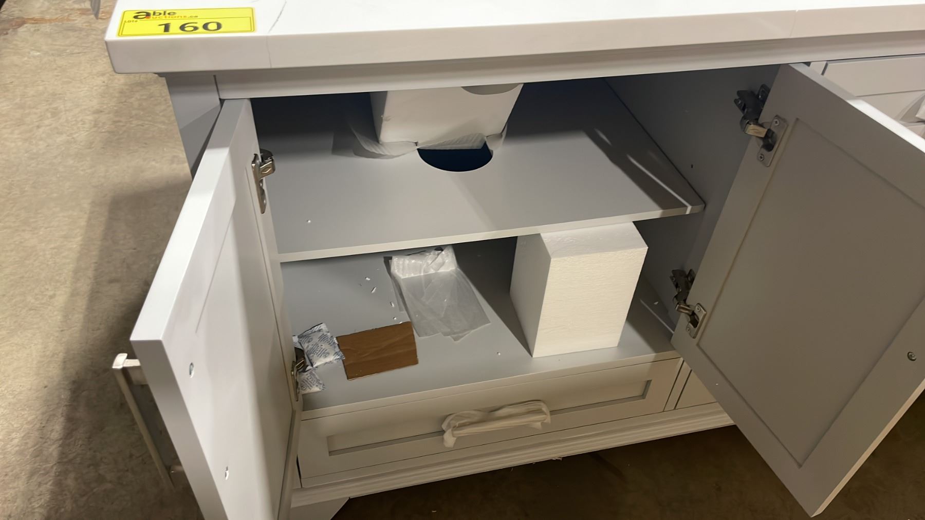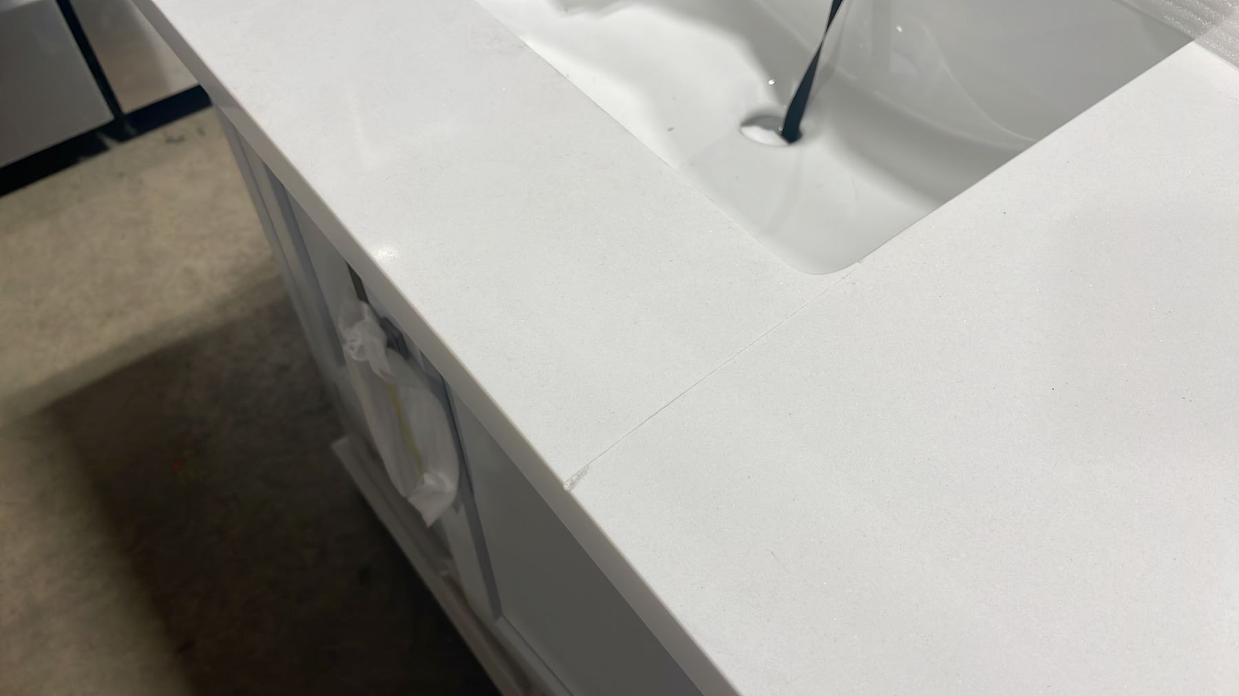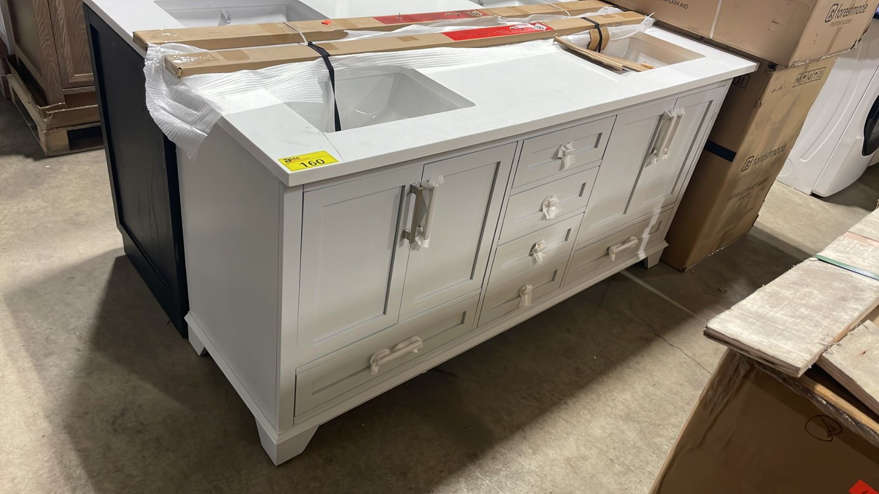 10WA-HAMB72-039EI. WHITE QUARTZ TOP 72"W X 22"D DOVE GREY 6 DRAWER 4 DOOR BATHROOM VANITY WITH SINKS & BACKSPLASH *TOP HAS TWO CRACKS*