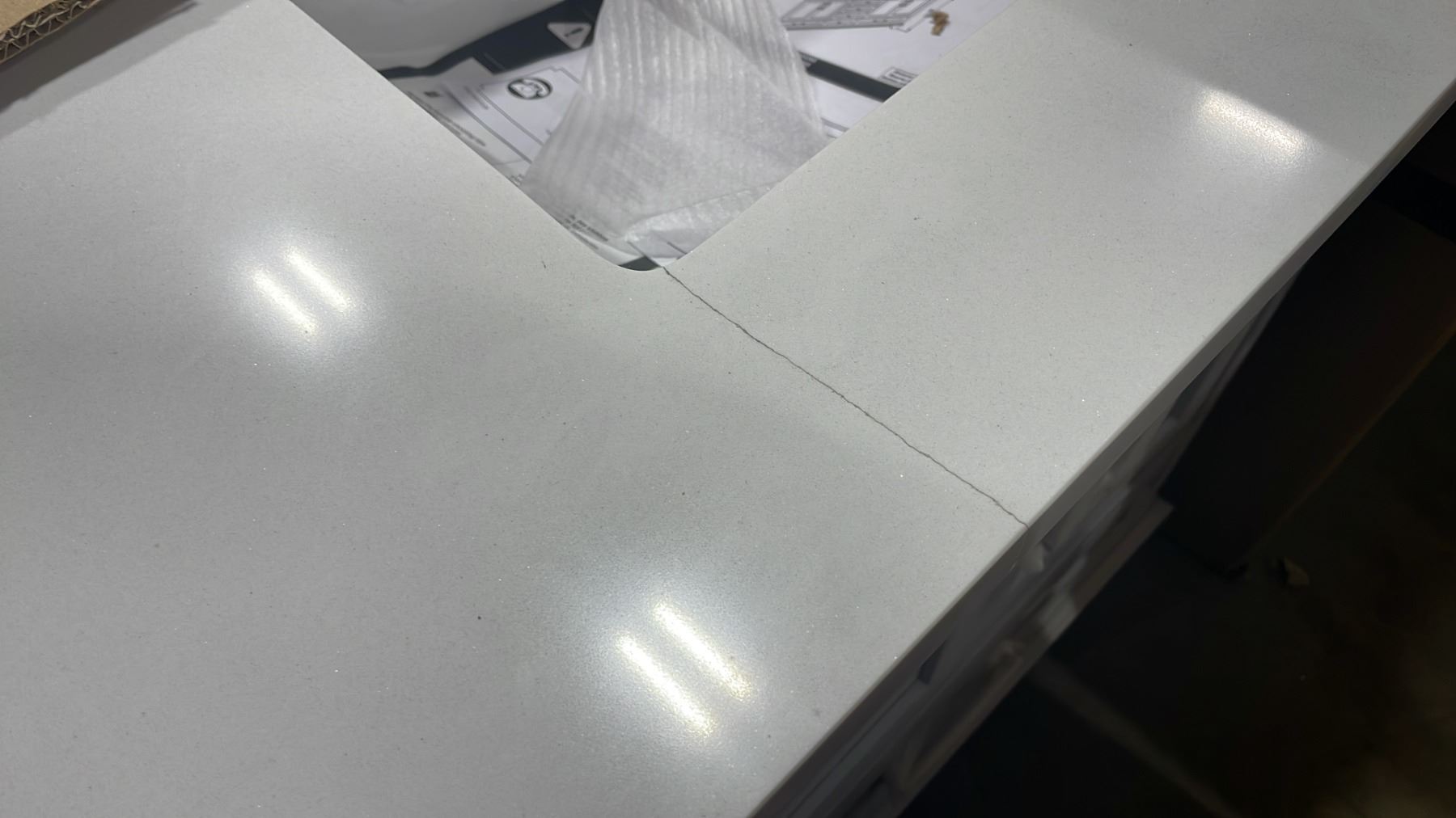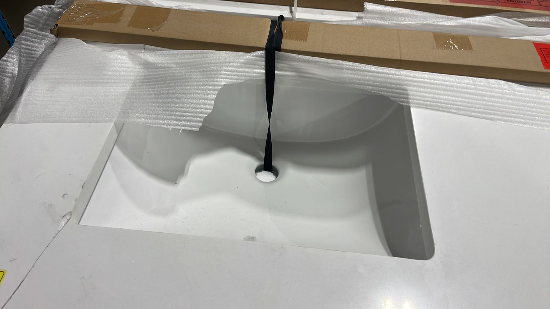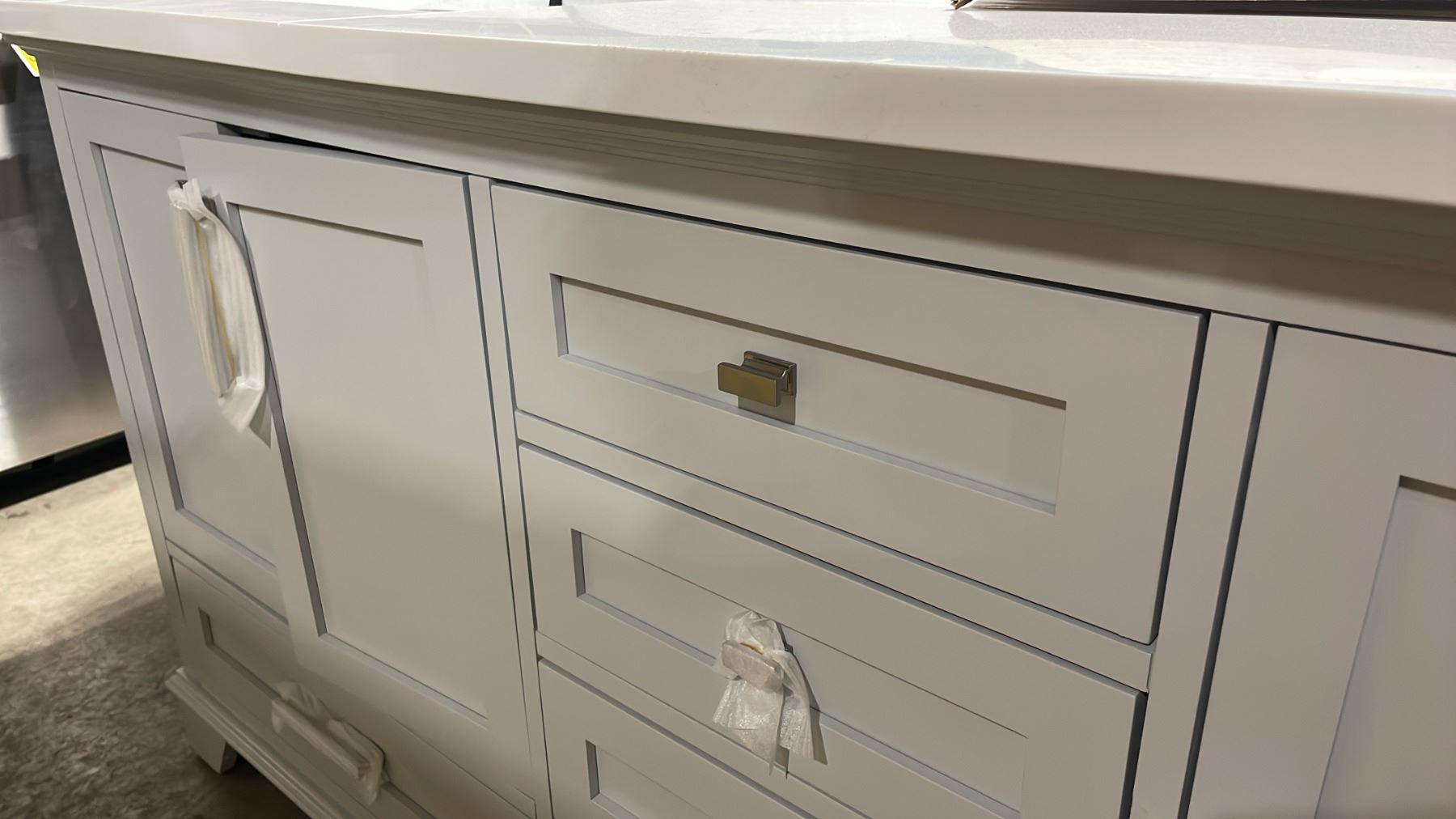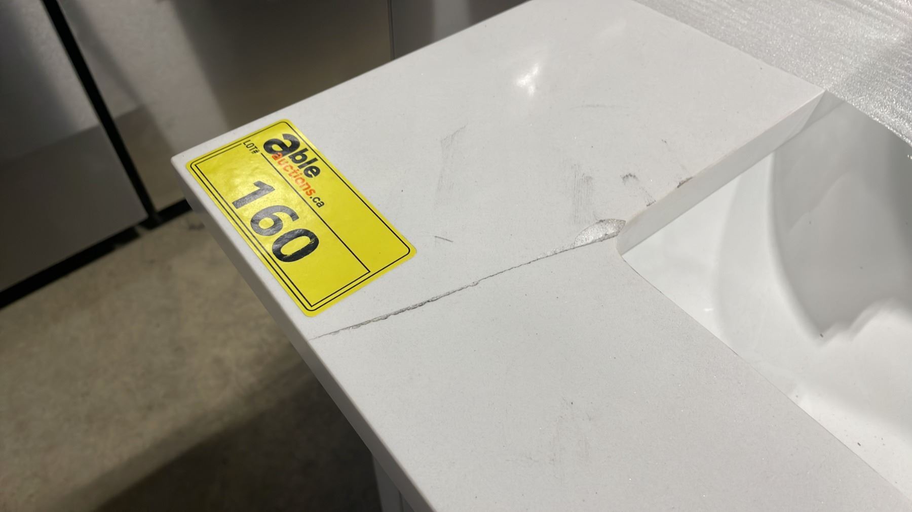 10WA-HAMB72-039EI. WHITE QUARTZ TOP 72"W X 22"D DOVE GREY 6 DRAWER 4 DOOR BATHROOM VANITY WITH SINKS & BACKSPLASH *TOP HAS TWO CRACKS*