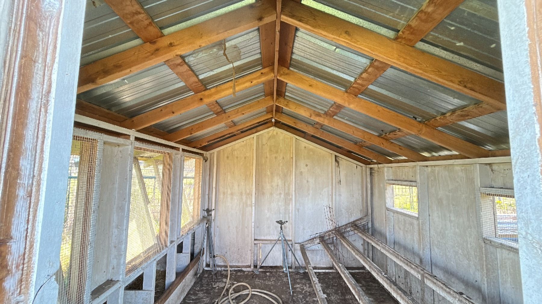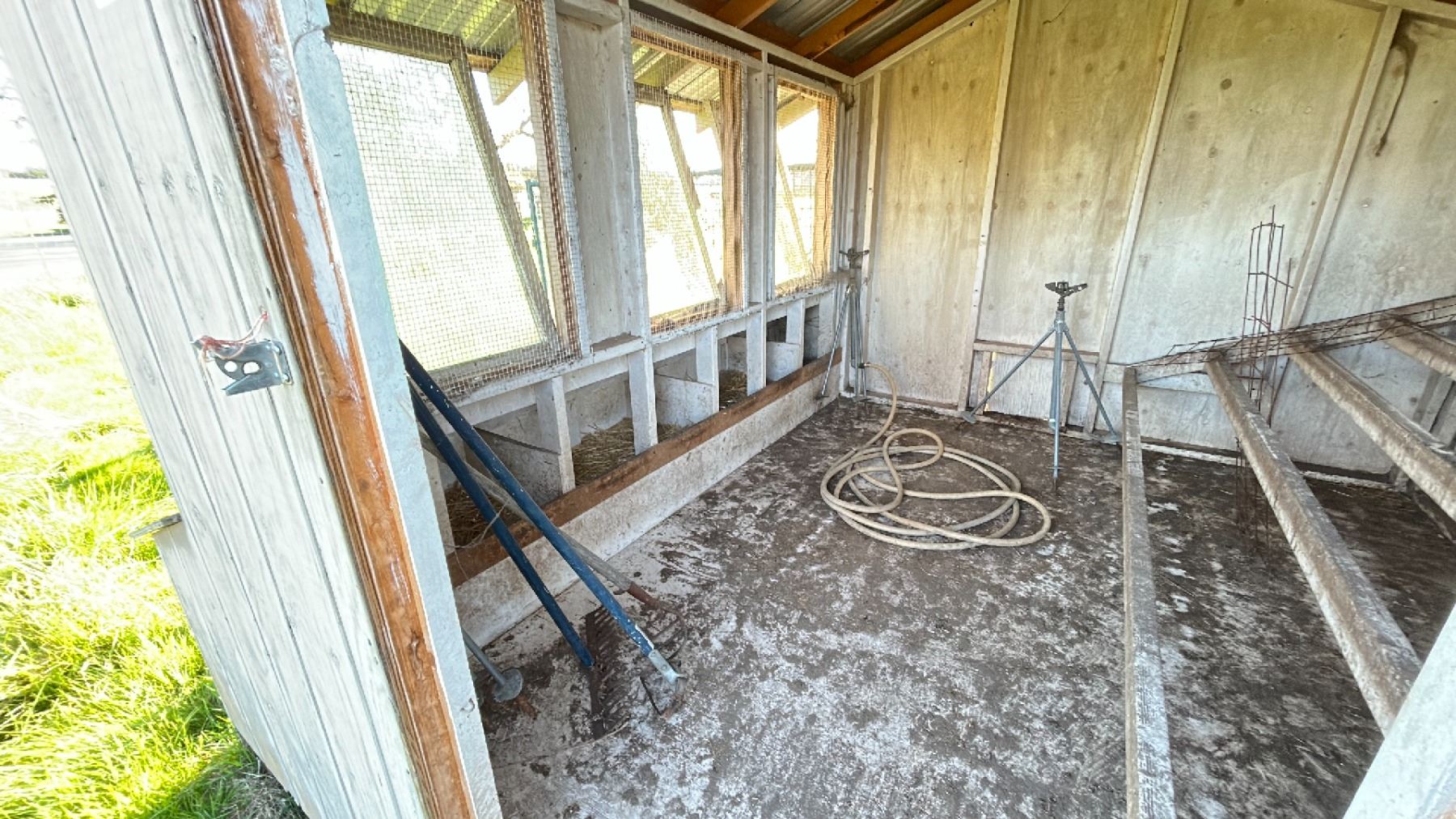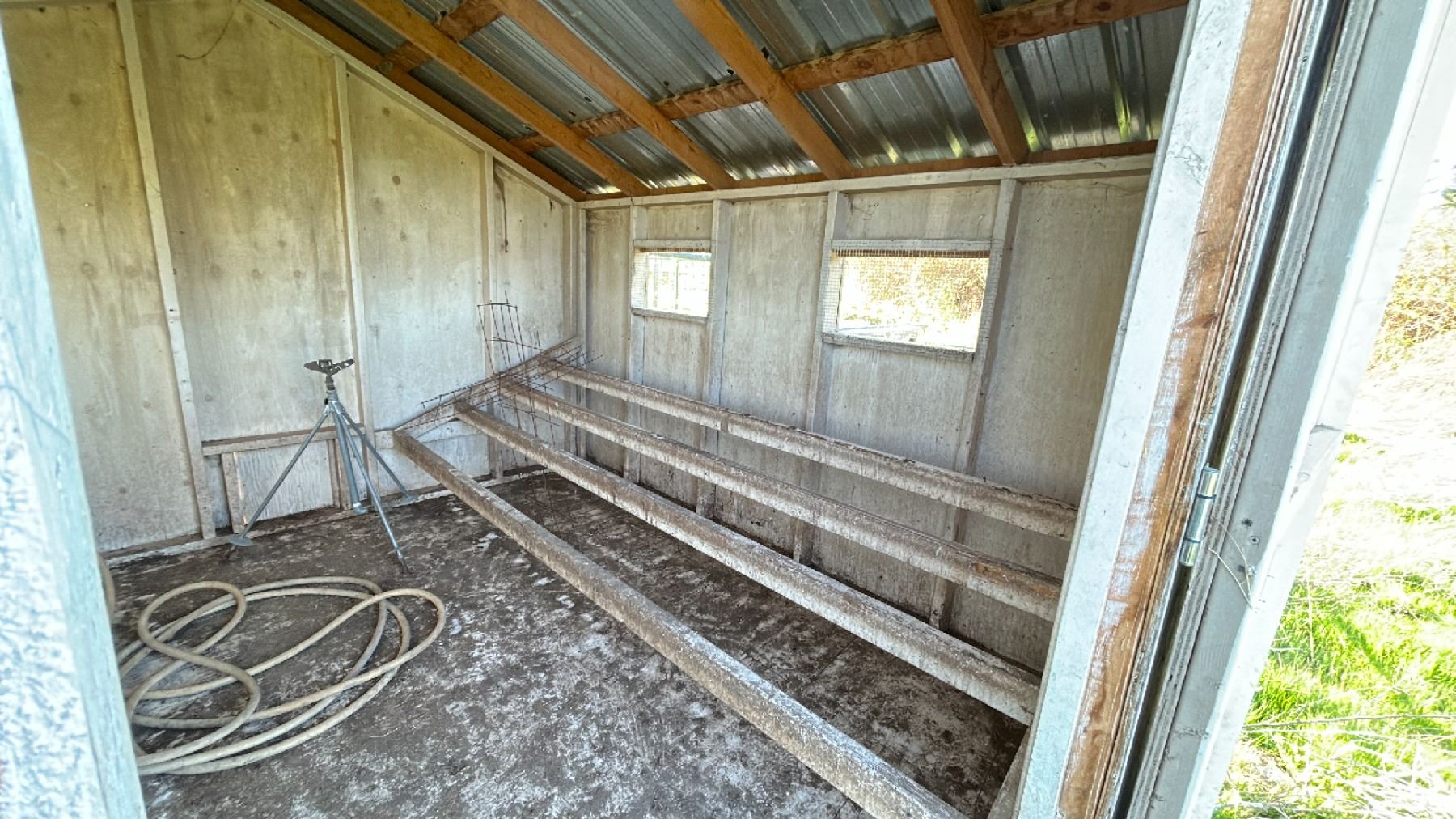 10X10' CHICKEN COOP WITH CONTENTS. SPRINKLERS, TOOLS, ETC