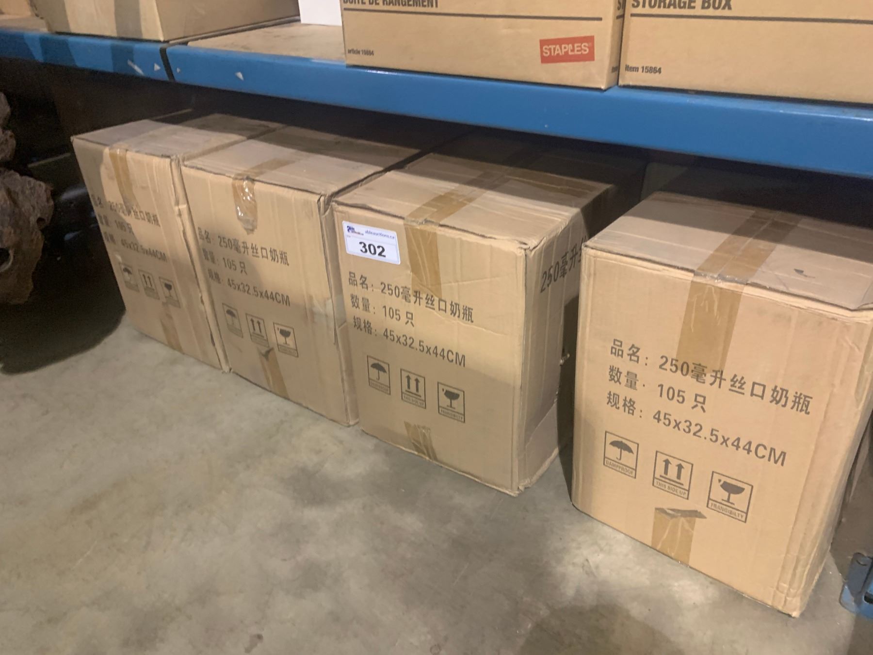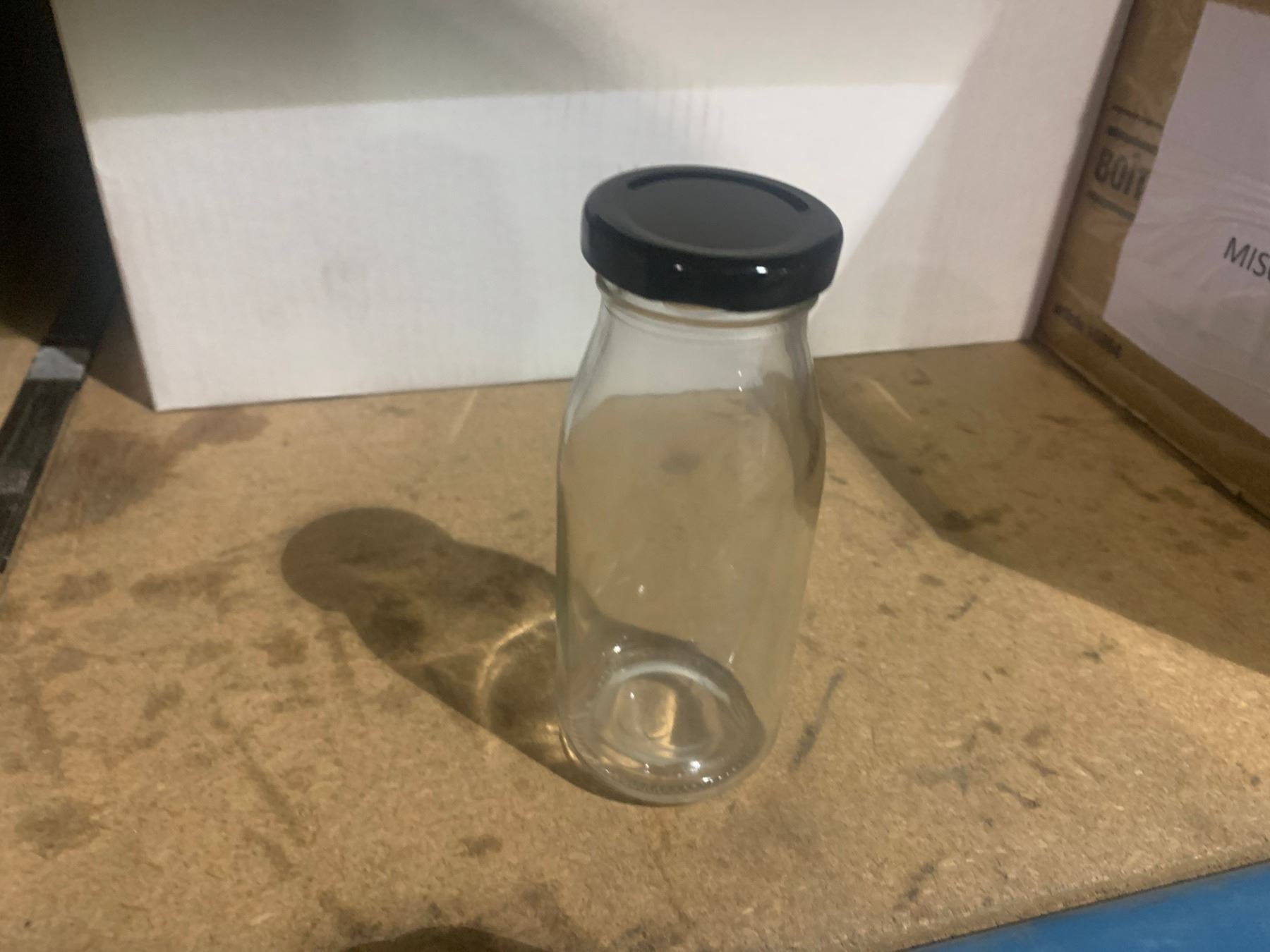 11 BOXES OF GLASS JUICE BOTTLES WITH 1 BOX BLACK BOTTLE CAPS
