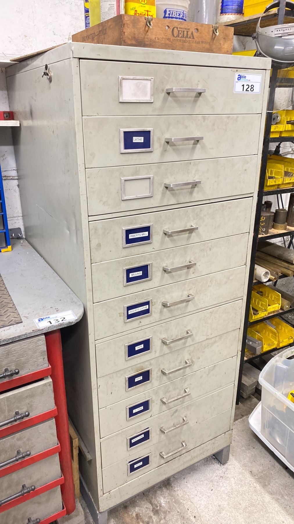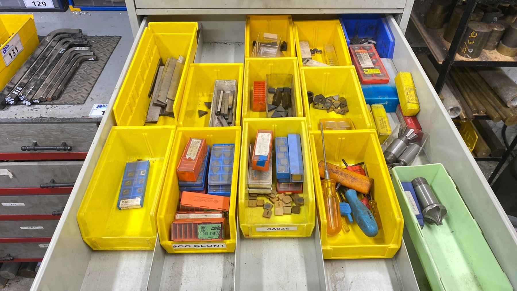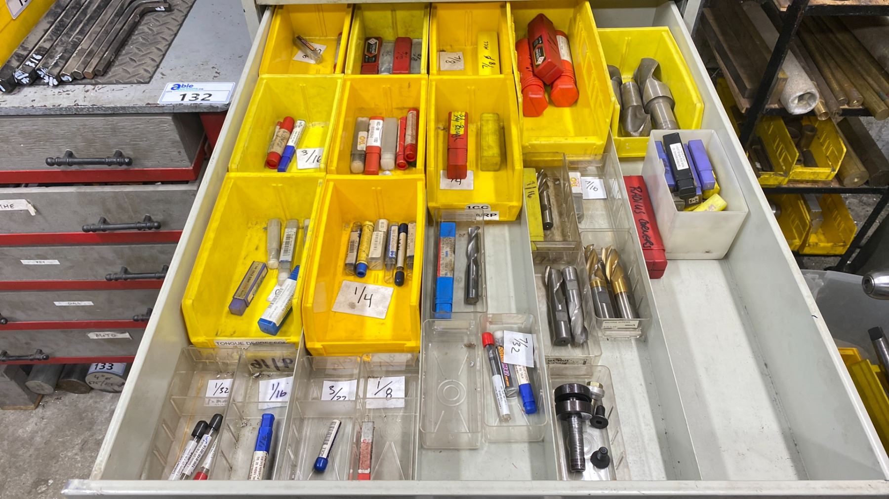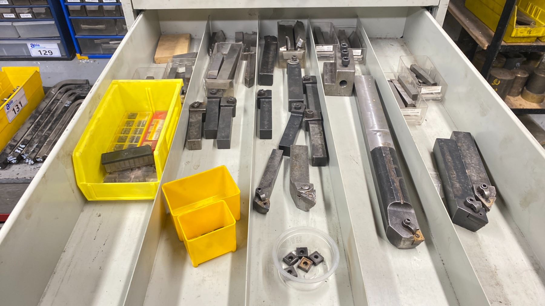 11 DRAWER METAL STORAGE CABINET FILLED WITH MACHINIST TOOLING - LATHE TURNING TOOLS WITH INSERTS, END MILLS & MILLING CUTTER INSERTS - APPROX. 57.5"H X 24"W X 28.5"D