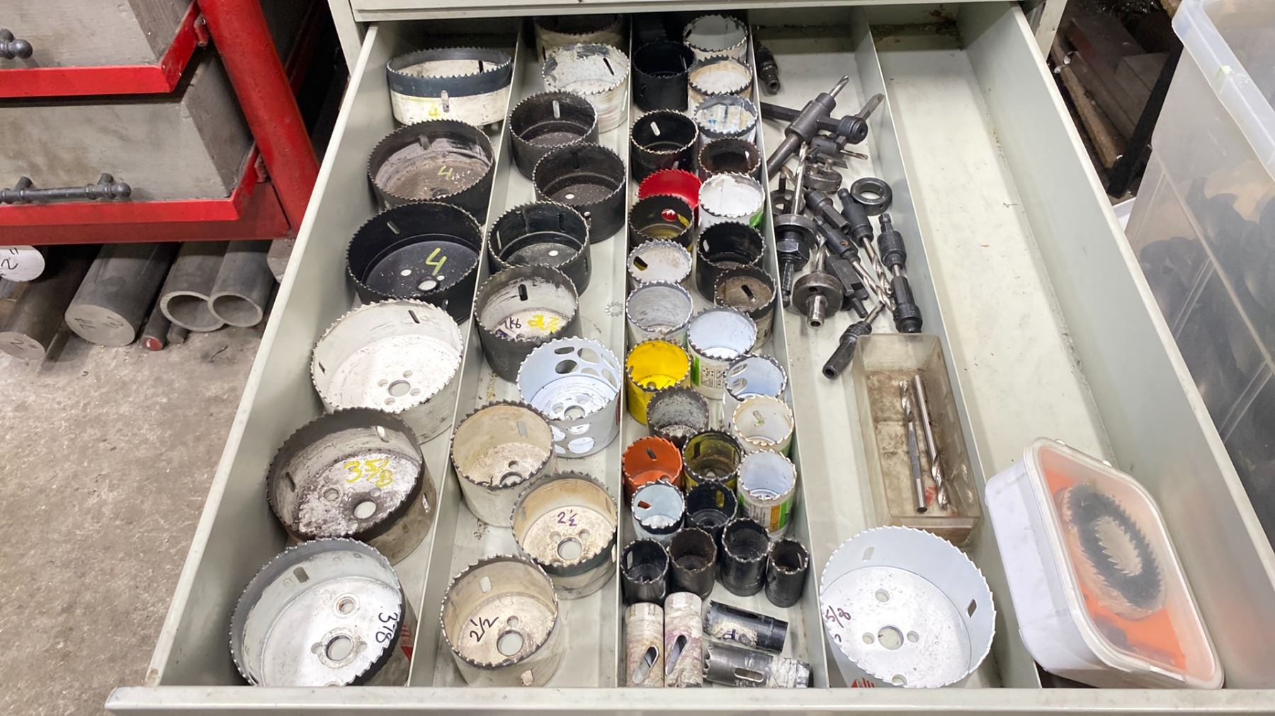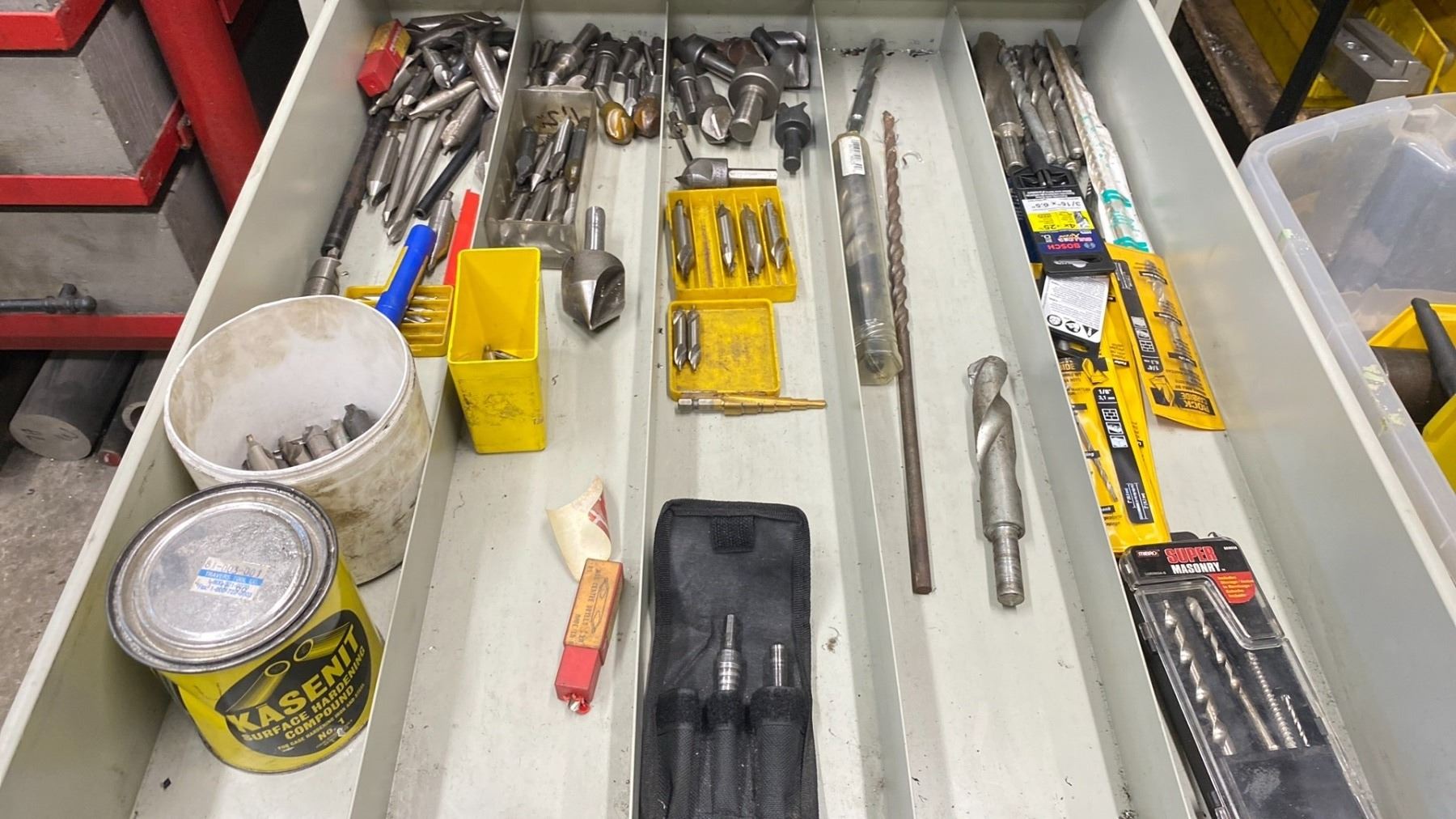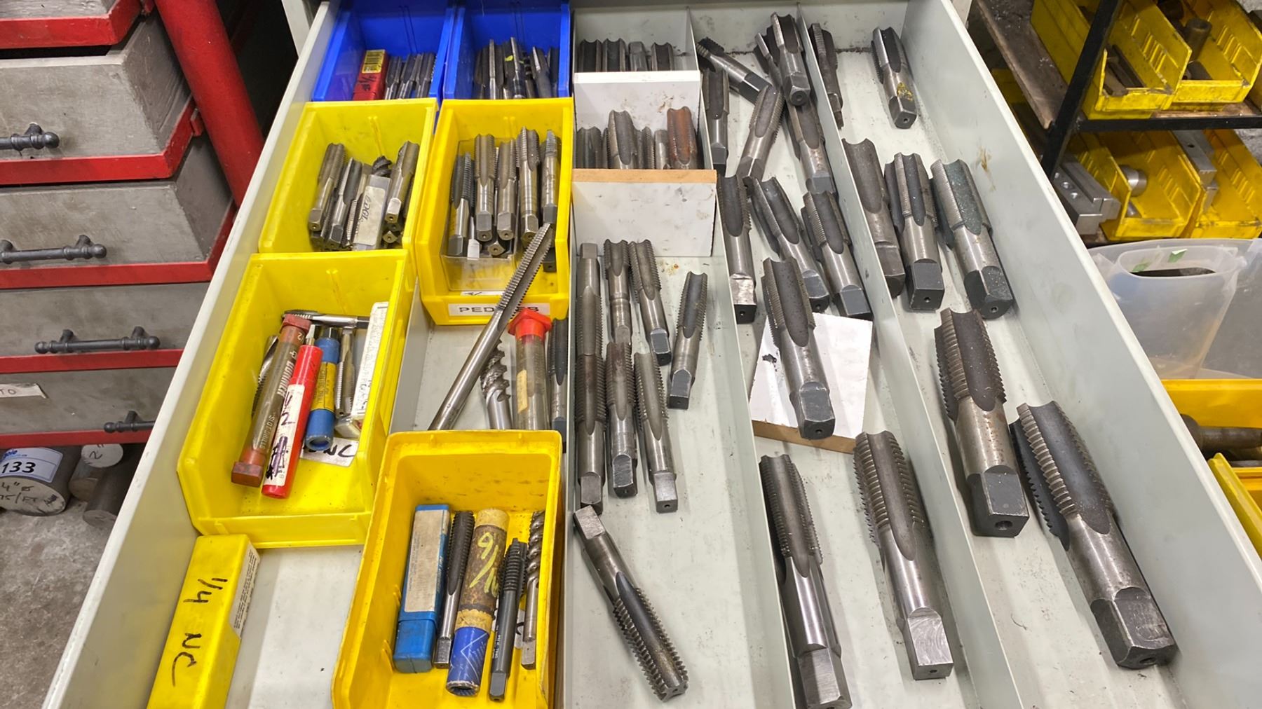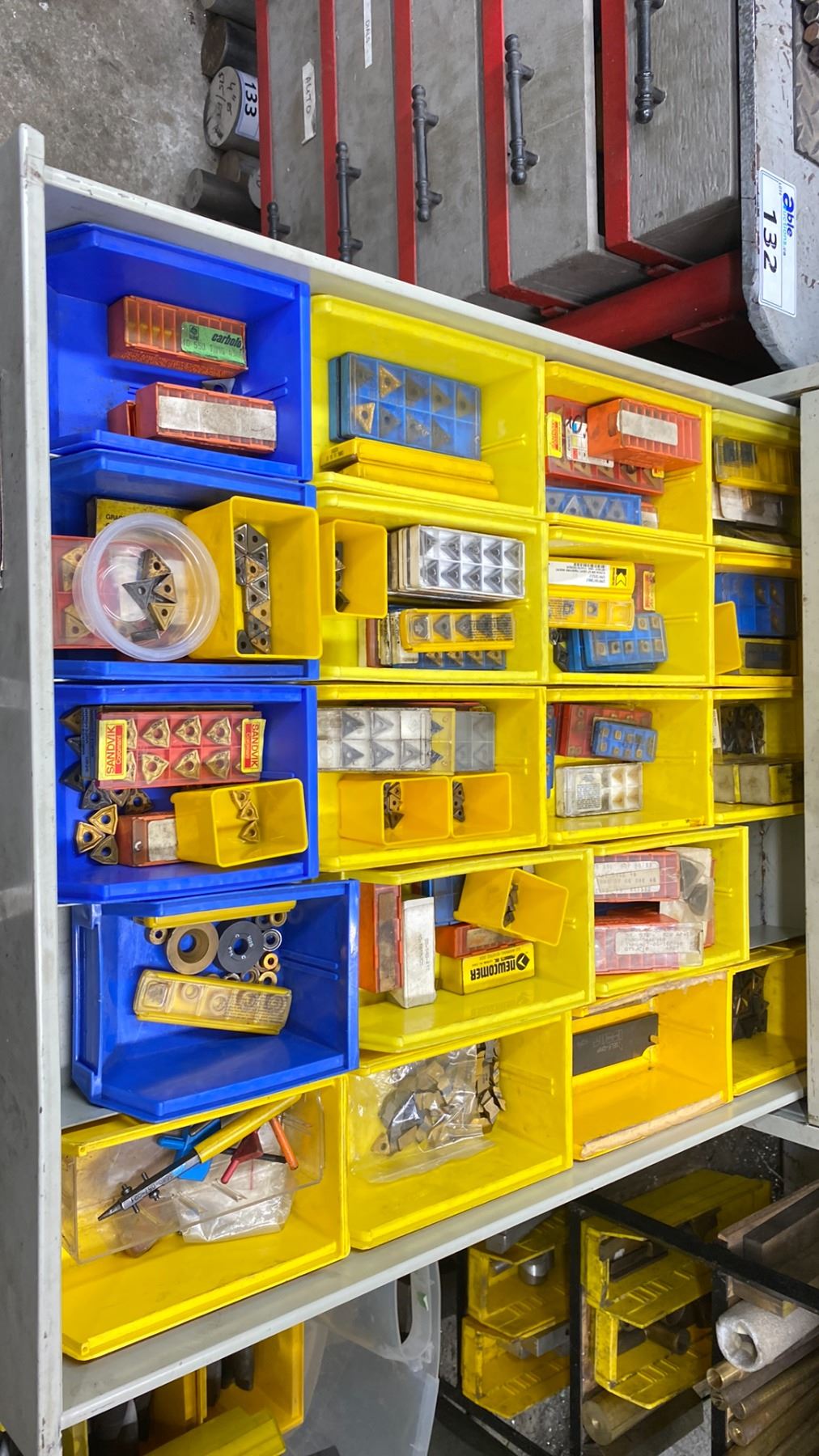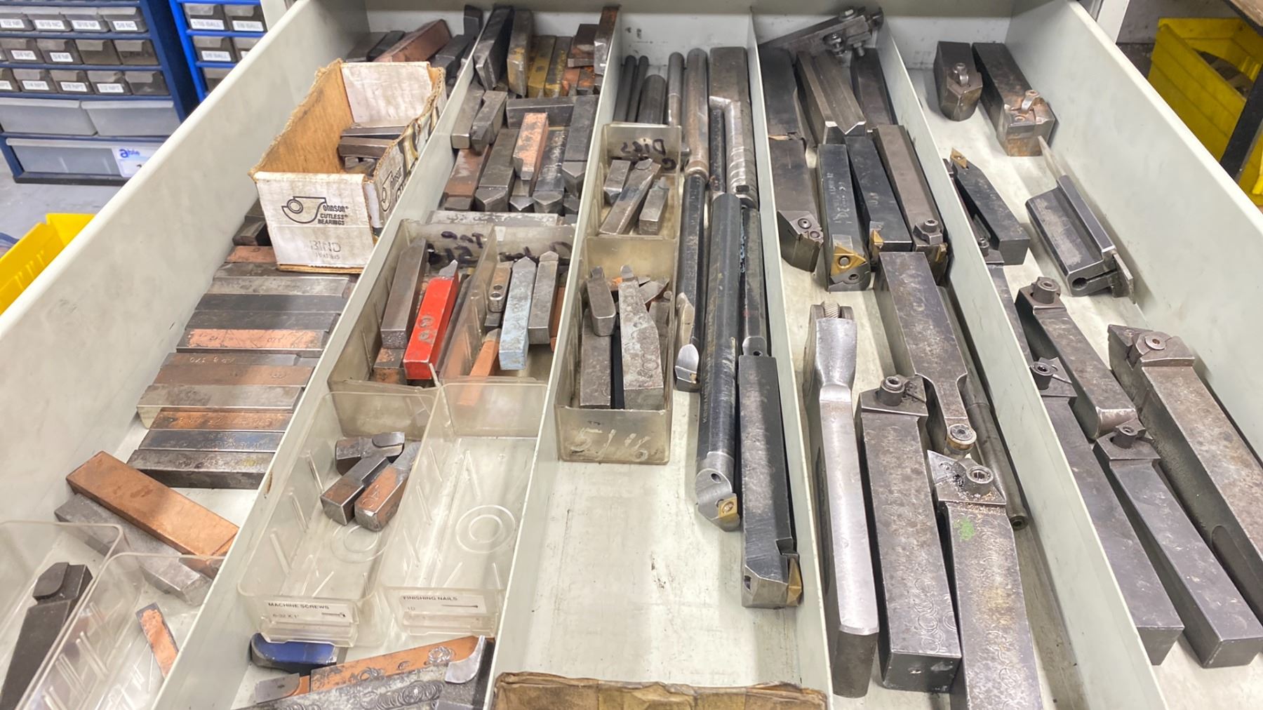 11 DRAWER METAL STORAGE CABINET FILLED WITH MACHINIST TOOLING - LATHE TURNING TOOLS WITH INSERTS, END MILLS & MILLING CUTTER INSERTS - APPROX. 57.5"H X 24"W X 28.5"D