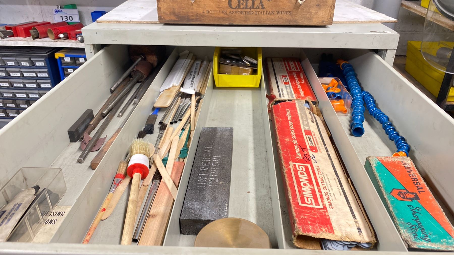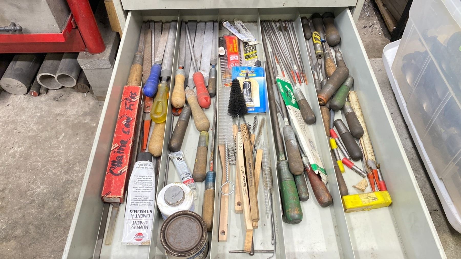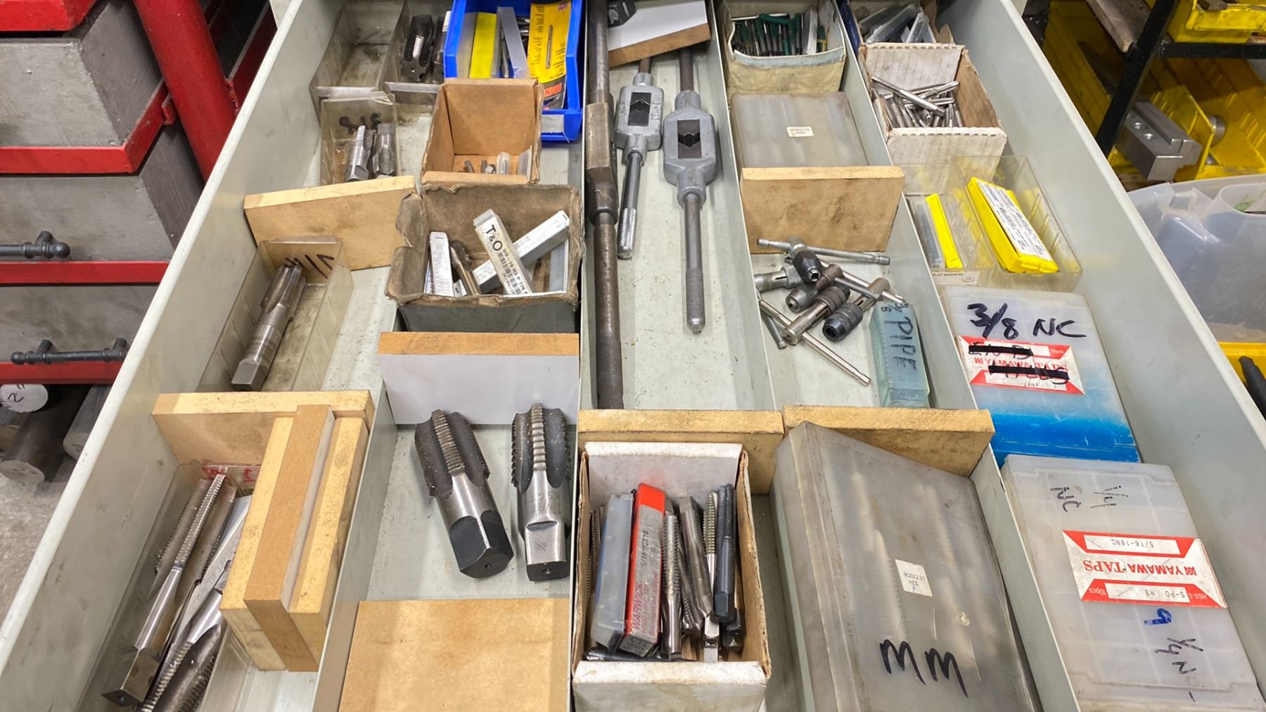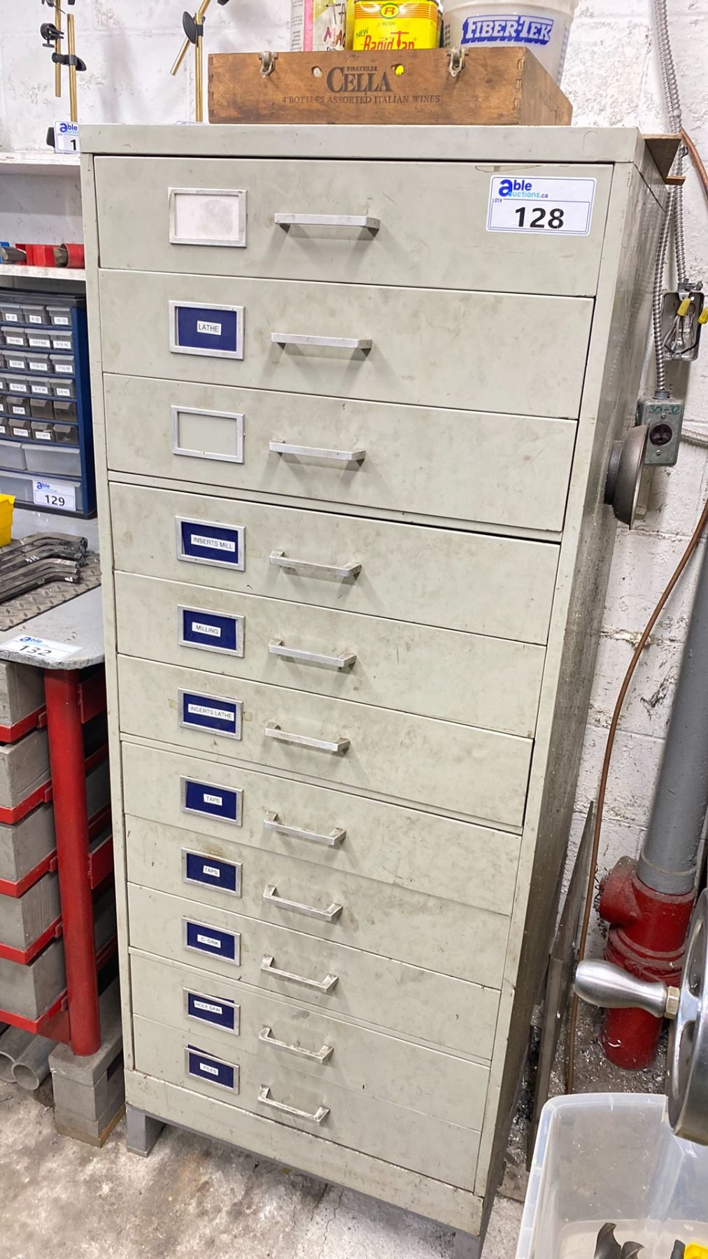 11 DRAWER METAL STORAGE CABINET FILLED WITH MACHINIST TOOLING - LATHE TURNING TOOLS WITH INSERTS, END MILLS & MILLING CUTTER INSERTS - APPROX. 57.5"H X 24"W X 28.5"D
