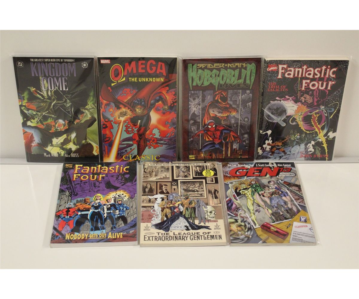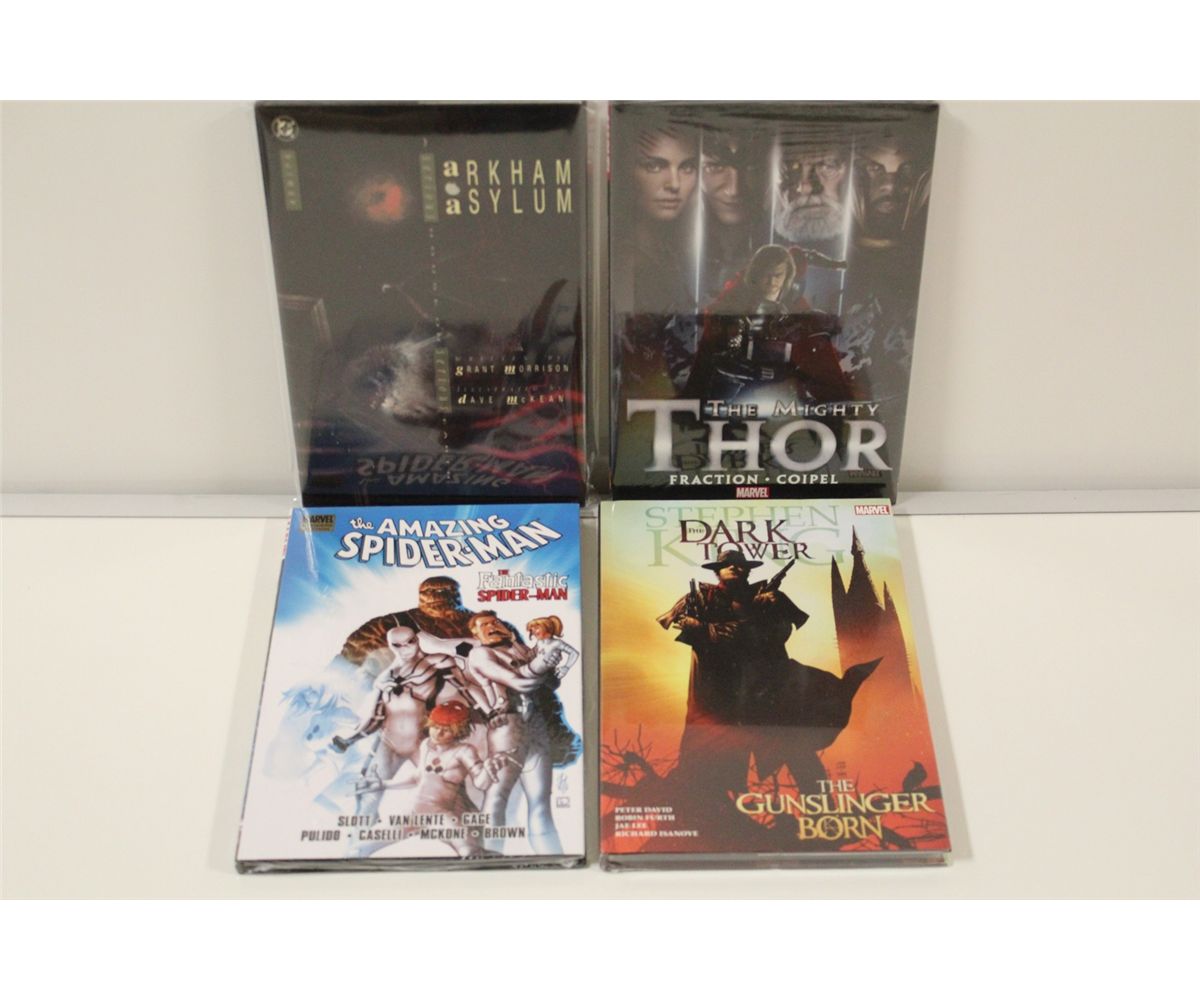 11 OUT OF PRINT & NEW TRADES + HARDCOVERS (1980'S-2000'S) INCLUDES 7 TRADES & 4 HC, 3 STILL IN ORIGINAL SHRINK! 9 MARVEL & DC WITH ARKHAM ASYLUM HC (1988) & 2 INDIES, HIGH GRADE, LIKE NEW, APPROX $300 COVER PRICE