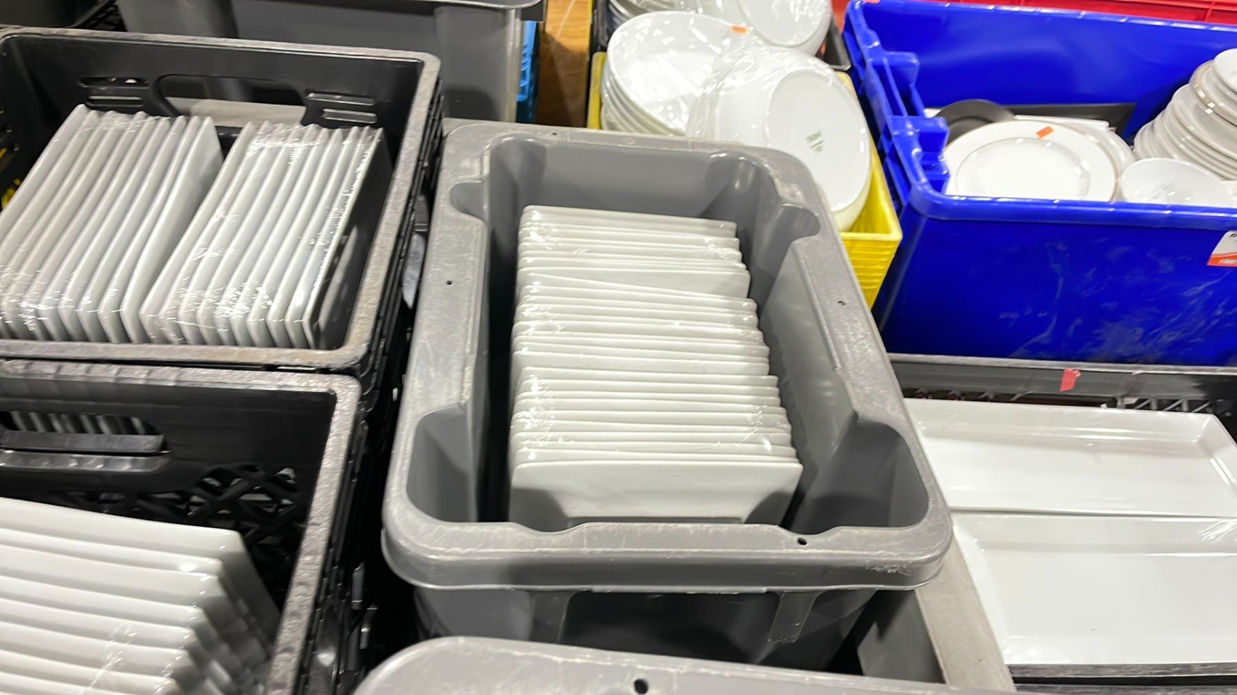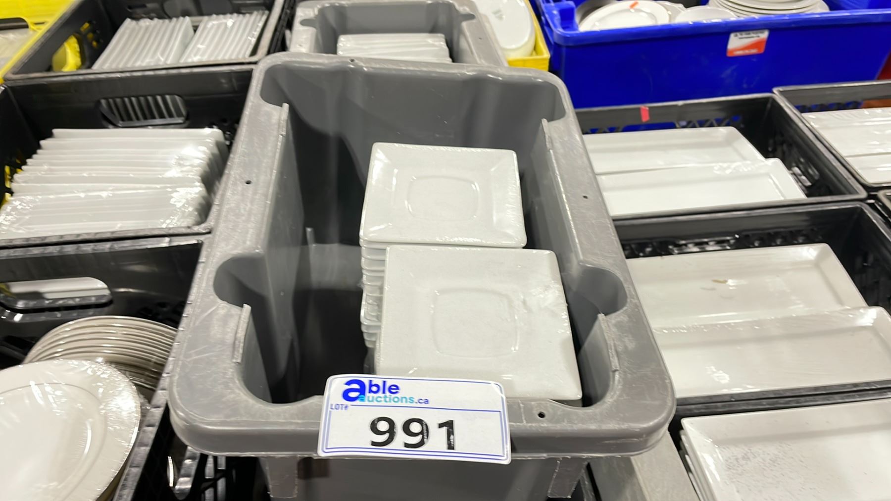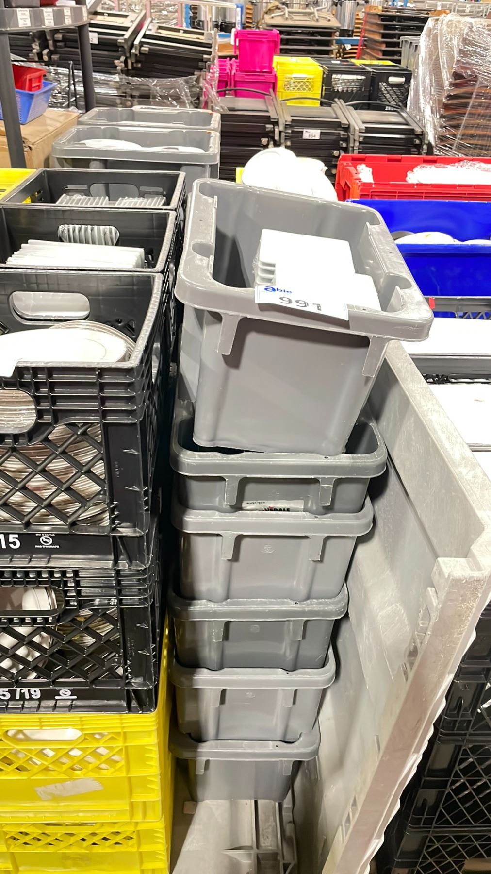 11 PLASTIC BINS OF ASSORTED COMMERCIAL RESTAURANT SAUCERS, APPETIZER PLATES, & SIDE PLATES *PLASTIC BINS INCLUDED* ( APPROX. 40 PLATES PER CRATE )
