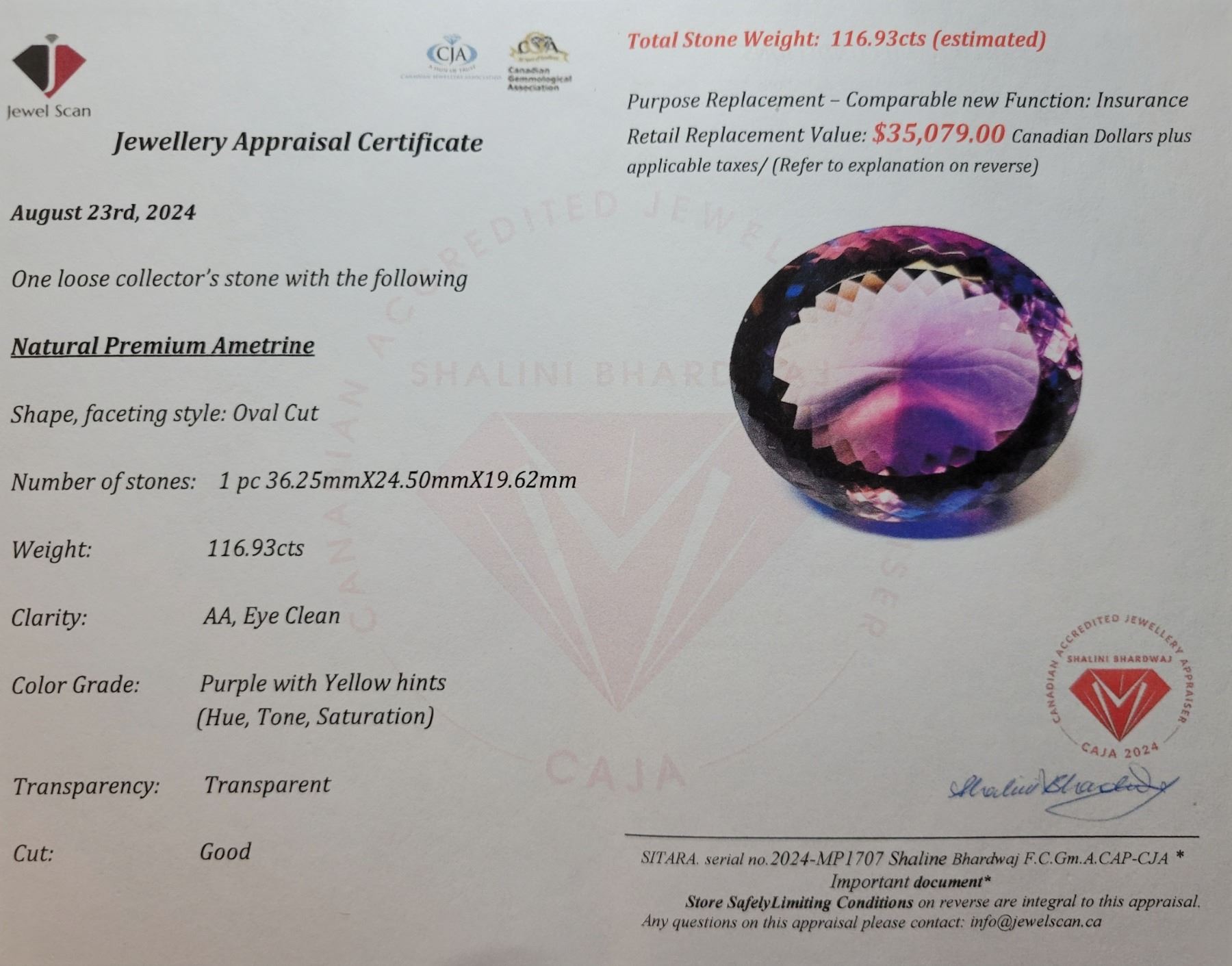 116.93 CT CERTIFIED BI-COLOUR AMETRINE GEMSTONE ($35,079 APPRAISAL, APPRAISAL NOT GUARANTEED)