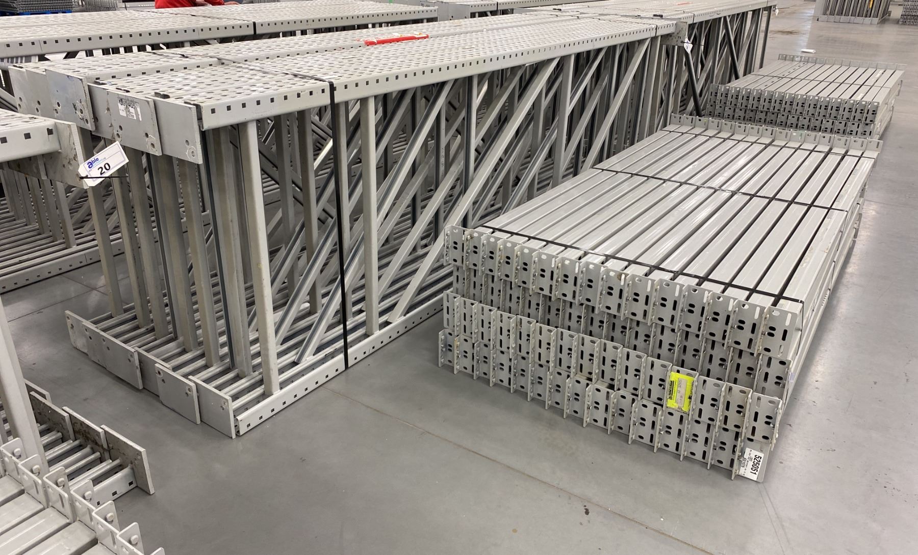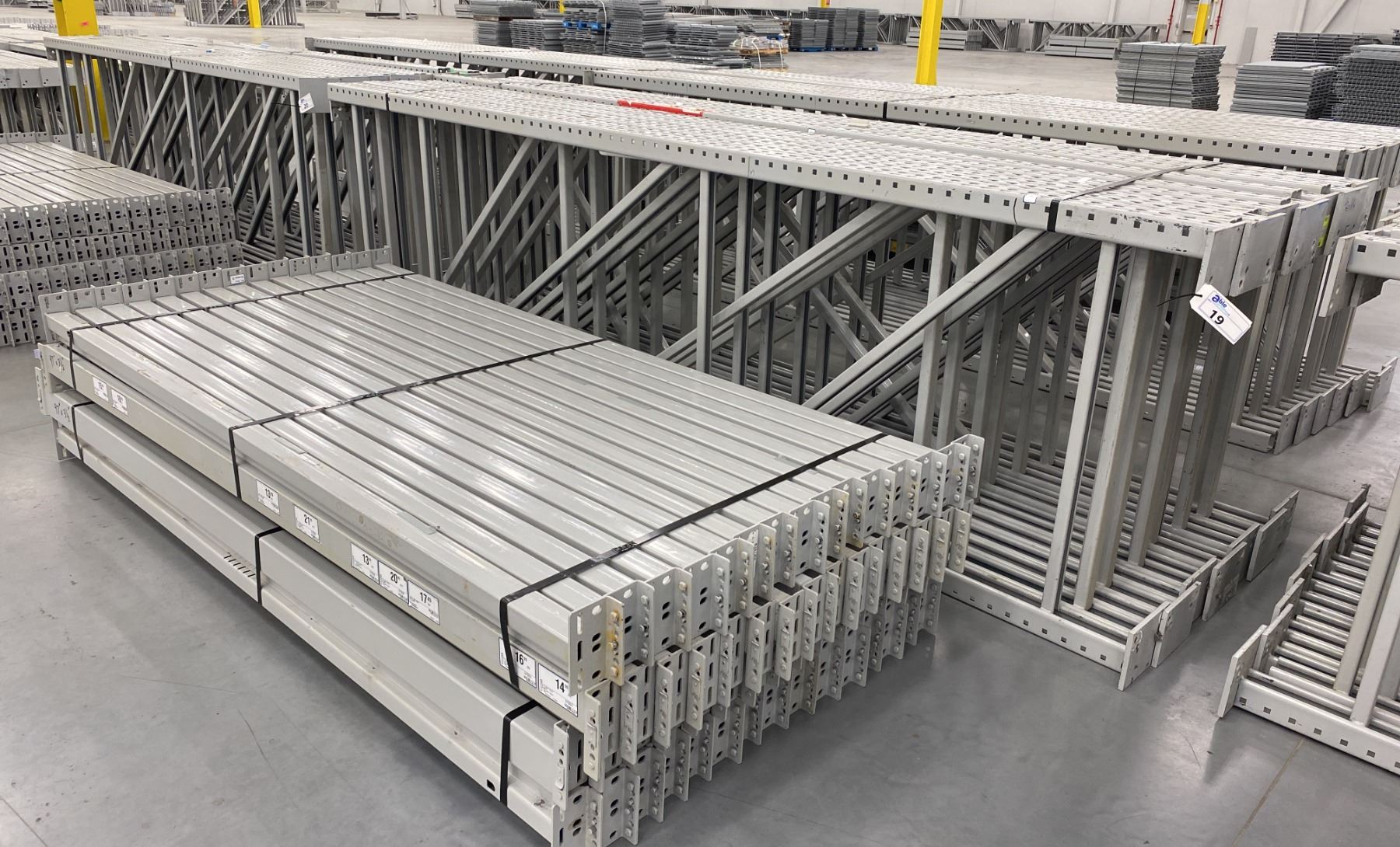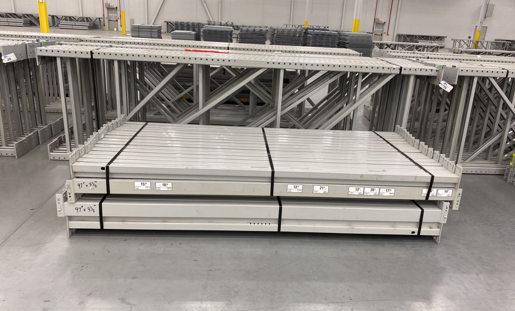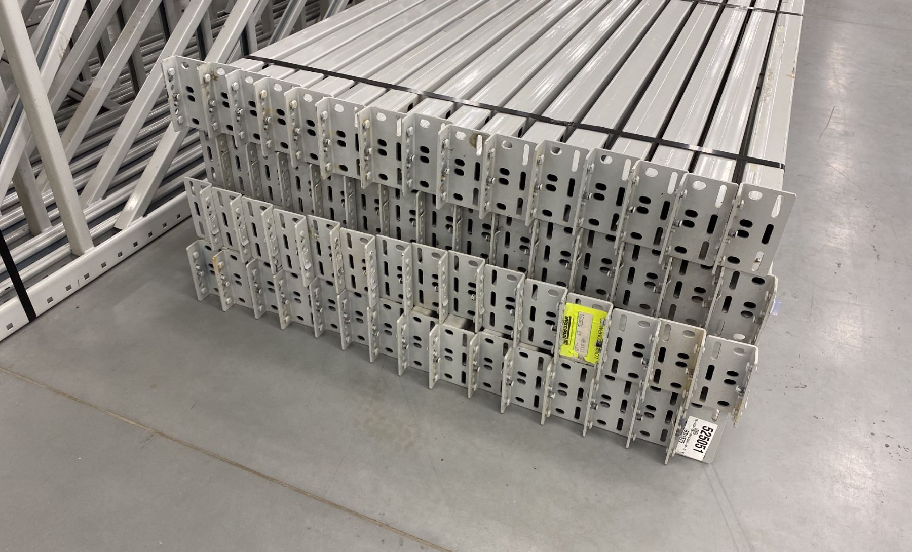 12 BAYS GREY INDUSTRIAL PALLET RACKING (13) UPRIGHTS 144" X 42" AND (60) SIDE BEAMS 97" X 3.5", WITH 8" X 6" WELDED FOOTPLATES 1/2" THICK
