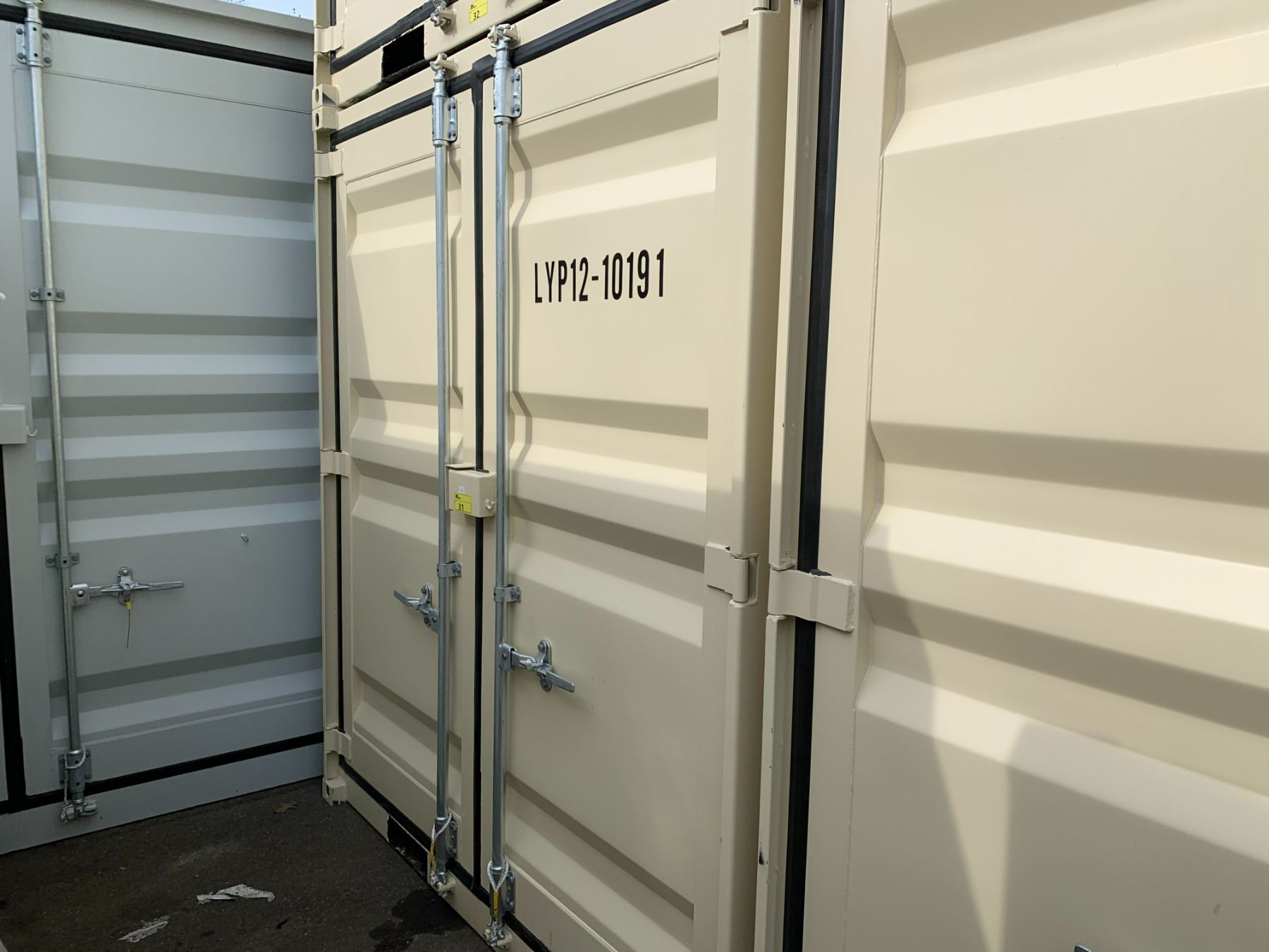 12' BEIGE PORTABLE OFFICE CONTAINER W88" X L144" X H99" WITH WINDOW, LOCKING MAN DOOR, WOOD FLOOR, & DUAL SWING CAM LOCK REAR DOORS