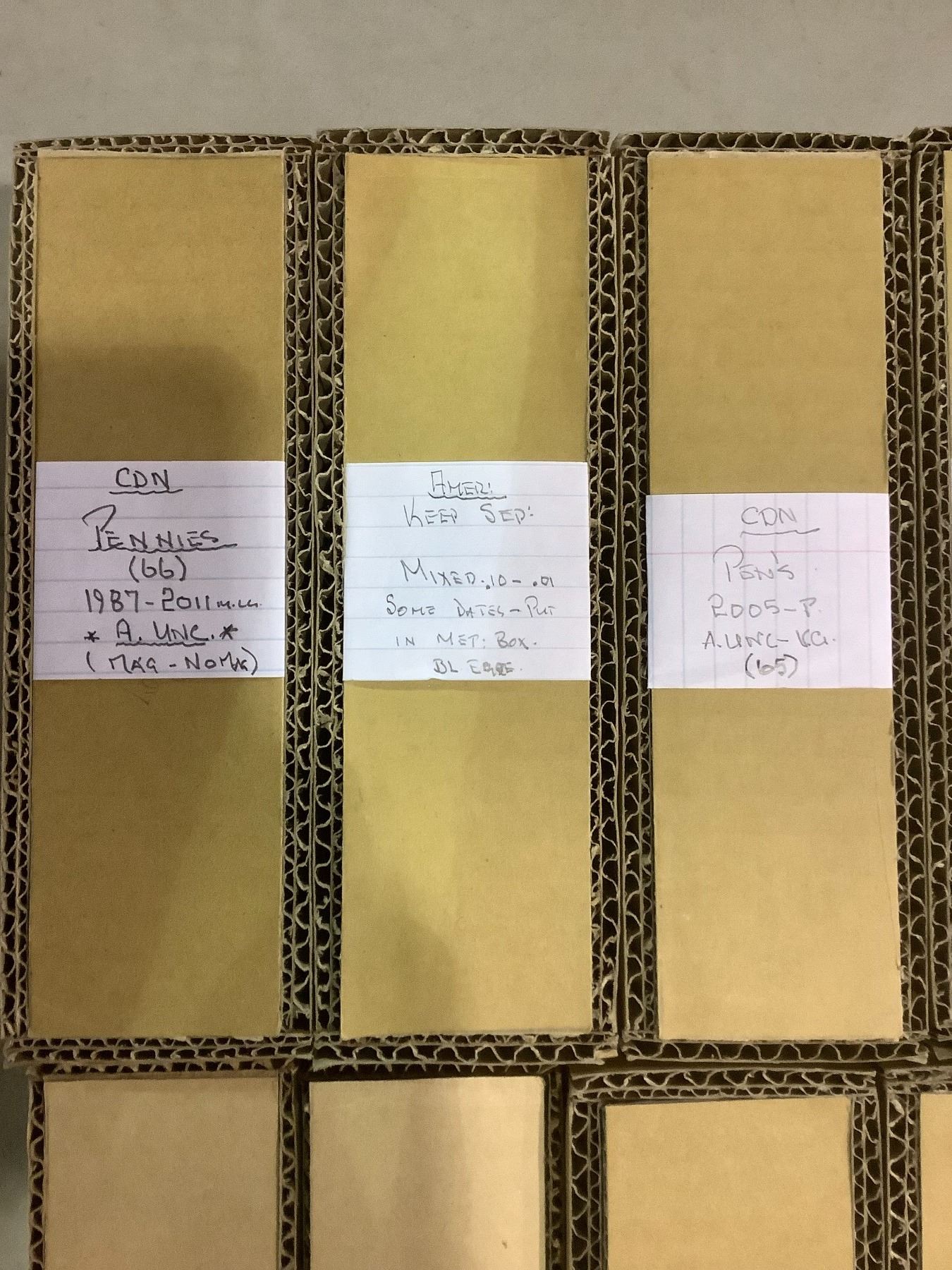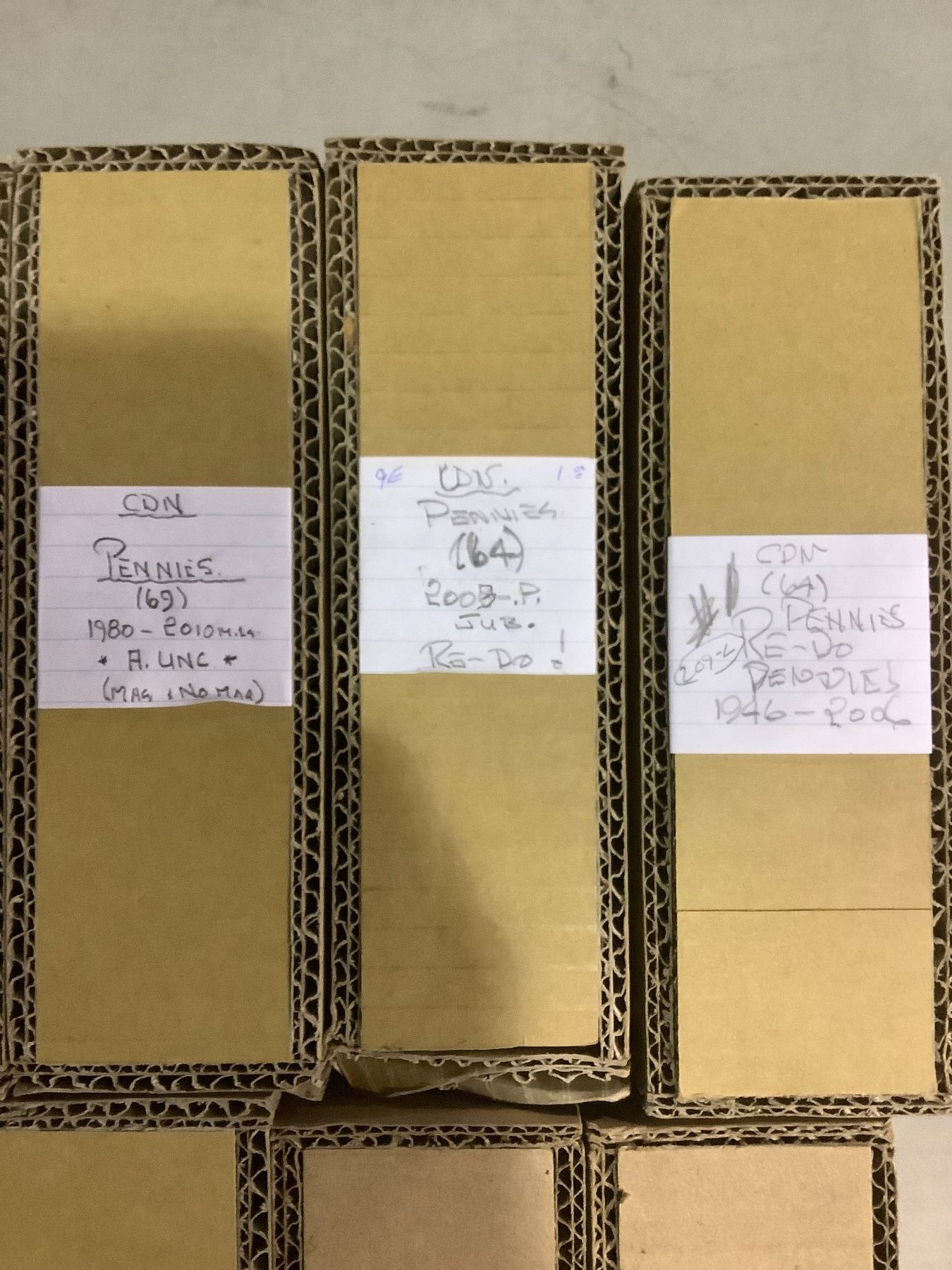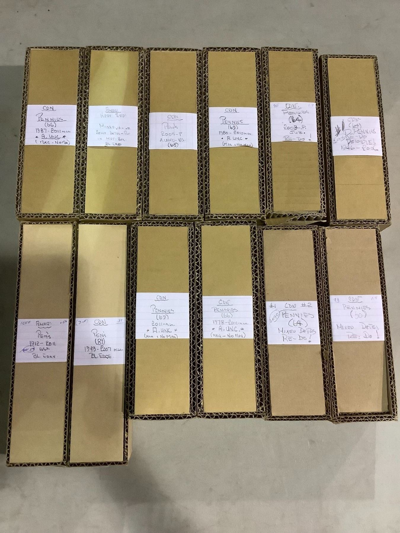 12 BOXES OF ASSORTED PENNIES & COINS (SEE PHOTOS FOR DETAILS)