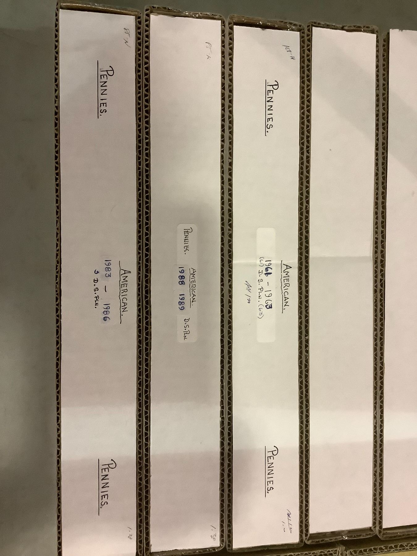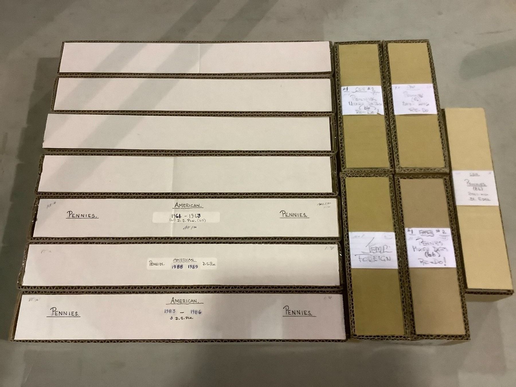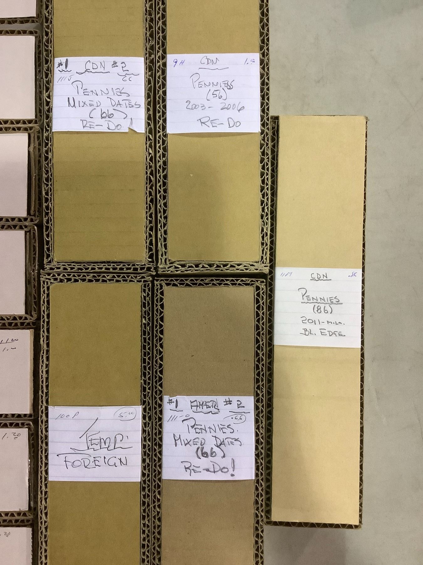12 BOXES OF ASSORTED PENNIES & COINS (SEE PHOTOS FOR DETAILS)