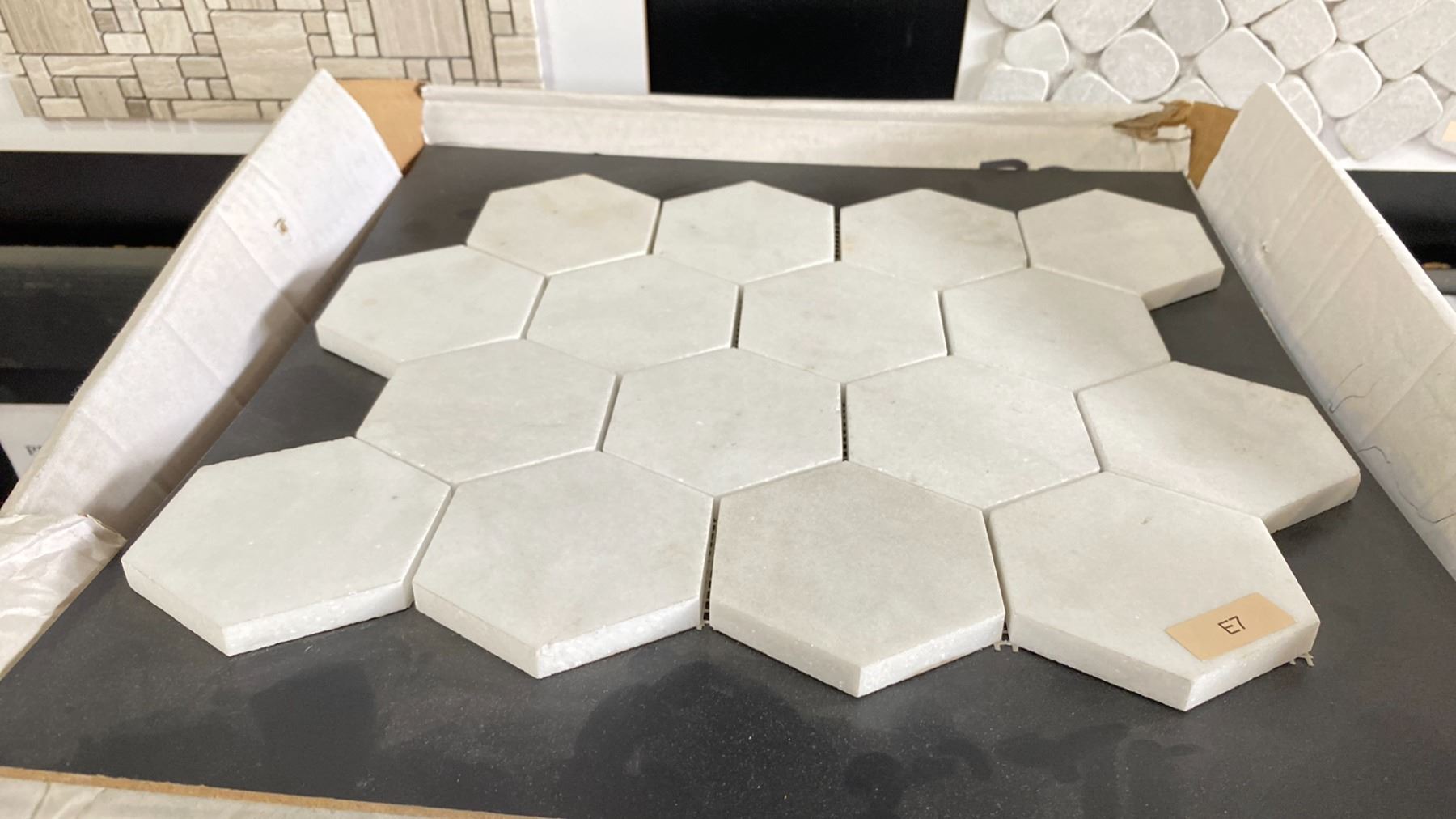 12 BOXES OF MARBLE MOSAIC TILE IN E7 10 X 1SQ.FT. SHEETS PER BOX APPROX 120SQ.FT. TOTAL