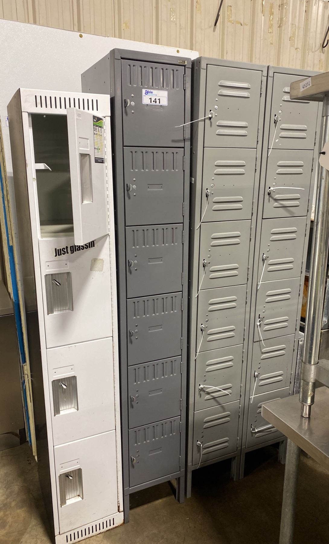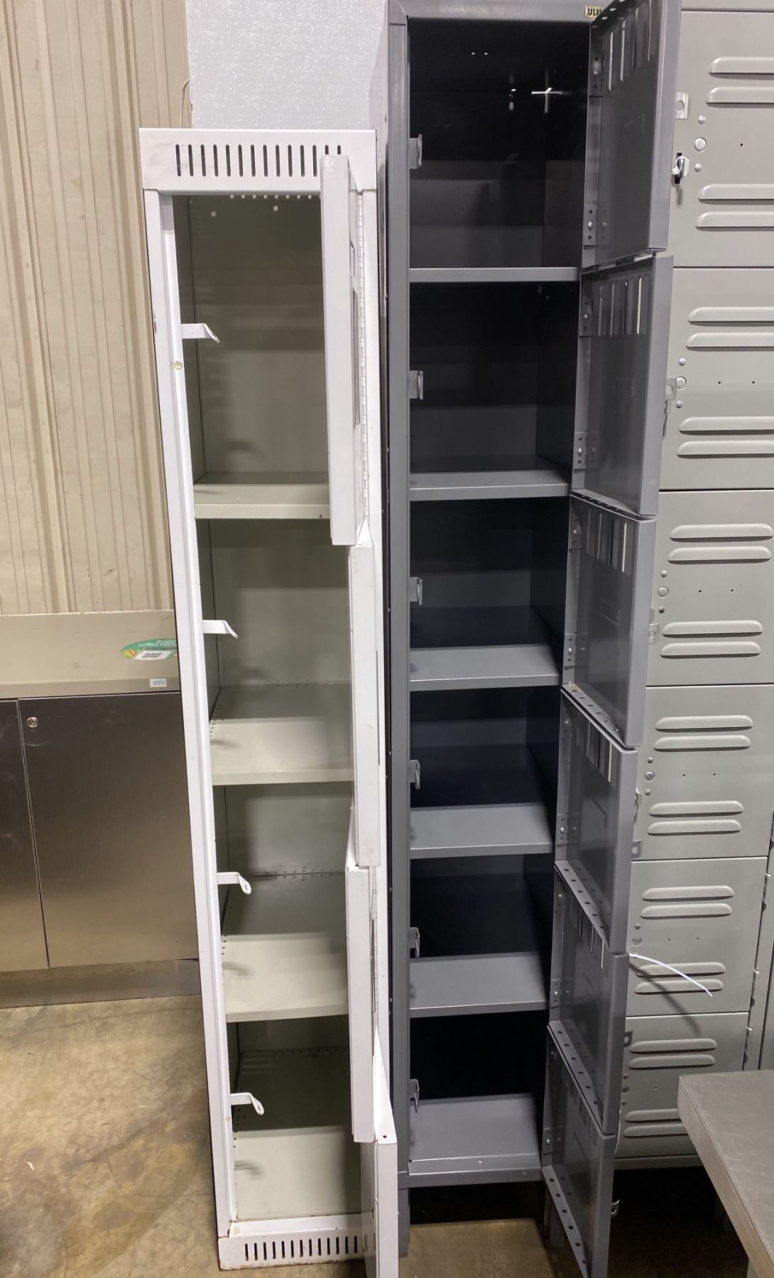 12 DOOR GREY METAL LOCKER SYSTEM, 6 DOOR DARK GREY METAL LOCKER SYSTEM, 4 DOOR WHITE METAL LOCKER SYSTEM