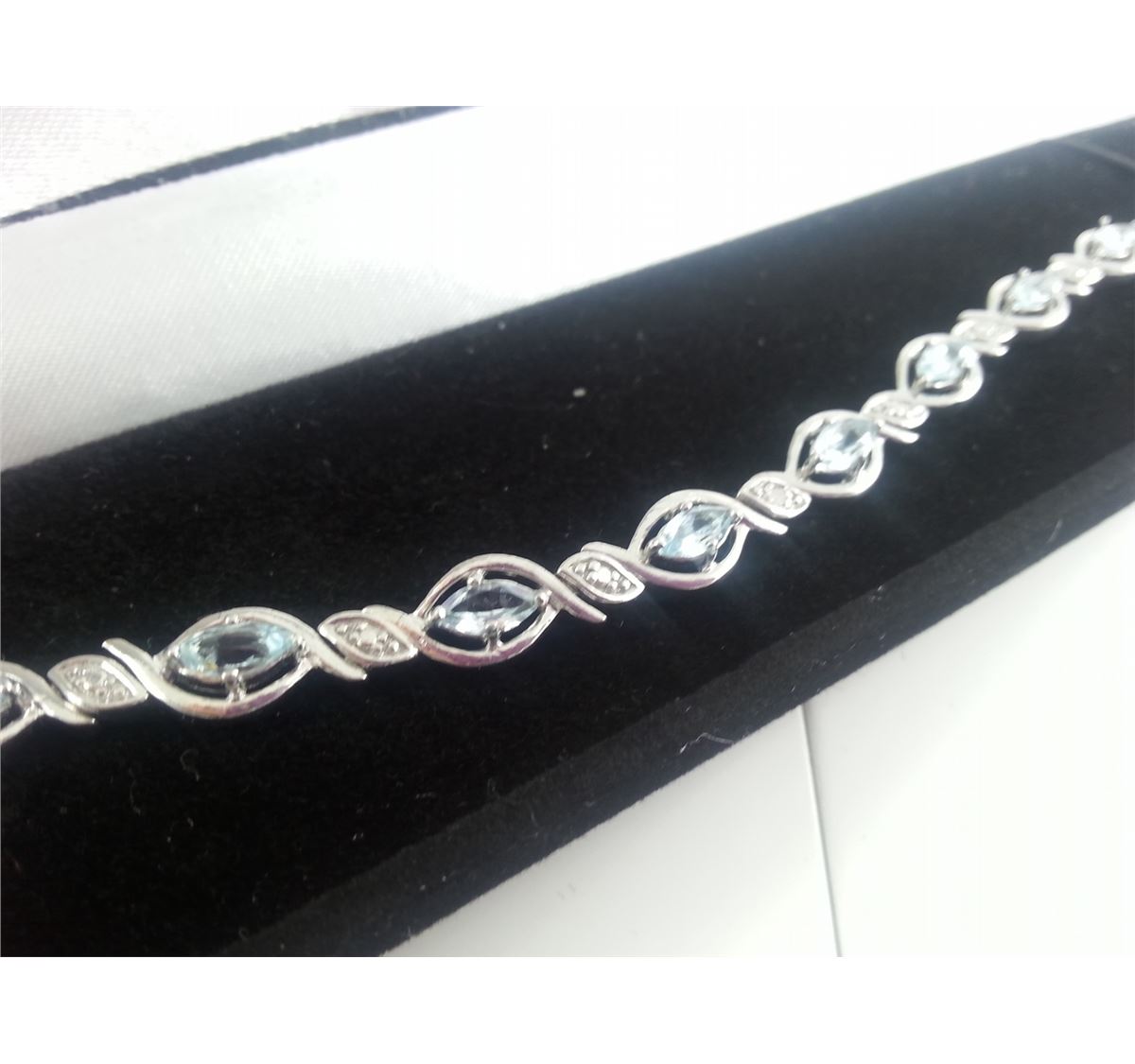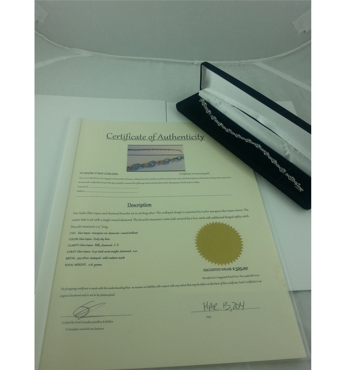 12 MARQUISE BLUE TOPAZ TENNIS BRACELET SET WITH DIAMOND. 6.50CARAT. STERLING SILVER. INCLUDES $525 CERTIFICATE