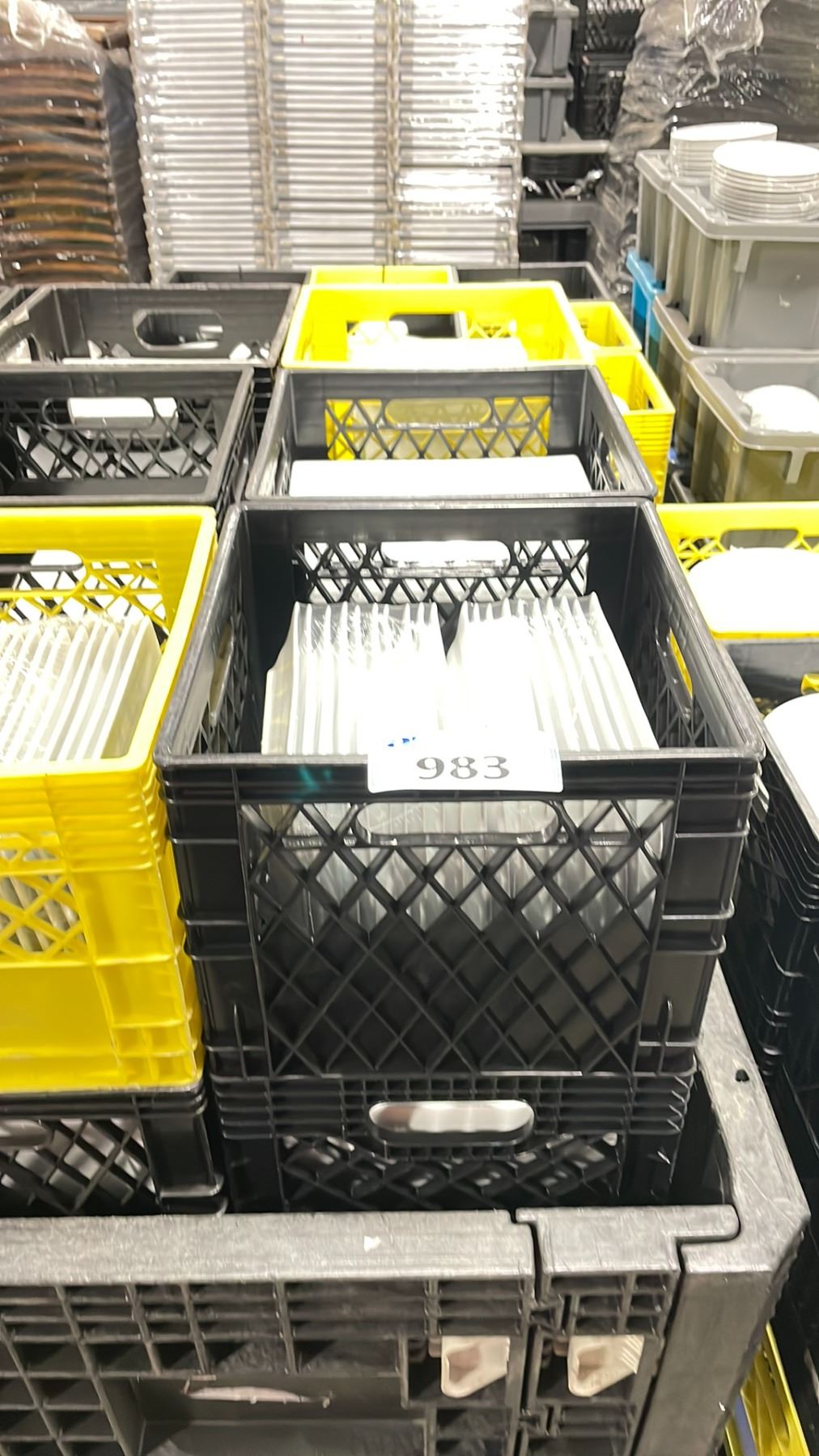 12 PLASTIC CRATES OF ASSORTED WHITE COMMERCIAL RESTAURANT APPETIZER PLATES *PLASTIC CRATES INCLUDED* ( APPROX. 20 PLATES PER CRATE )