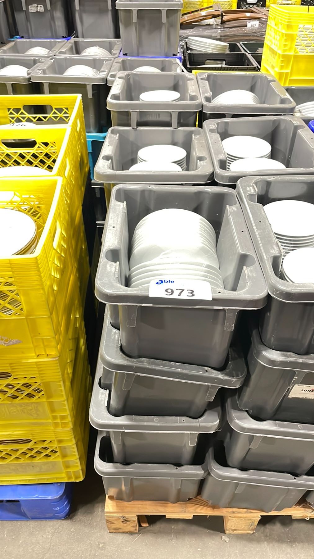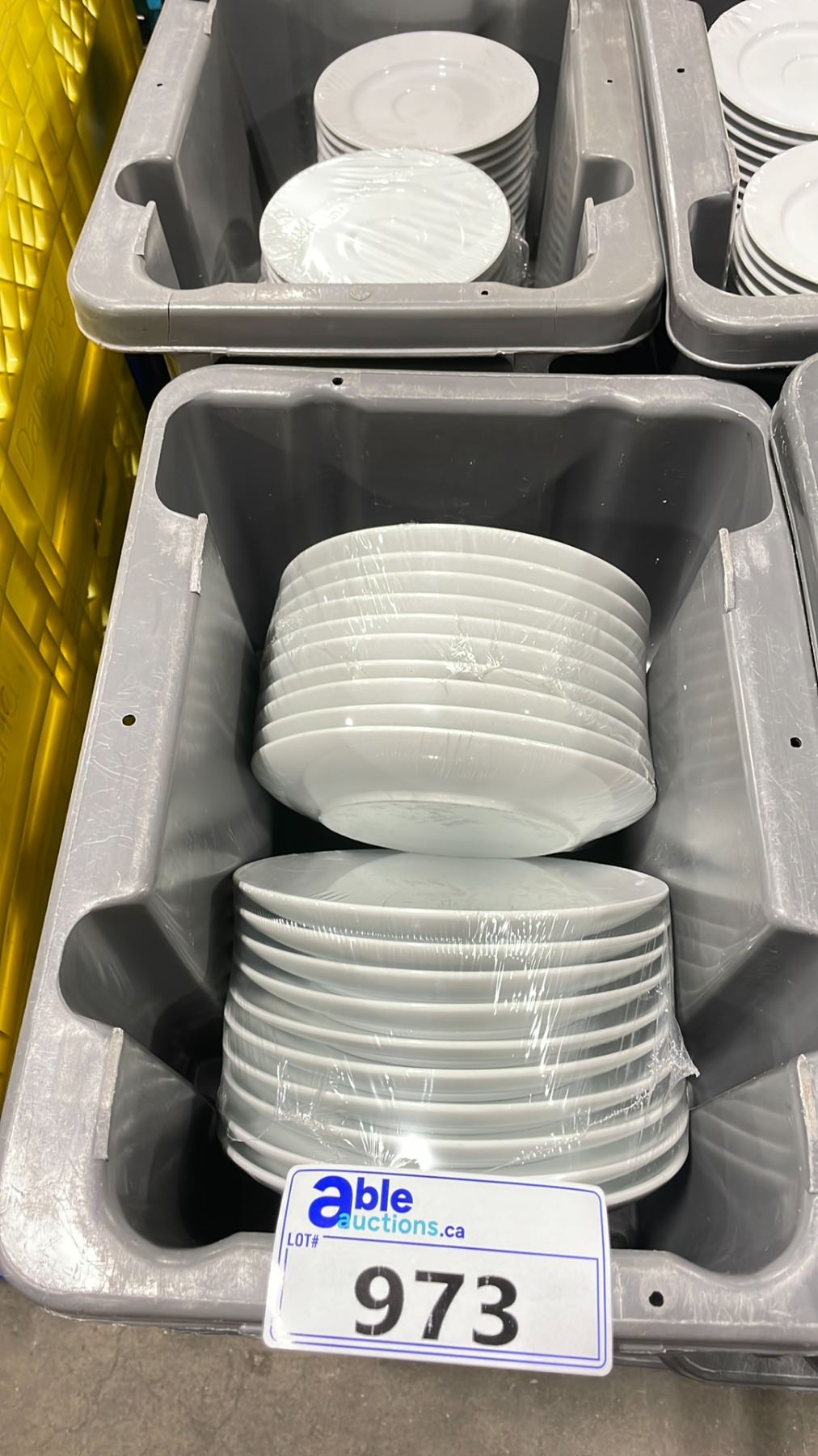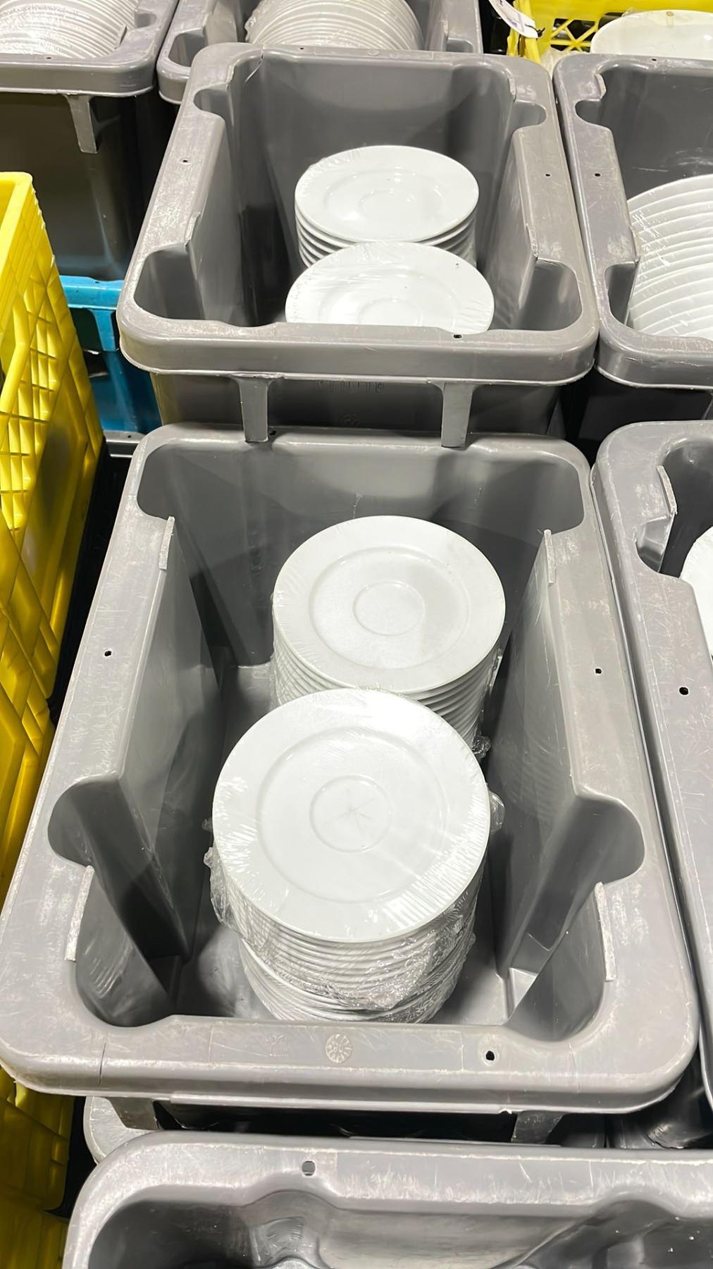 12 PLASTIC CRATES OF WHITE COMMERCIAL RESTAURANT SIDE PLATES / SAUCERS *PLASTIC CRATES INCLUDED* ( APPROX. 20 PLATES PER CRATE )