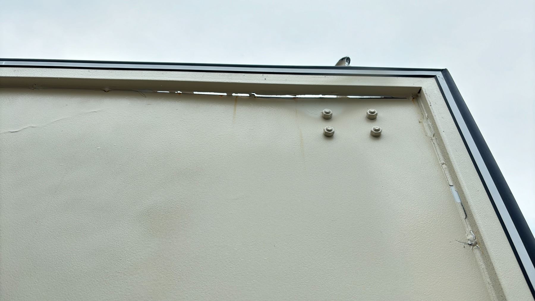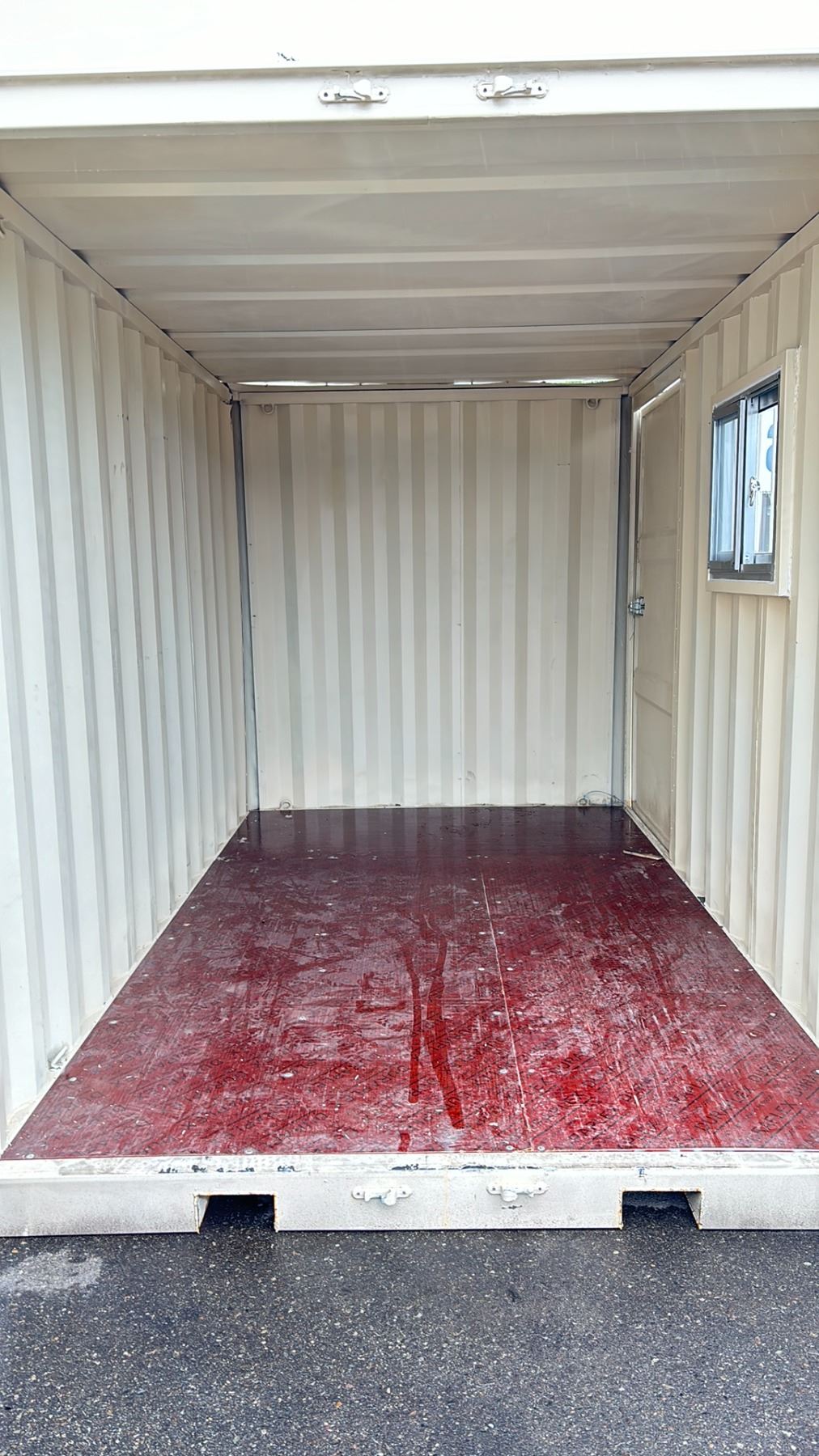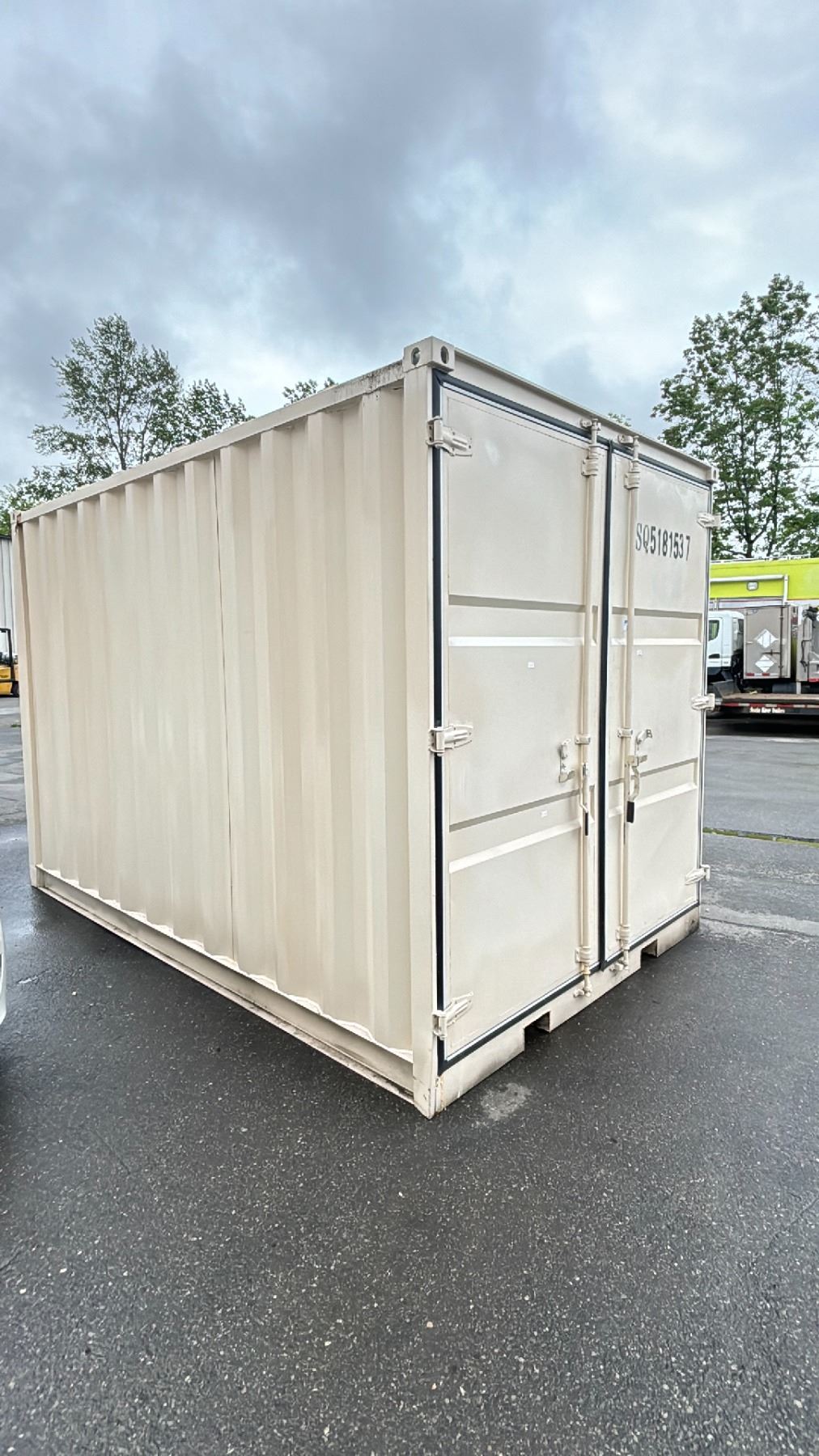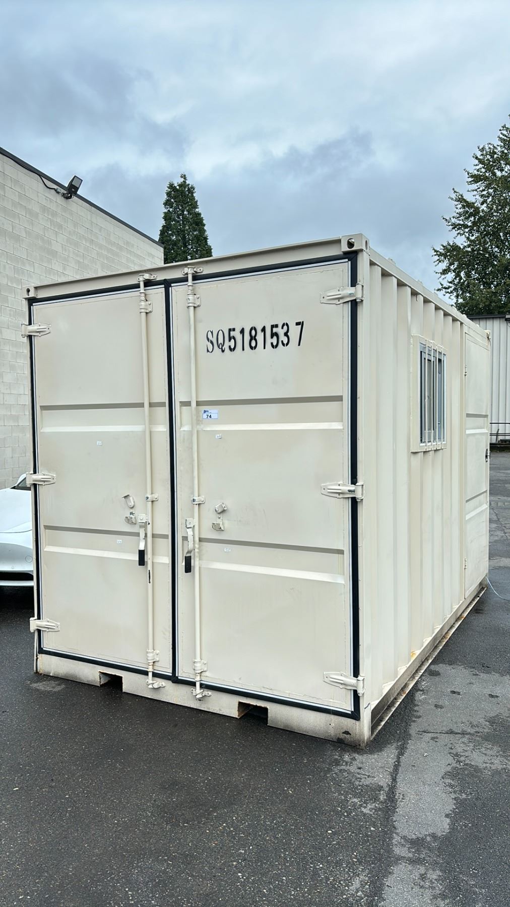 ** 12FT BEIGE OFFICE STORAGE SHIPPING CONTAINER 143"L X 85"W X 95"H WITH DUAL SWING REAR DOORS CAMS, SIDE MAN DOOR & WINDOW ** HAS DAMAGE/DENTS TO ROOF + CORNERS, MAN DOOR IS STIFF TO SHUT ( PICTURES OF DAMAGE INCLUDED ) **