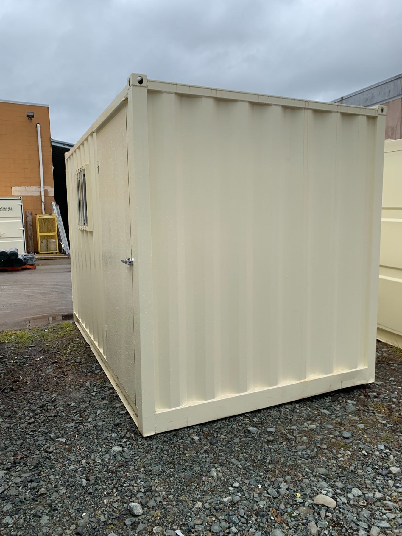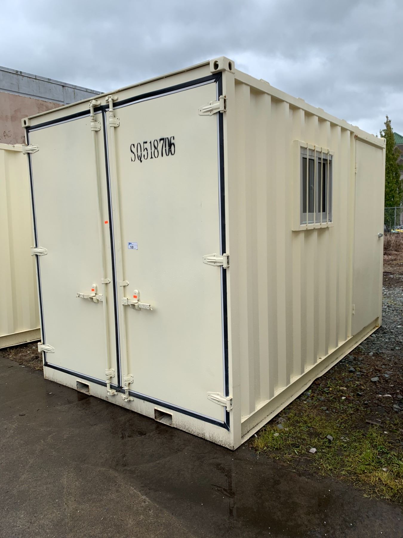 12FT CREAM OFFICE STORAGE SHIPPING CONTAINER WITH DUAL SWING REAR DOORS WITH CAMS, SIDE MAN DOOR & WINDOW 142"X86'X94"