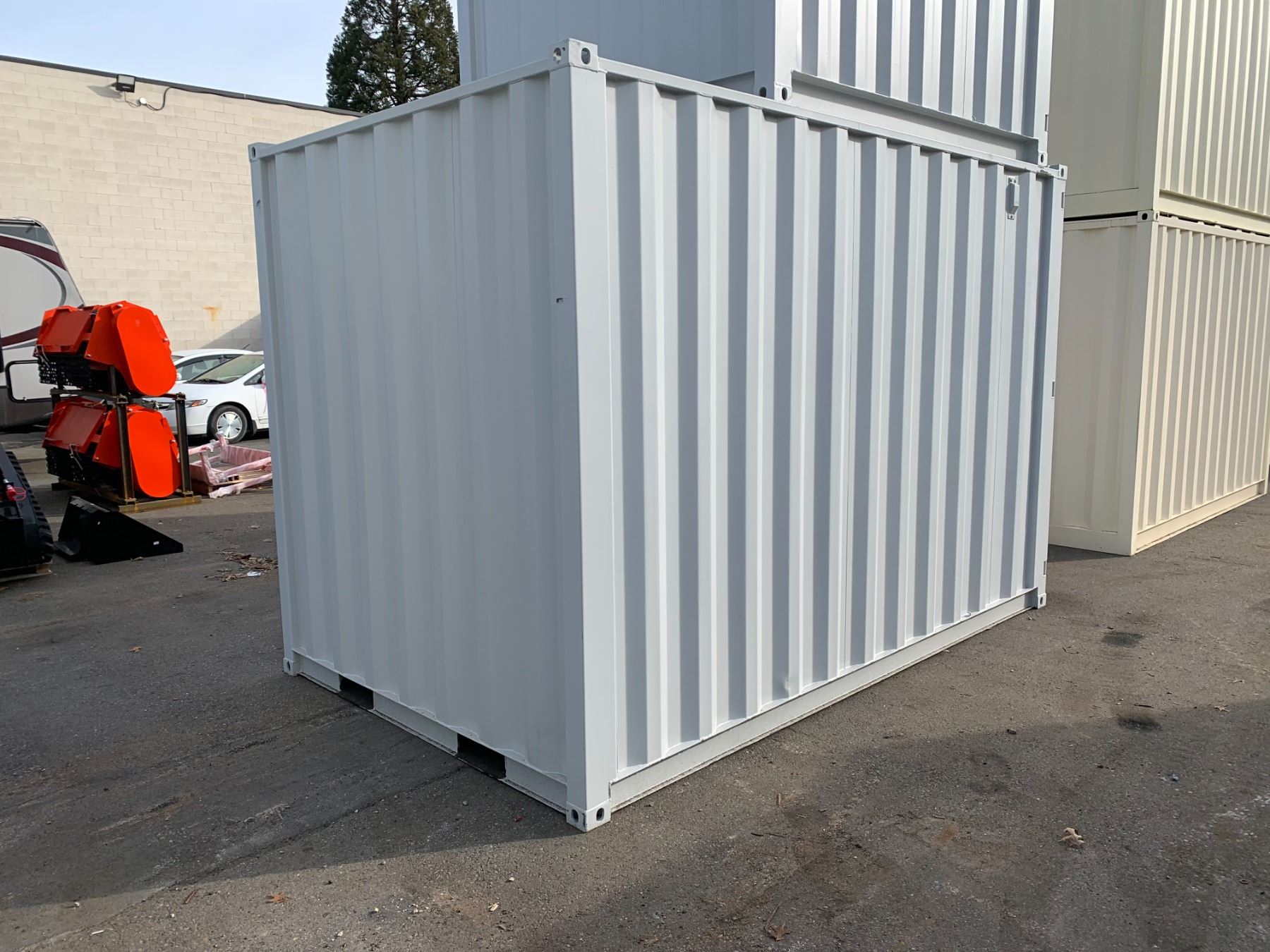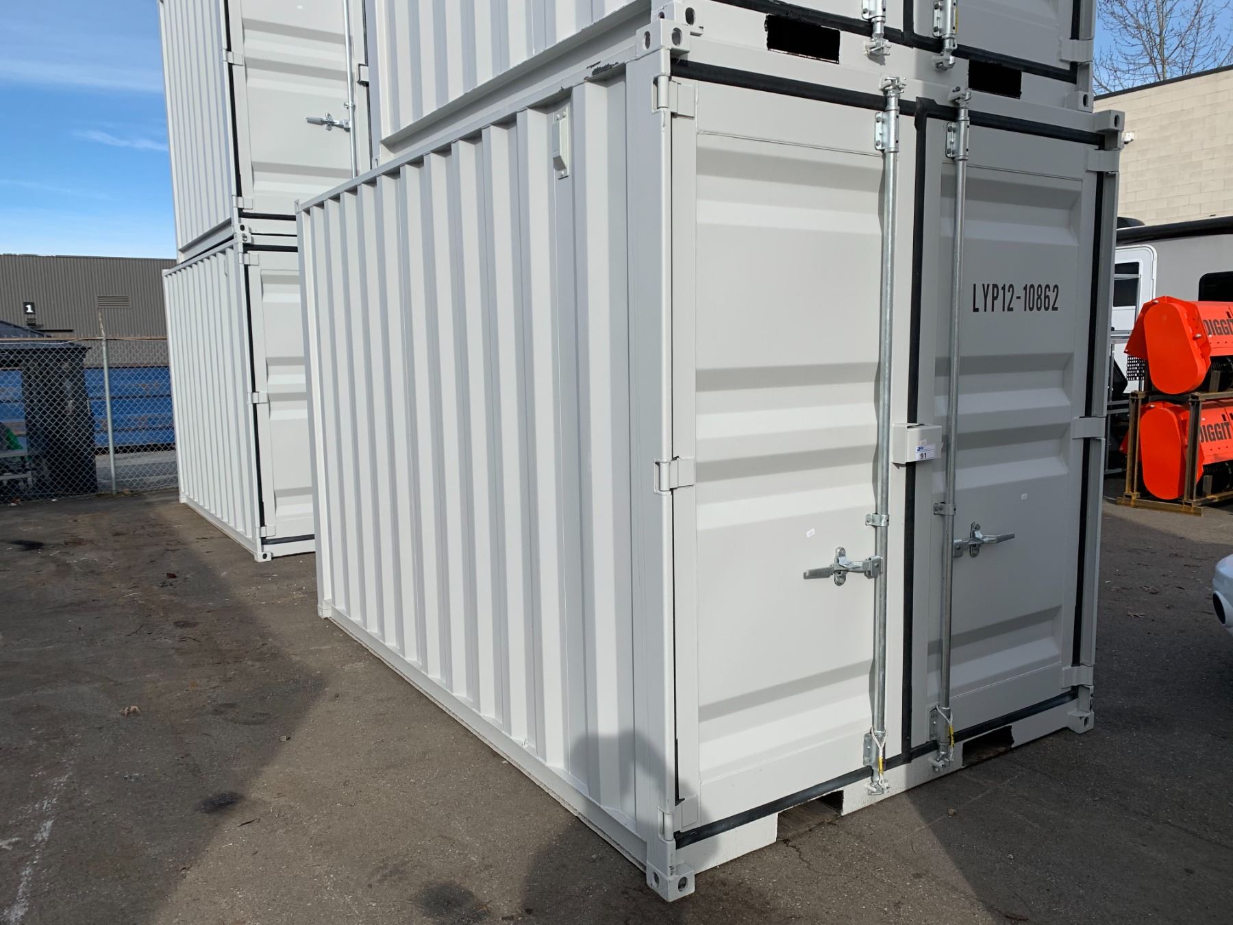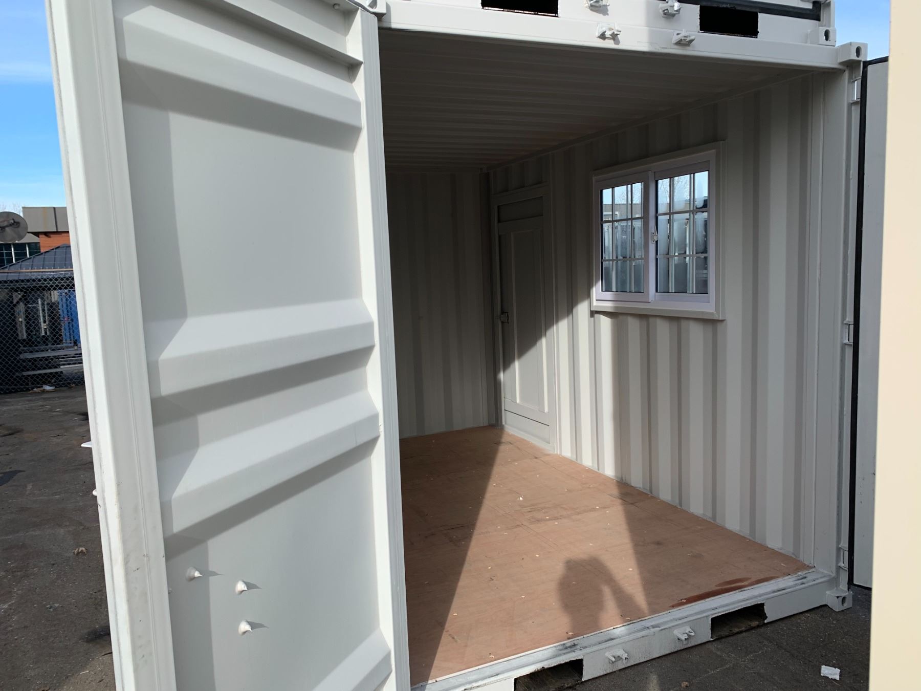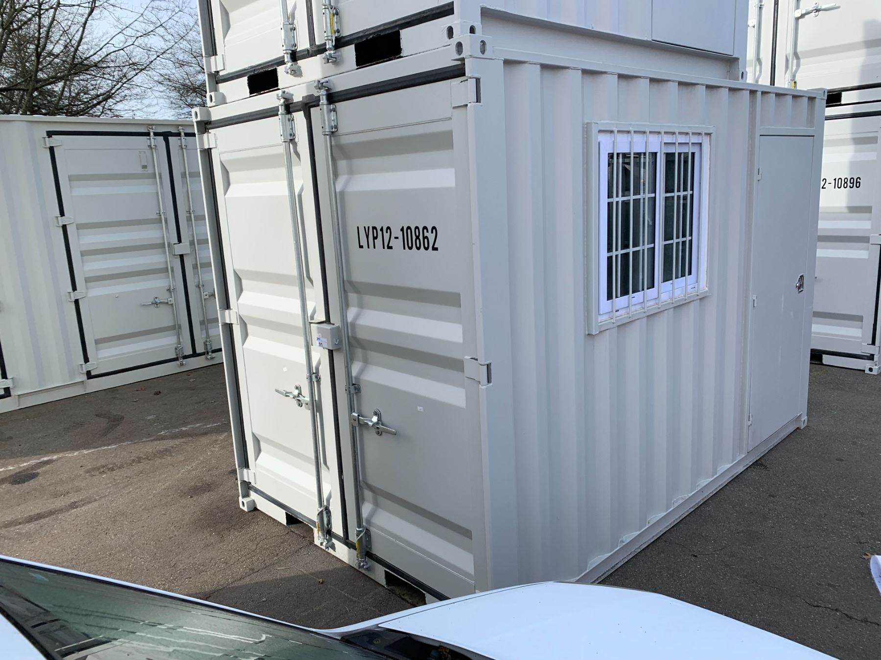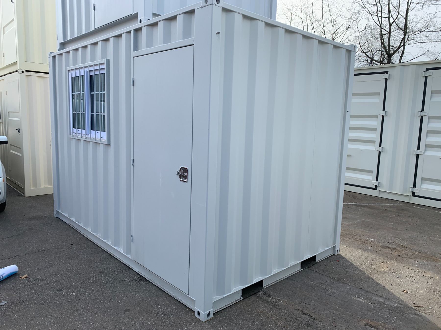 12FT GREY OFFICE STORAGE SHIPPING CONTAINER 144"L X 87.5"W X 99"H WITH DUAL SWING REAR DOORS WITH CAMS, SIDE MAN DOOR & WINDOW