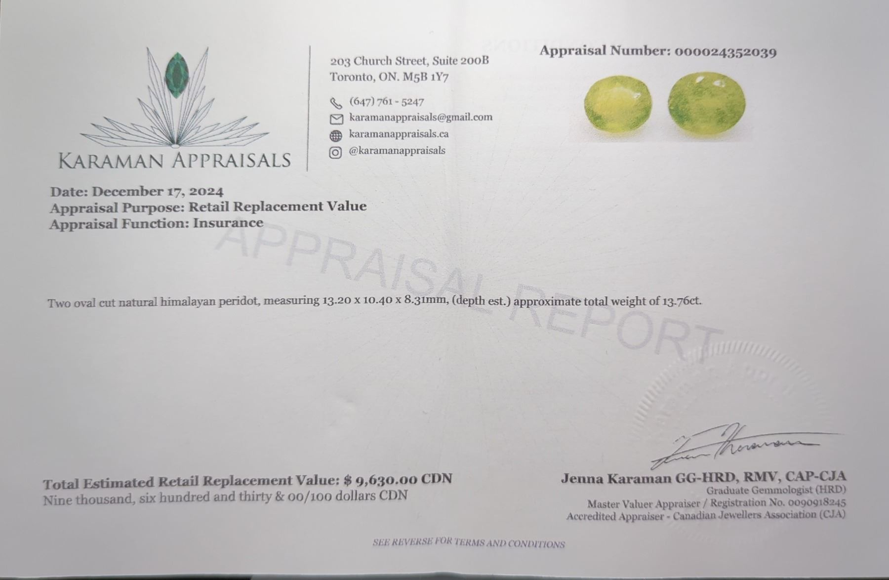 13.76 CT CERTIFIED PERIDOT GEMSTONE PAIR ($9,630 APPRAISAL) **APPRAISAL NOT GUARANTEED**