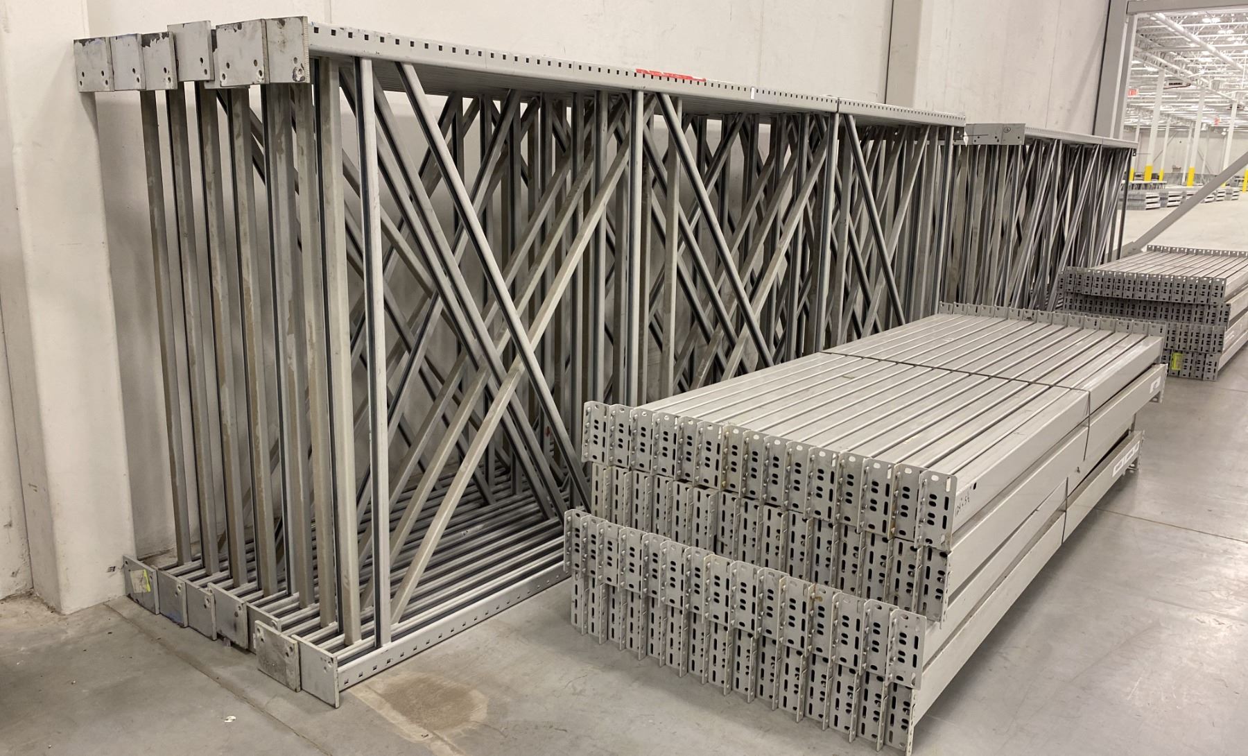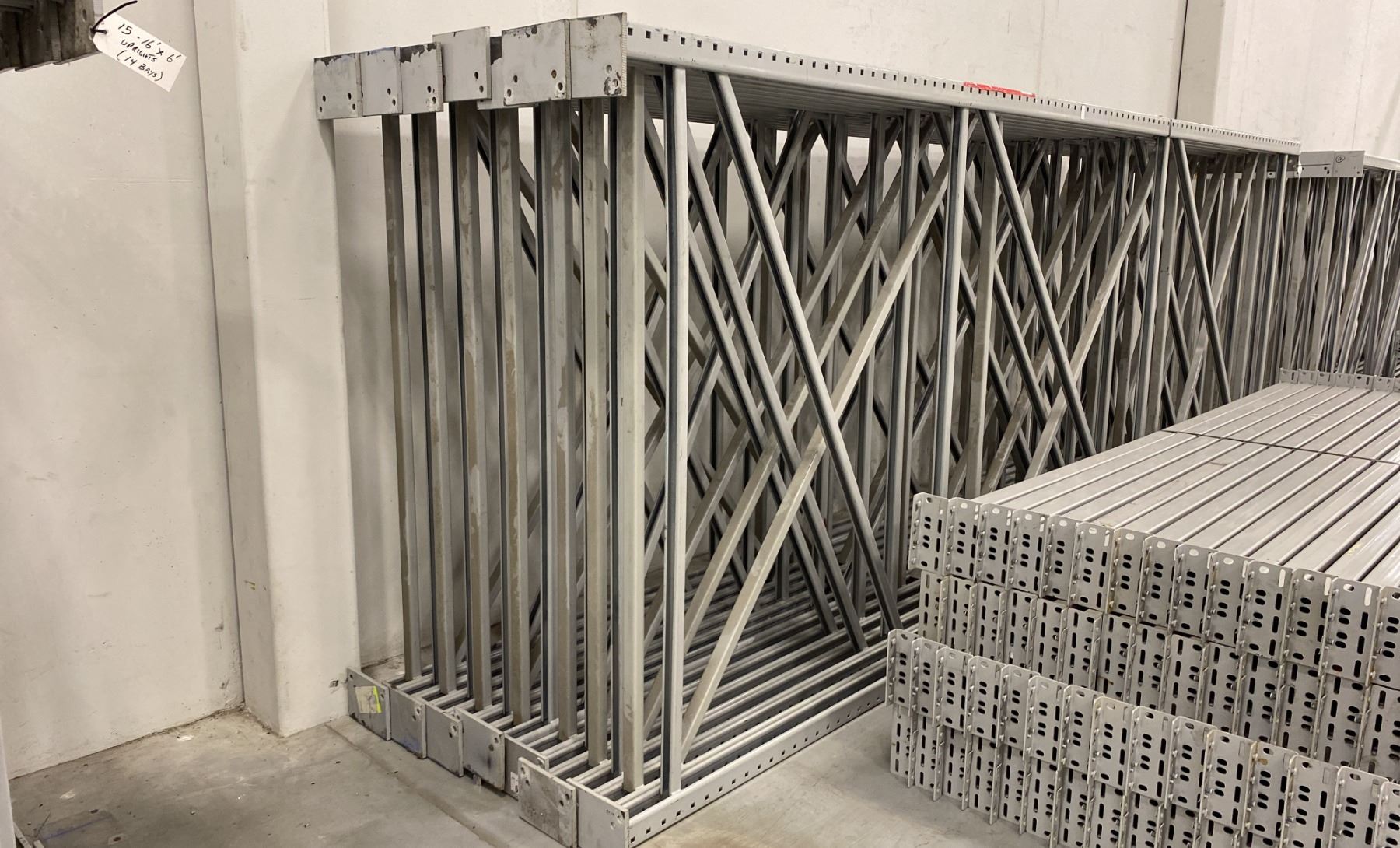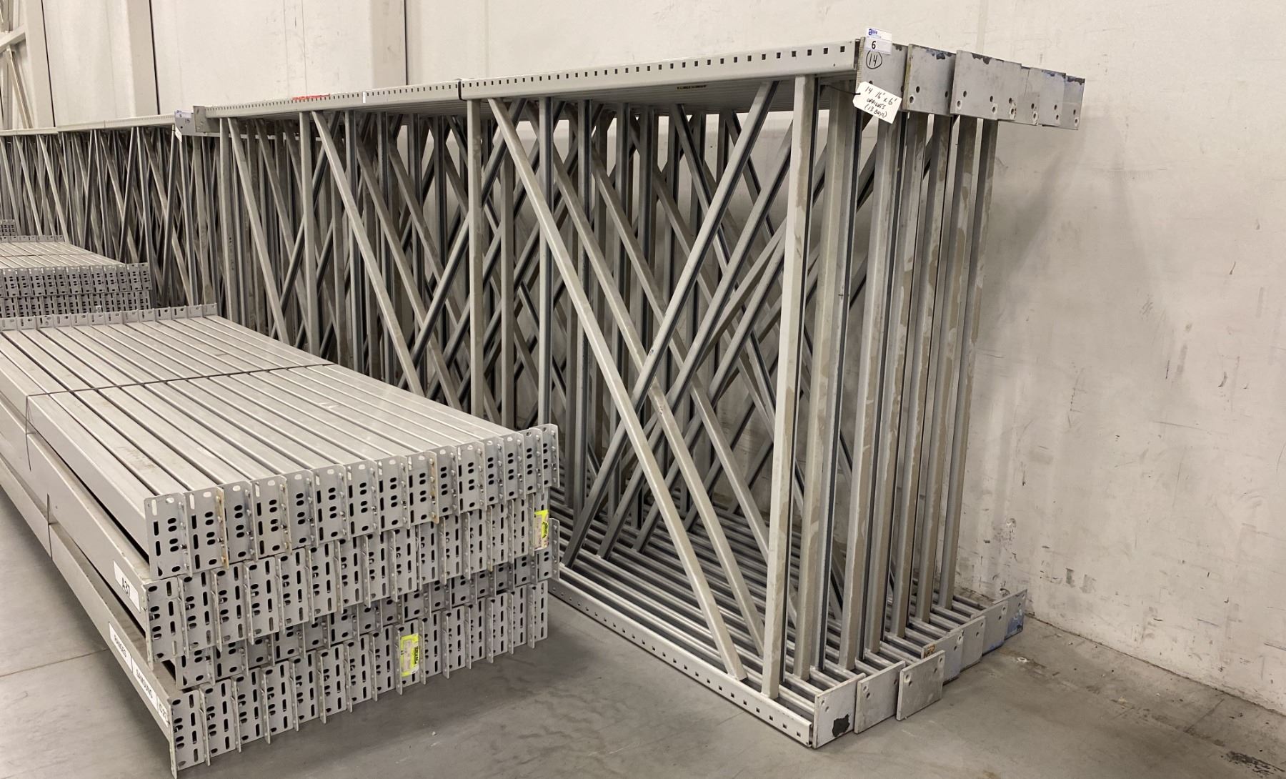 13 BAYS GREY INDUSTRIAL PALLET RACKING (14) UPRIGHTS 16FT X 6FT AND (60) SIDE BEAMS 124" X 5.5", WITH 8" X 6" WELDED FOOTPLATES 1/2" THICK