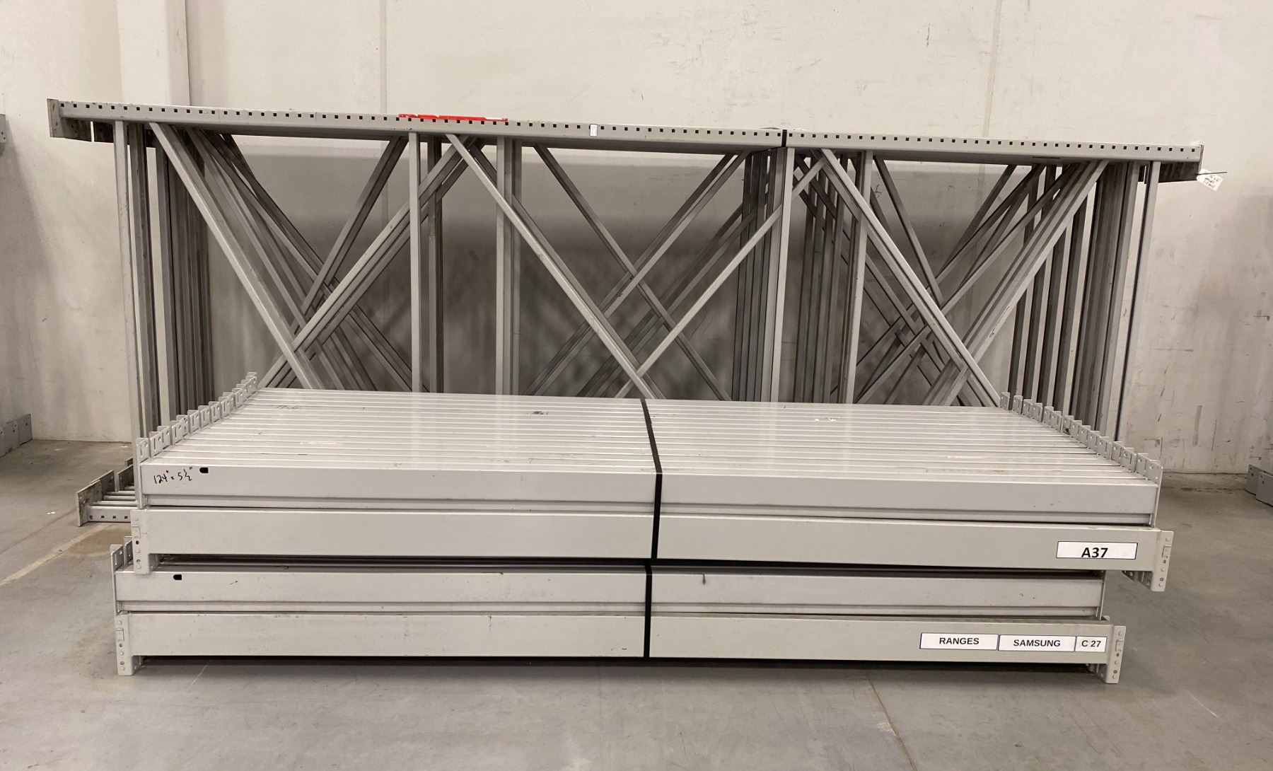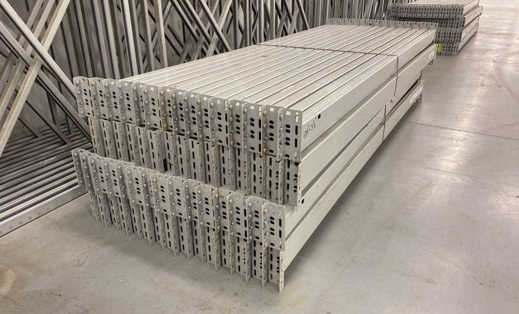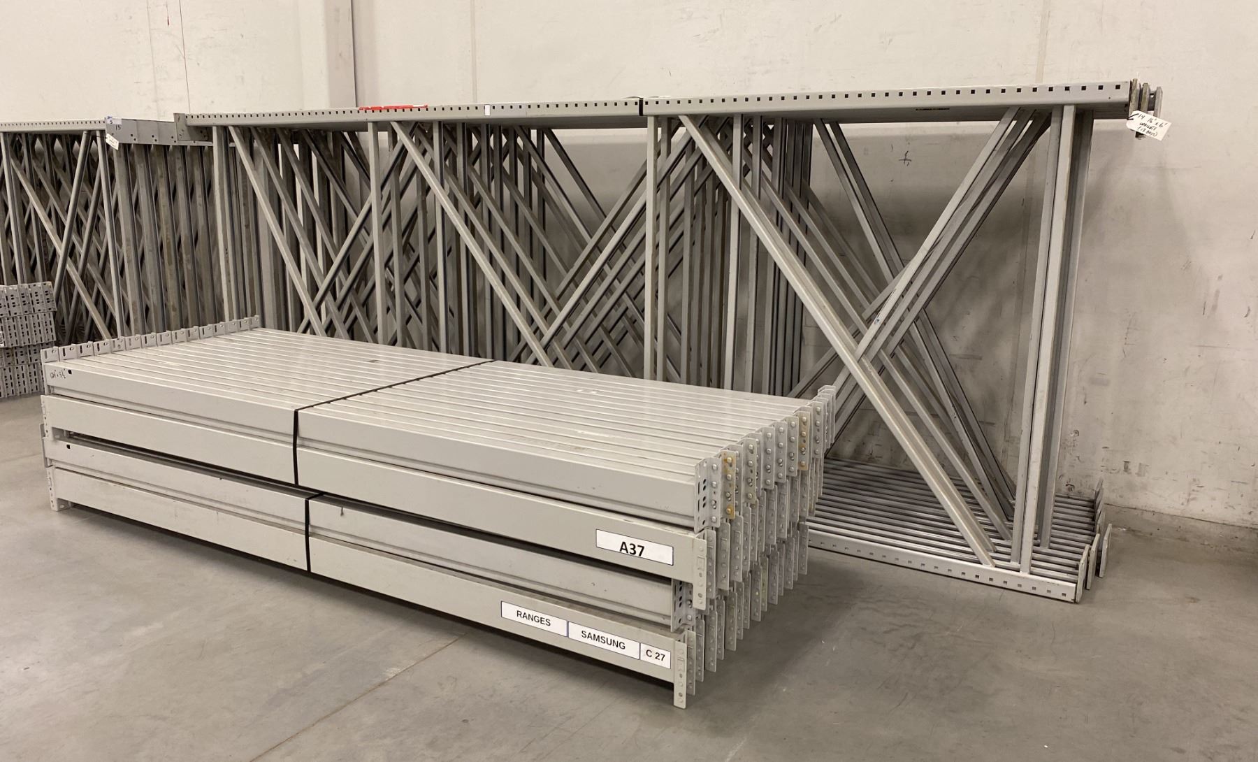 13 BAYS GREY INDUSTRIAL PALLET RACKING (14) UPRIGHTS 16FT X 6FT AND (60) SIDE BEAMS 124" X 5.5", WITH 8" X 6" WELDED FOOTPLATES 1/2" THICK