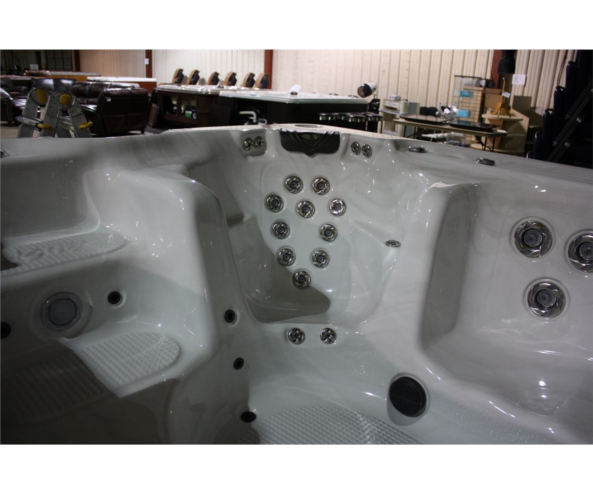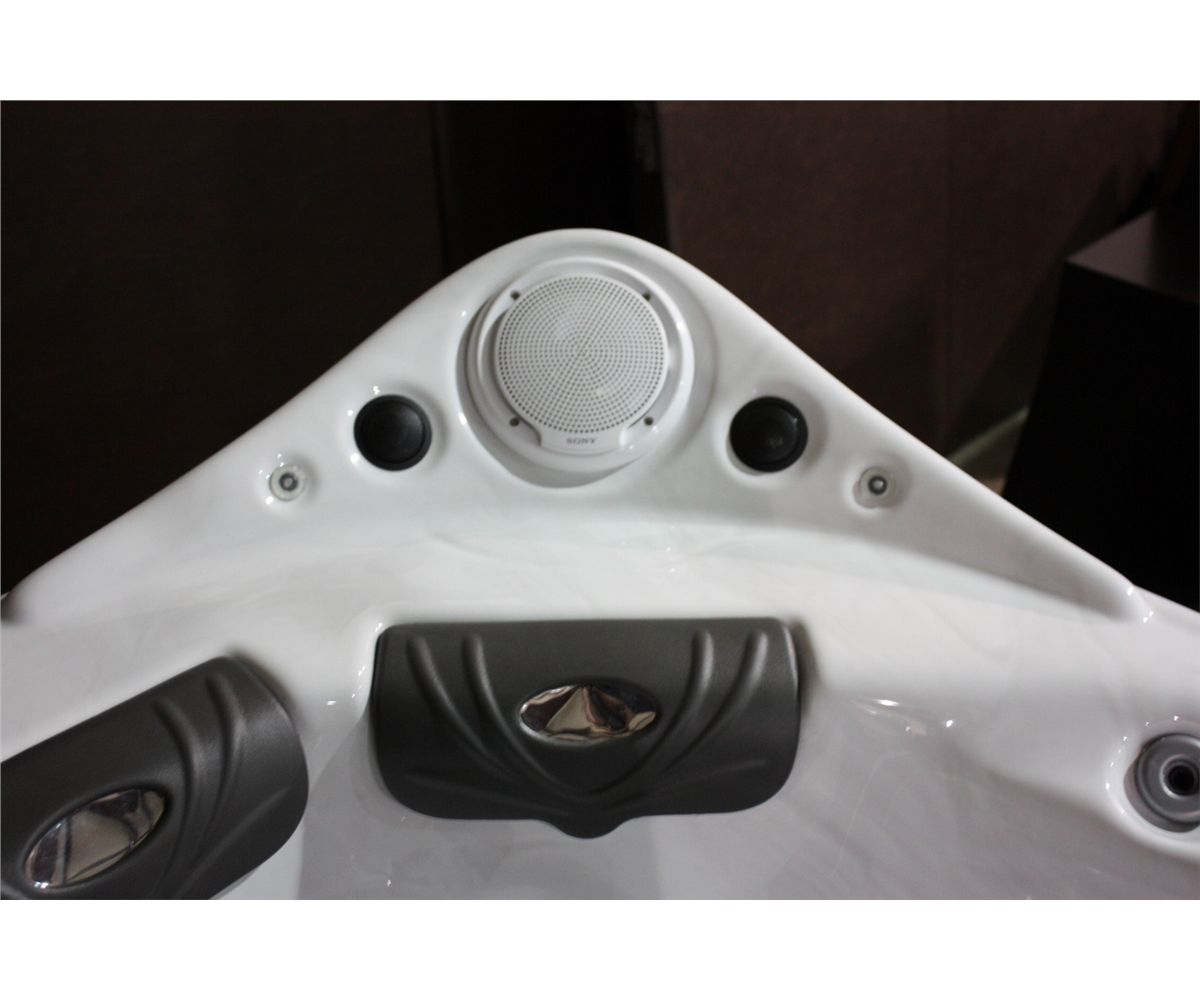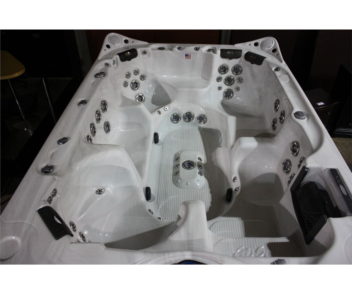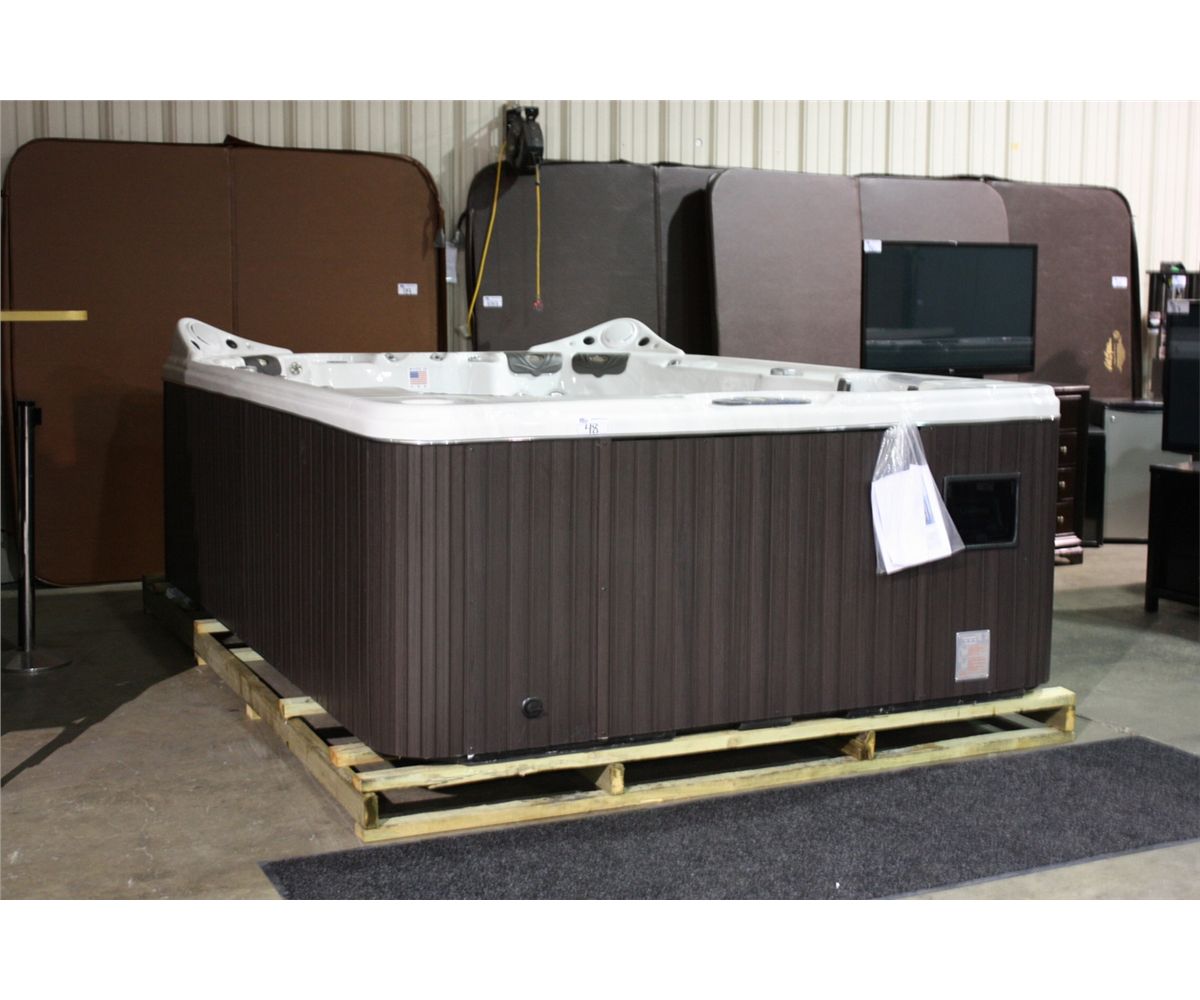 130" X 92" CAL SPAS DIAMOND SERIES HOT TUB WITH STERLING SILVER INTERIOR AND PREF. SMOKE CABINET. INCLUDES: 70 SS JETS, 3 X 5.0 HP PUMPS, PURE-SILK OZONATOR, XL 5.5 KW HEATER, SONY MARINE GRADE CD STEREO SYSTEM WITH DOCK AND SONY EXTREME SPEAKERS, LOUNGER, CENTRE CONSOLE FOOT MASSAGER, 2 TOUCH CONTROL PANELS, DUAL BASKET SURFACE FILTER, 24/7 AQUA CLEAR FILTRATION SYSTEM, LED DUAL HYDRO STREAMERS, WATERFALL, FULL LIGHTING PACKAGE. MOD. XL-S11-DI970A-11S-000718
