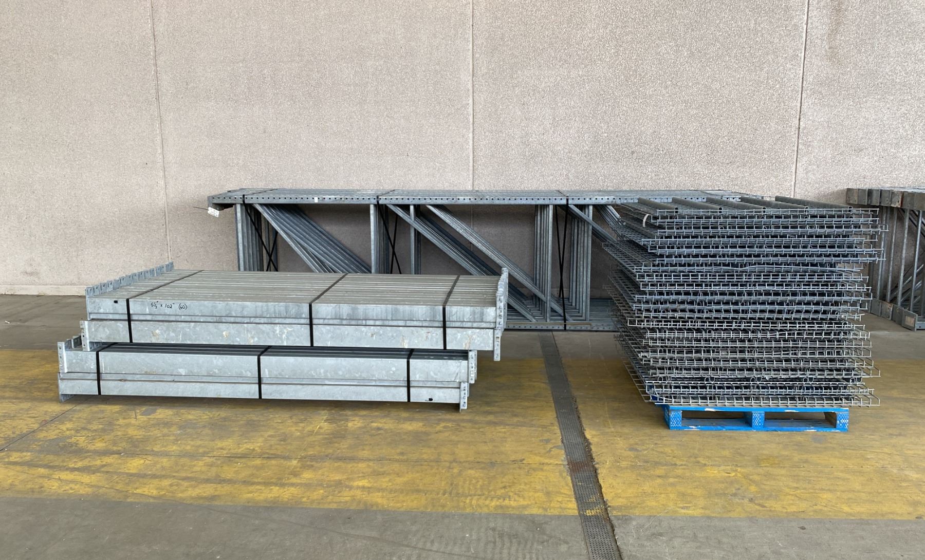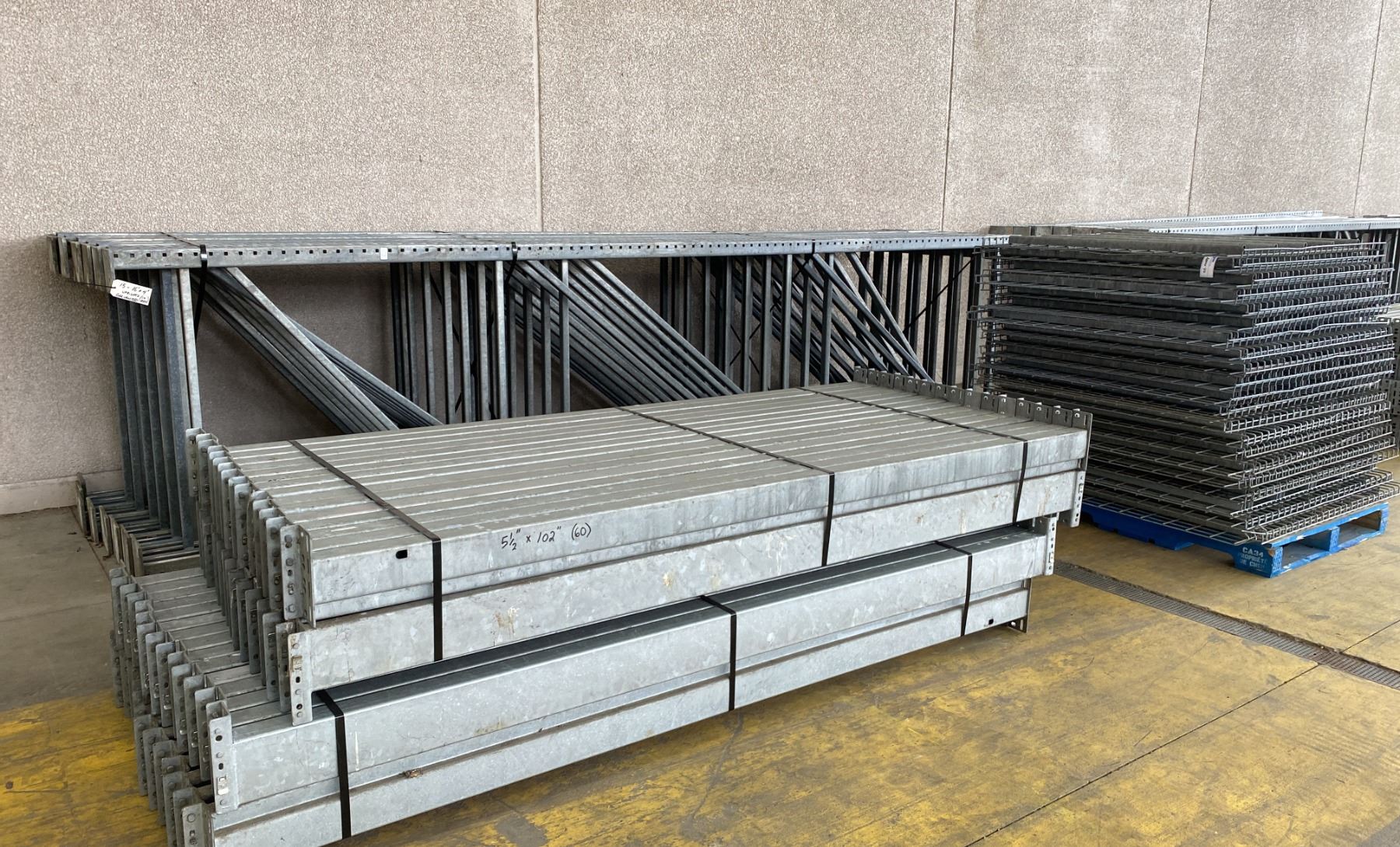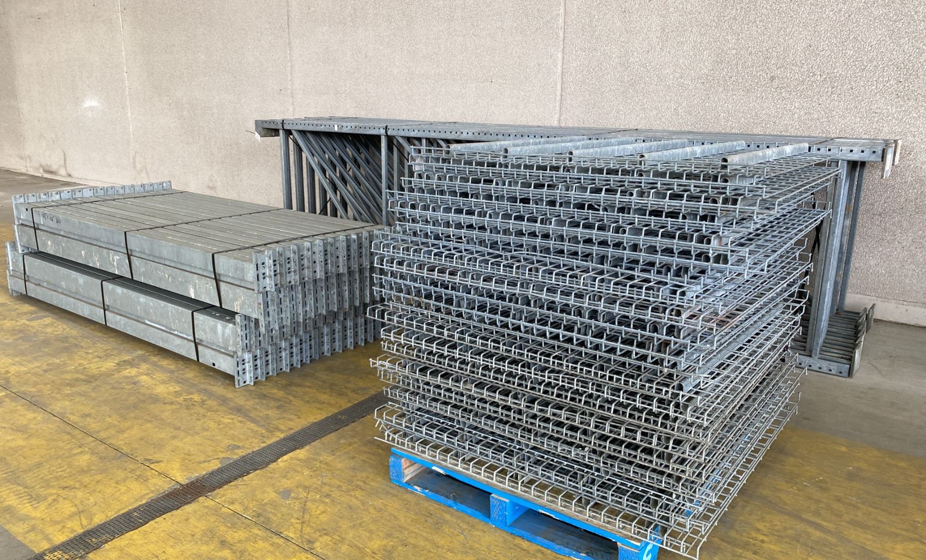 14 BAYS GALVANIZED INDUSTRIAL PALLET RACKING (15) UPRIGHTS 16FT X 4FT, (60) SIDE BEAMS 102" X 5.5" AND APPROX. 40 SECTIONS OF MESH DECKING, WITH 8" X 6" WELDED FOOTPLATES 1/2" THICK