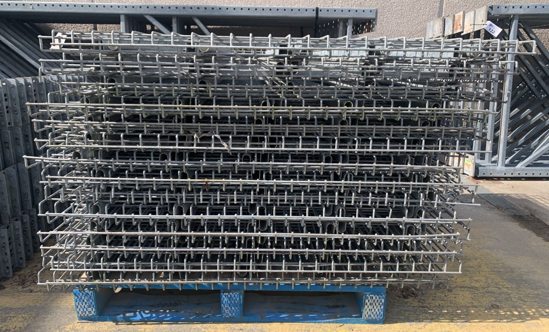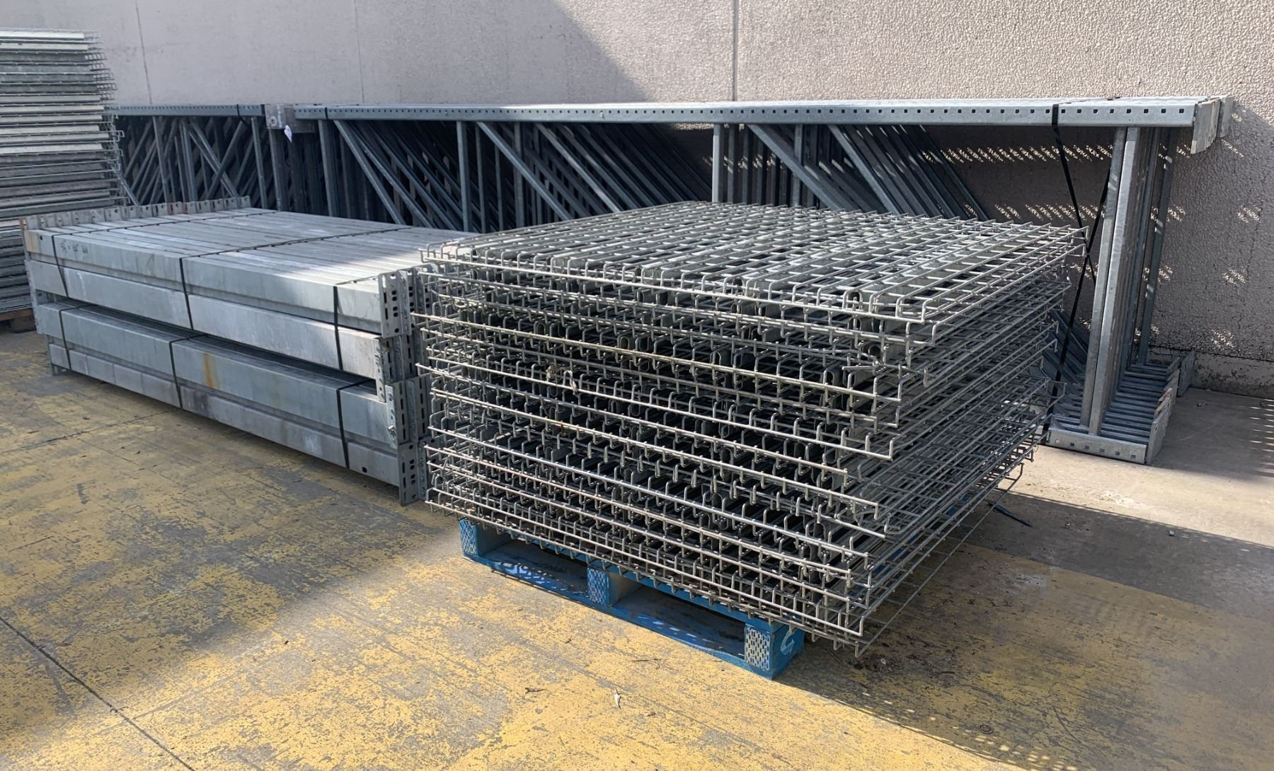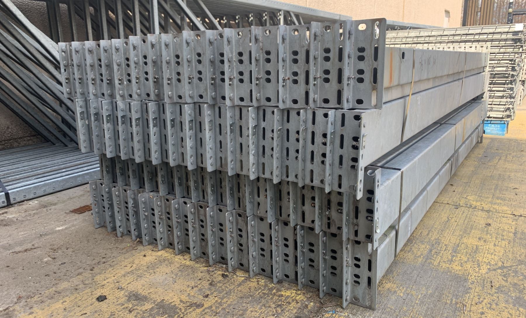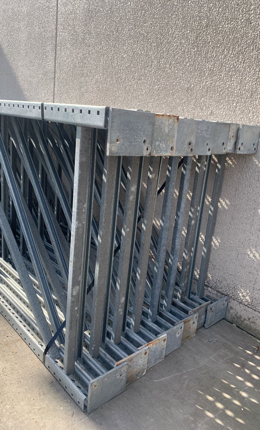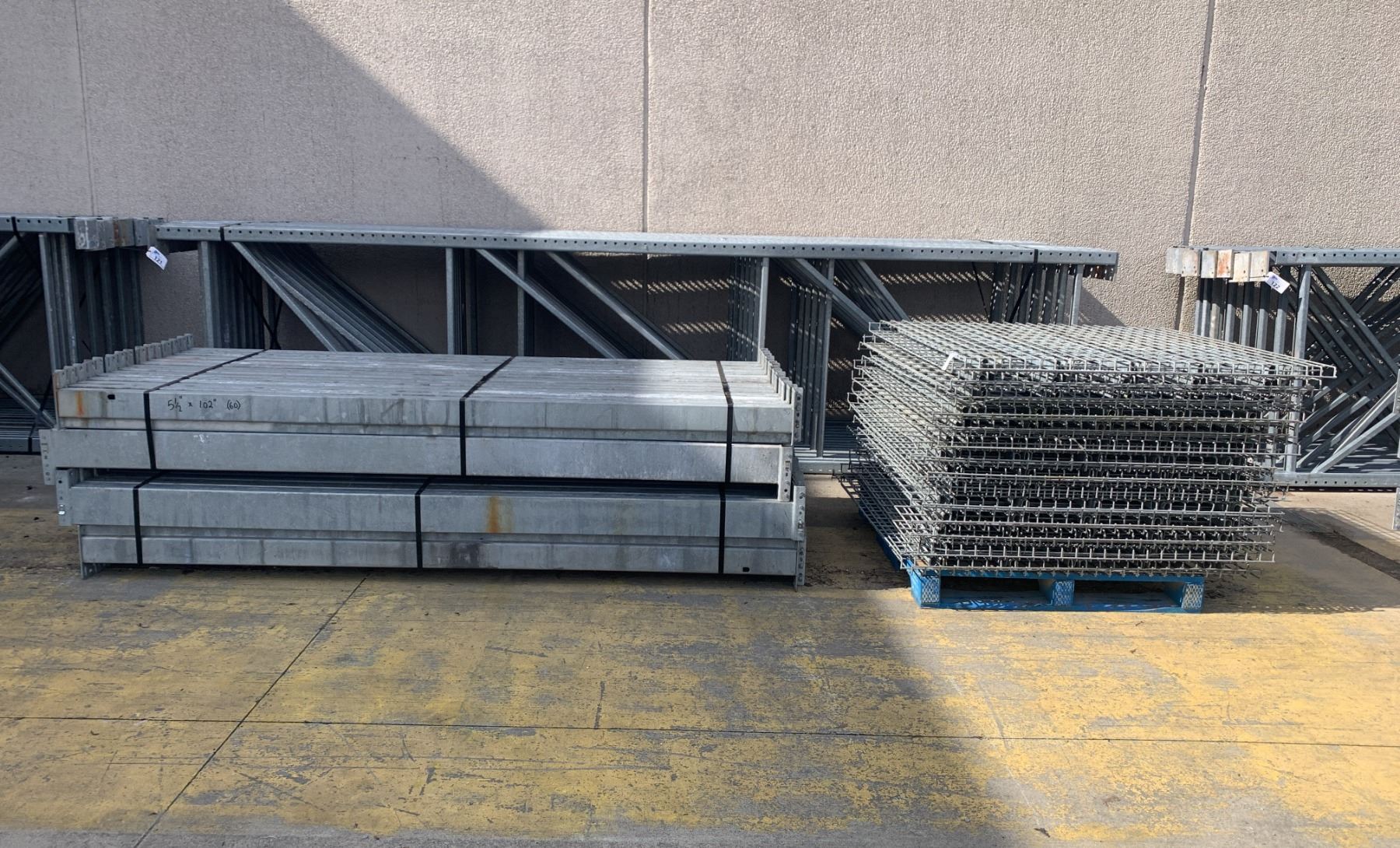 14 BAYS GALVANIZED INDUSTRIAL PALLET RACKING (15) UPRIGHTS 16FT X 4FT, (60) SIDE BEAMS 102" X 5.5" AND APPROX. (40) MESH DECK SHELVES WITH 8" X 6" WELDED FOOT PLATES 1/2" THICK