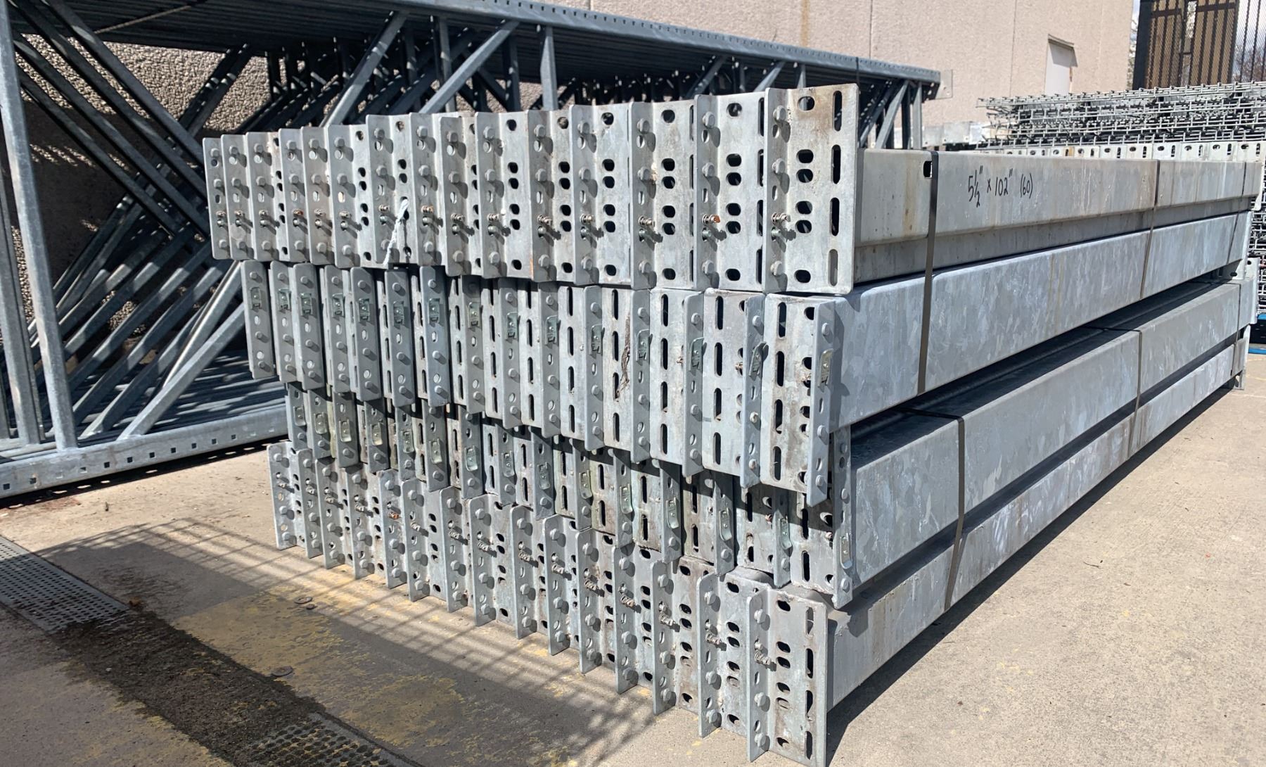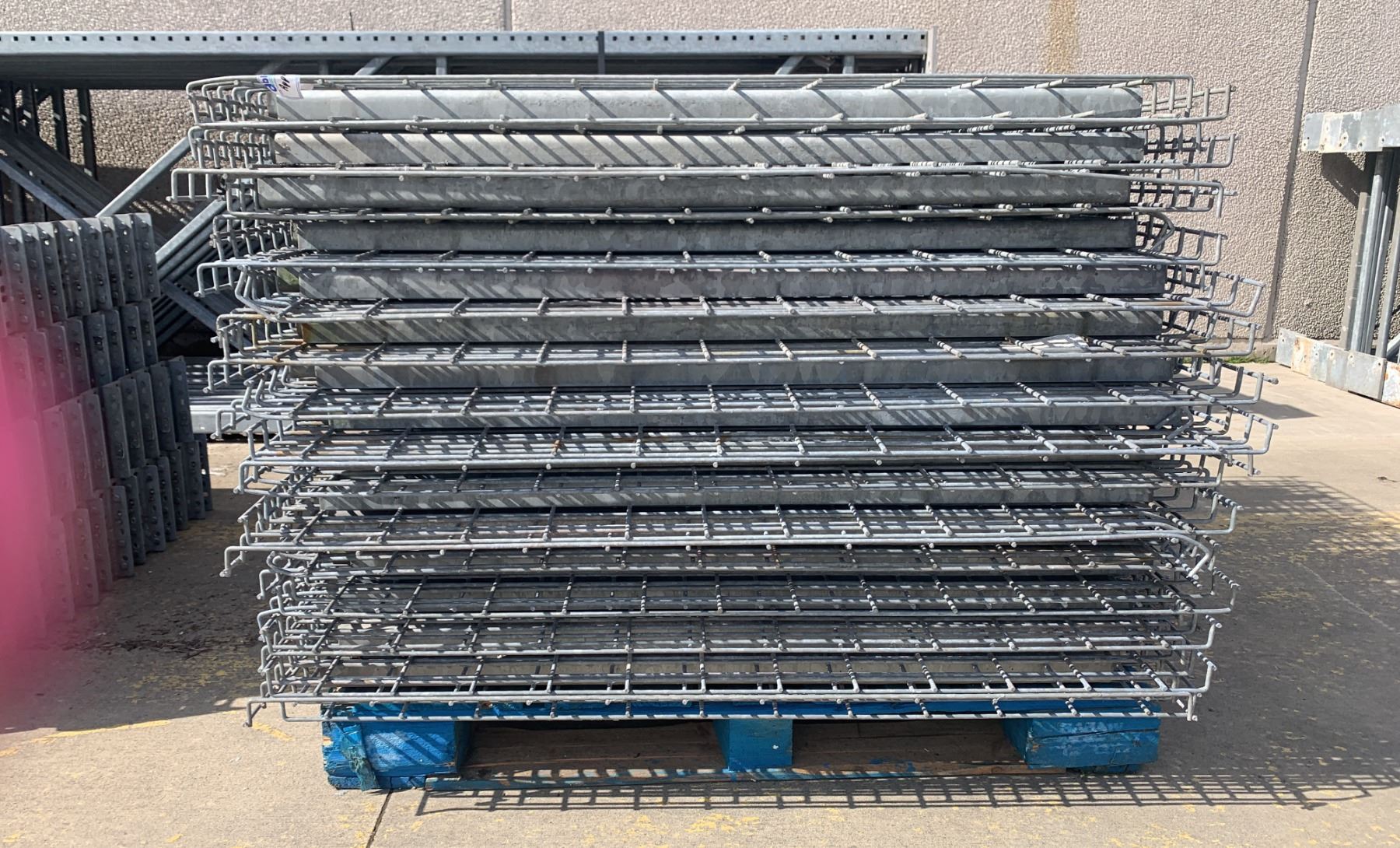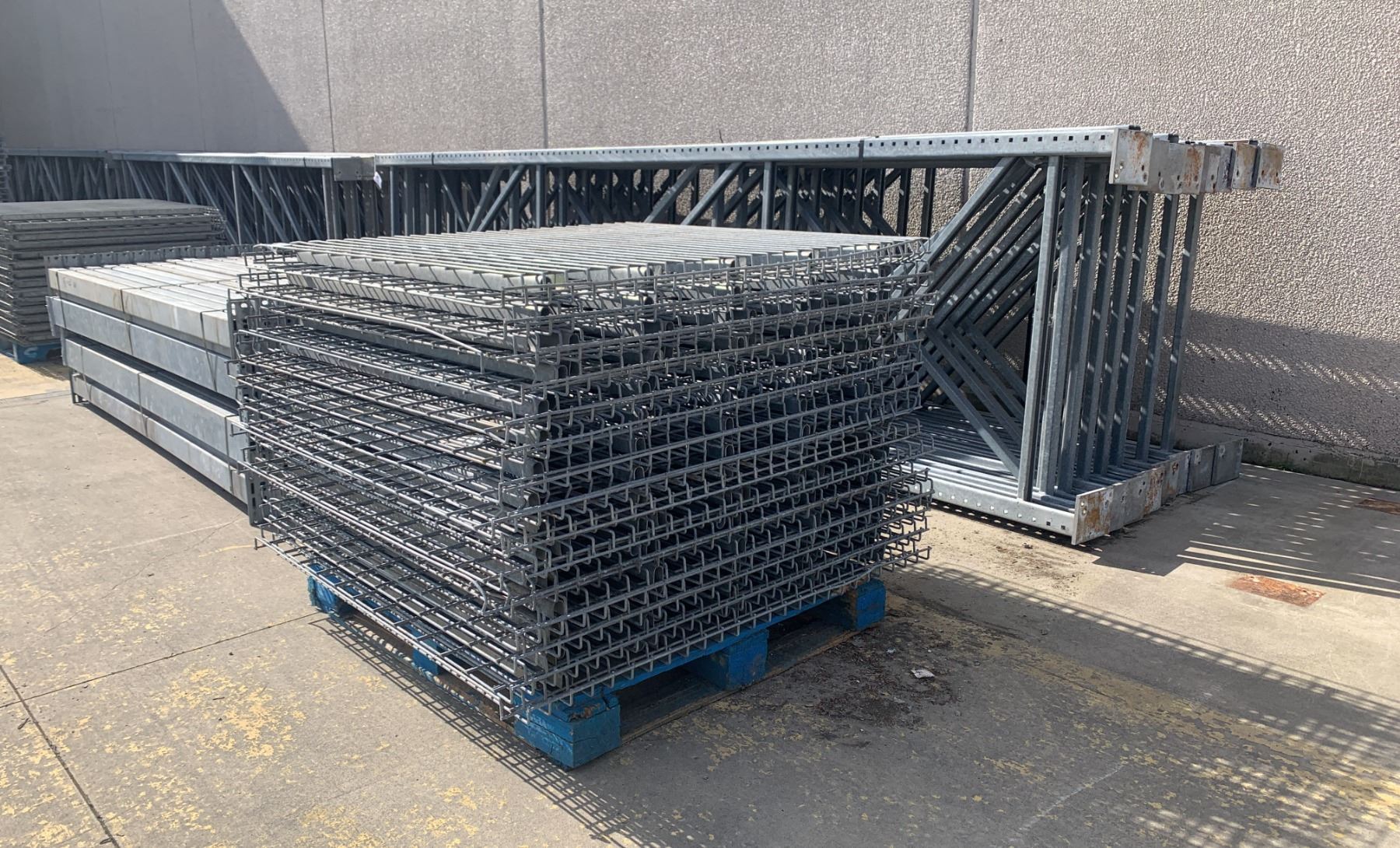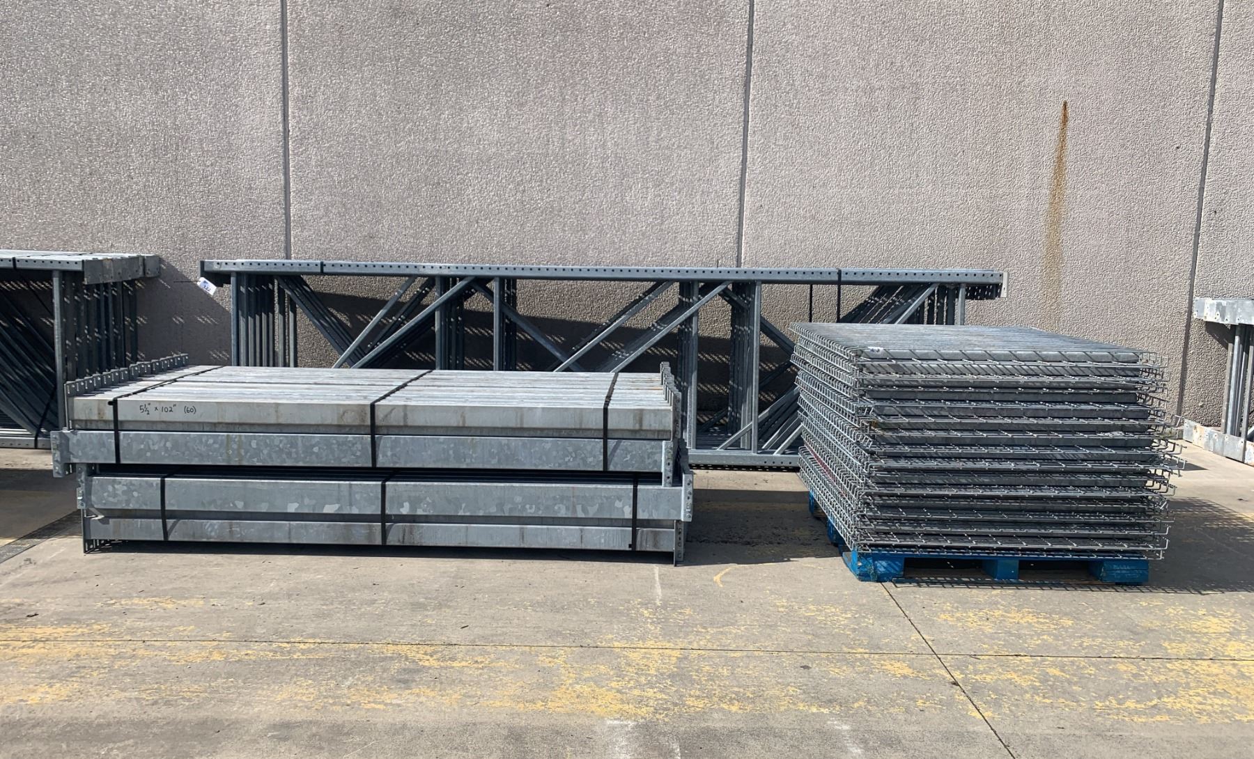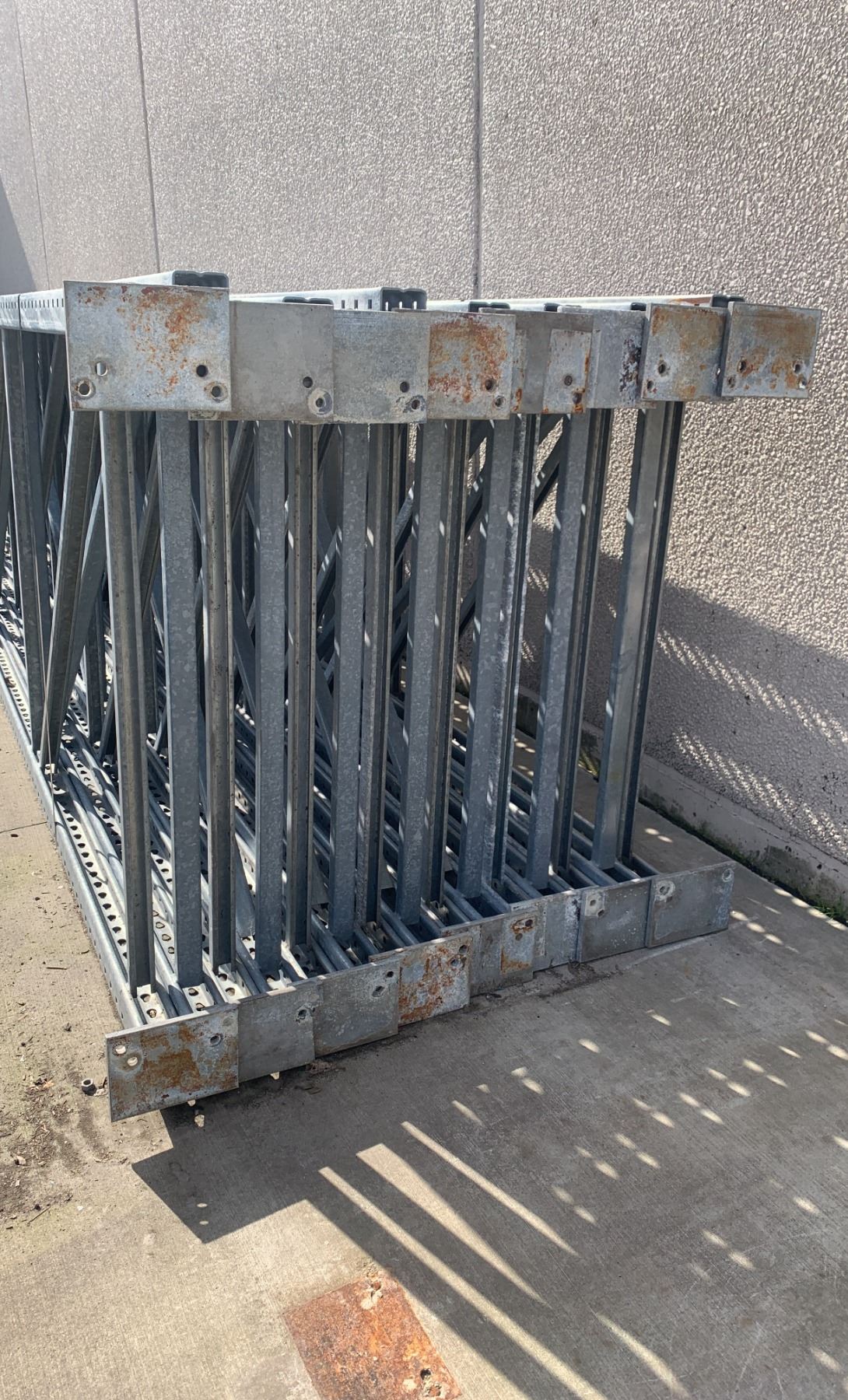 14 BAYS GALVANIZED INDUSTRIAL PALLET RACKING (15) UPRIGHTS 16FT X 4FT, (60) SIDE BEAMS 102" X 5.5" AND APPROX. (40) MESH DECK SHELVES WITH 8" X 6" WELDED FOOT PLATES 1/2" THICK