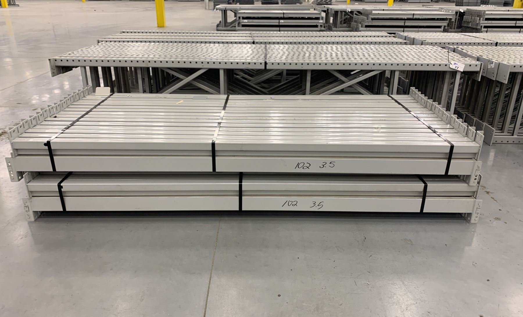 14 BAYS GREY INDUSTRIAL PALLET RACKING (15) UPRIGHTS 144" X 28" AND (60) SIDE BEAMS 102" X 3.5" WITH 8" X 6" WELDED FOOTPLATES 1/2" THICK