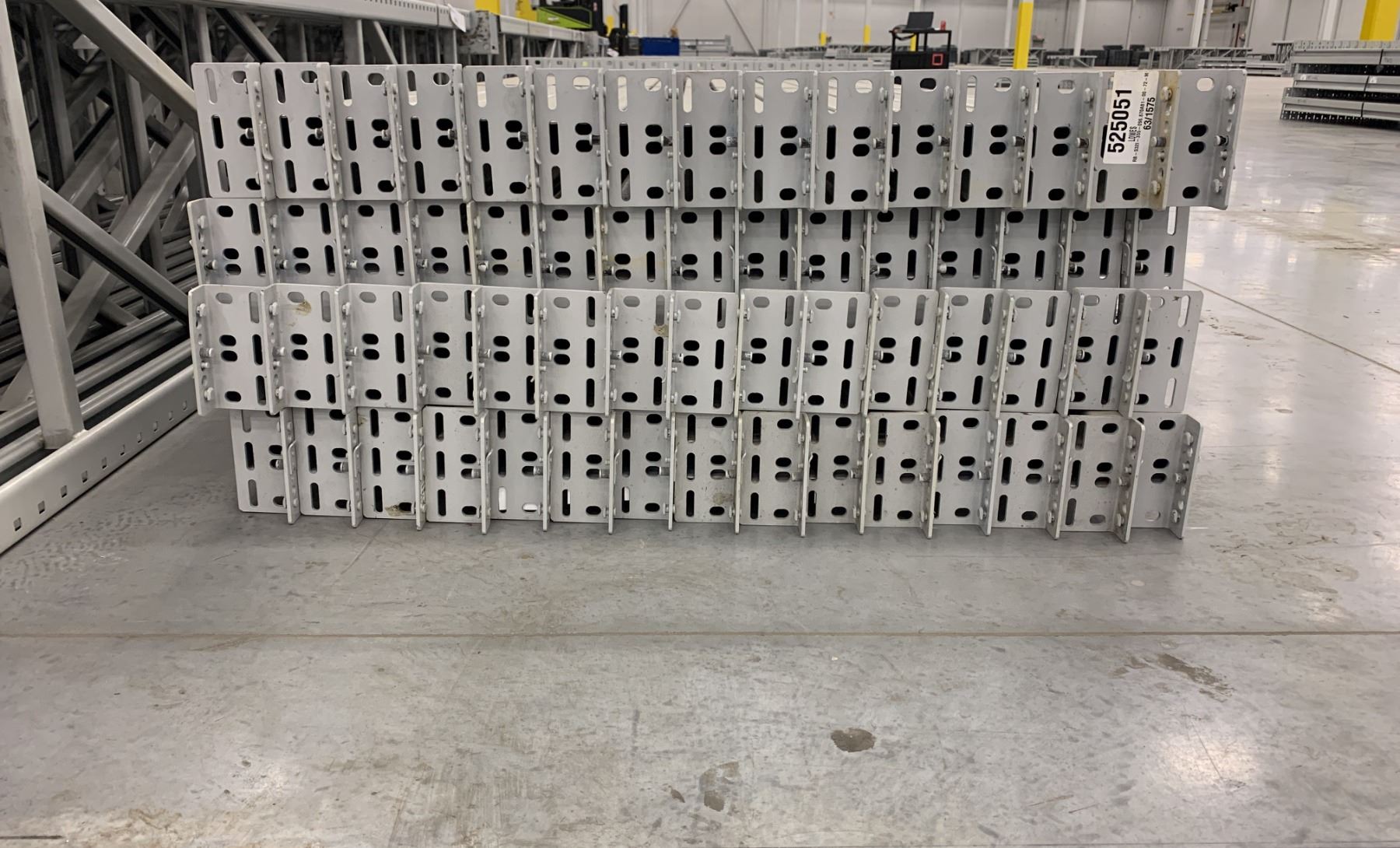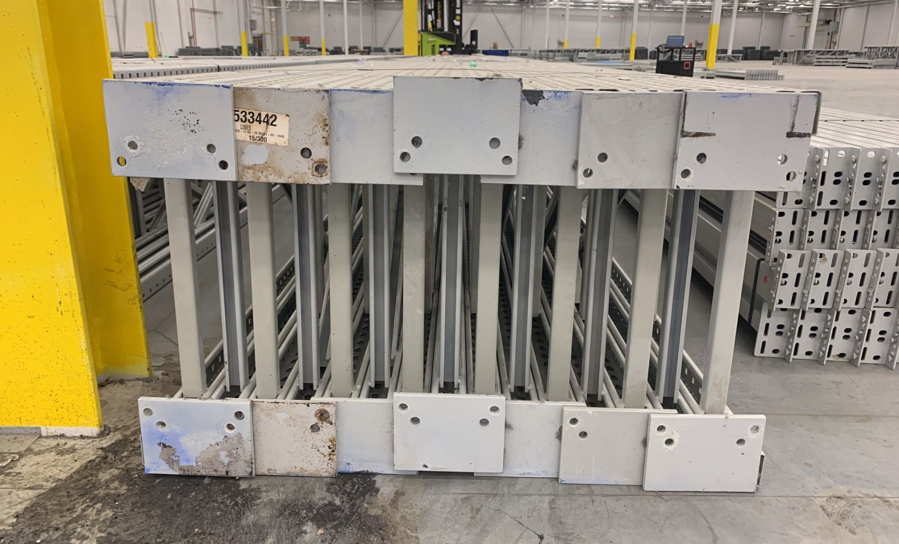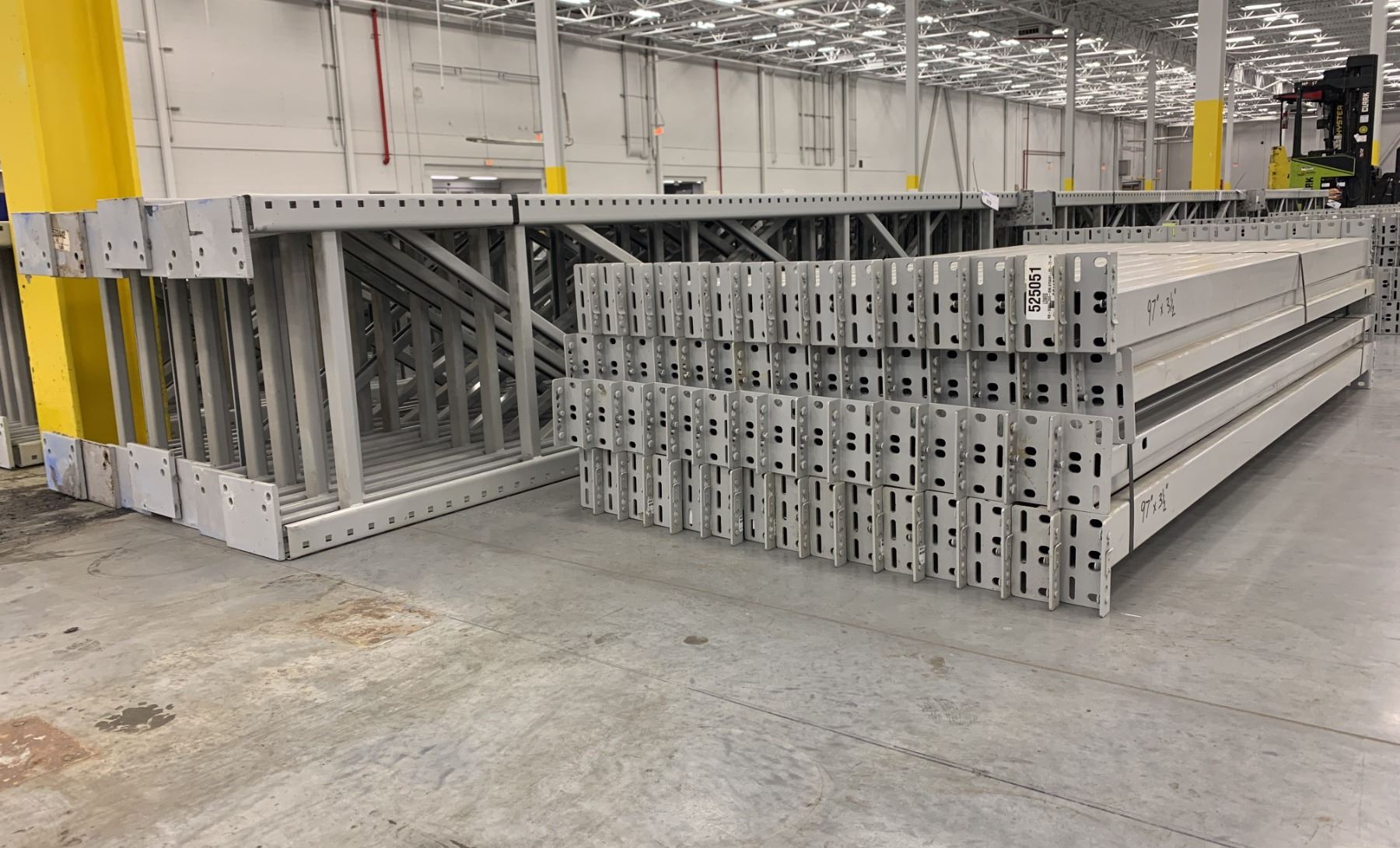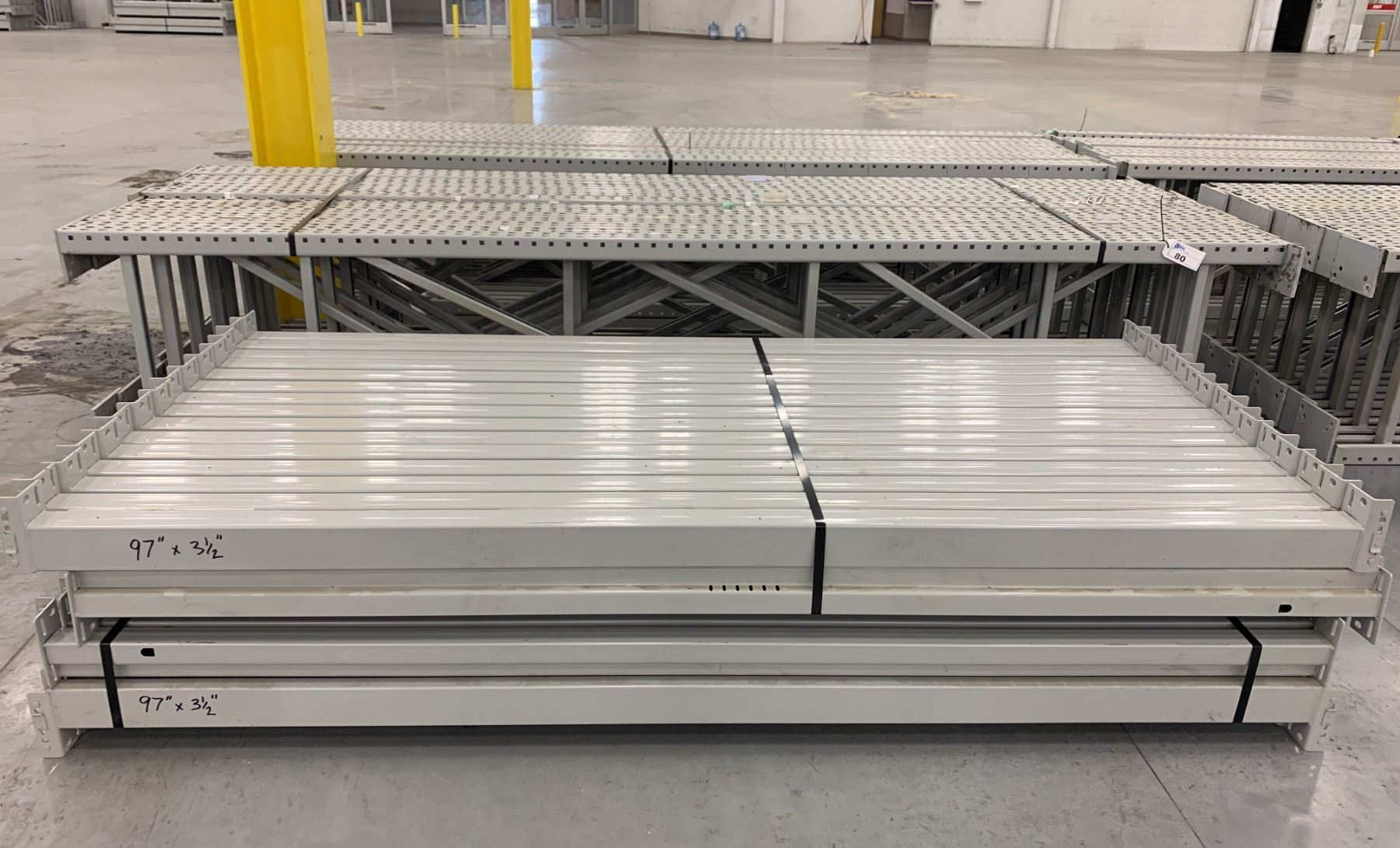 14 BAYS GREY INDUSTRIAL PALLET RACKING (15) UPRIGHTS 144" X 28" AND (60) SIDE BEAMS 102" X 3.5" WITH 8" X 6" WELDED FOOTPLATES 1/2" THICK