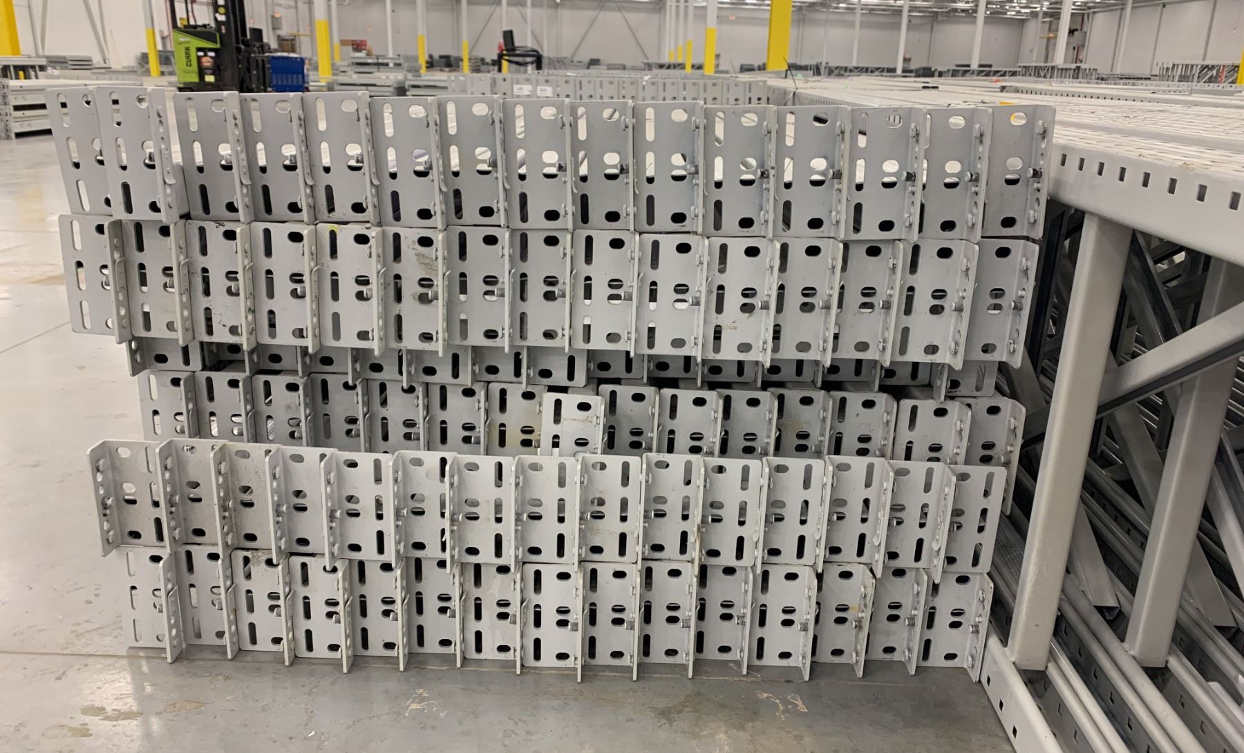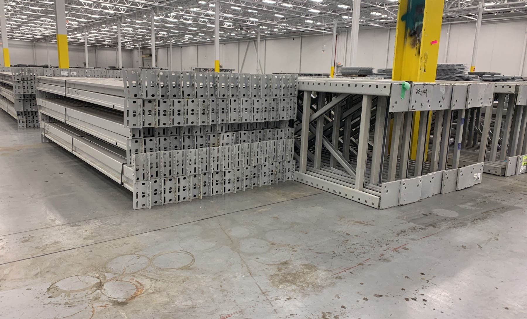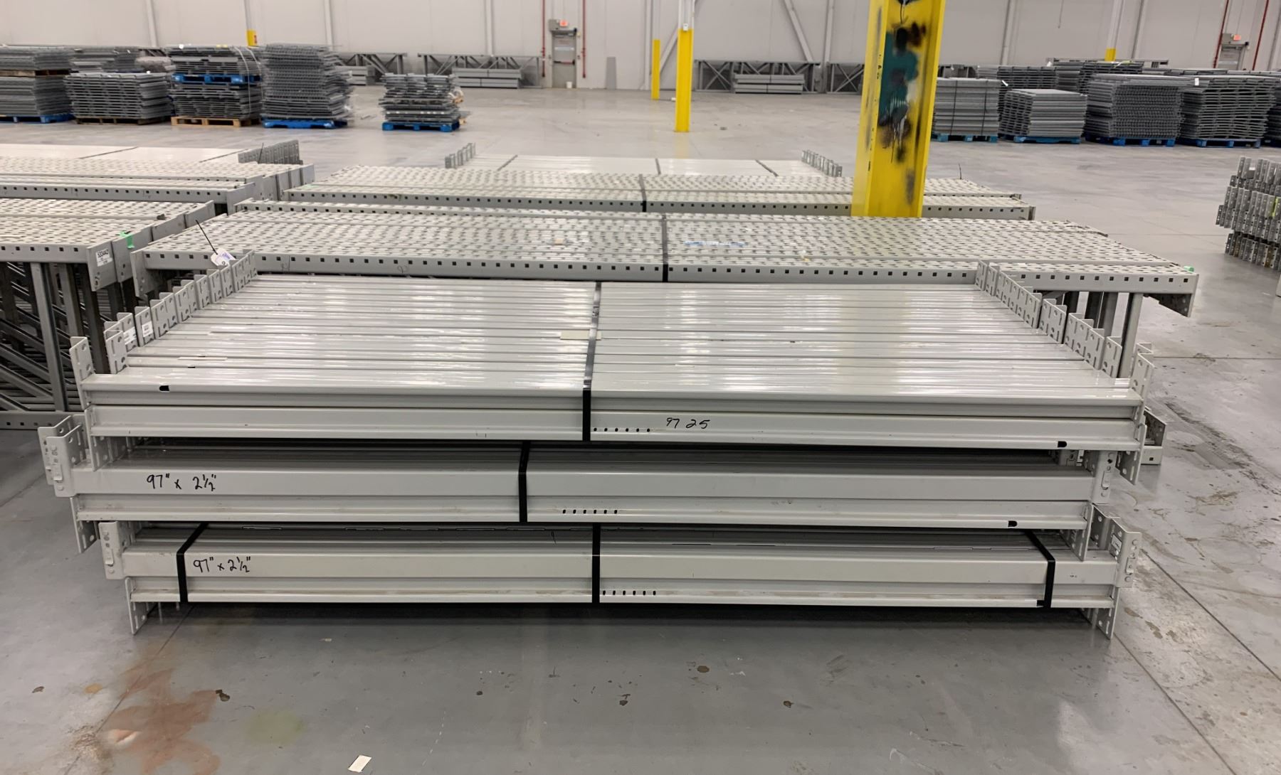 14 BAYS GREY INDUSTRIAL PALLET RACKING (15) UPRIGHTS 144" X 28" AND (90) SIDE BEAMS 97" X 2.5" WITH 8" X 6" WELDED FOOTPLATES 1/2" THICK